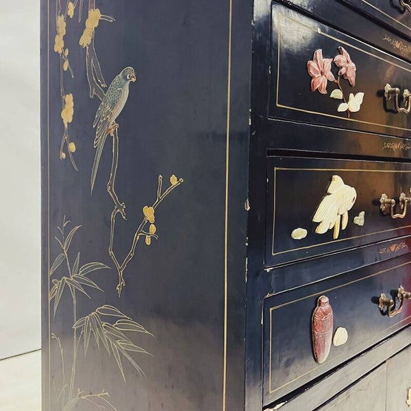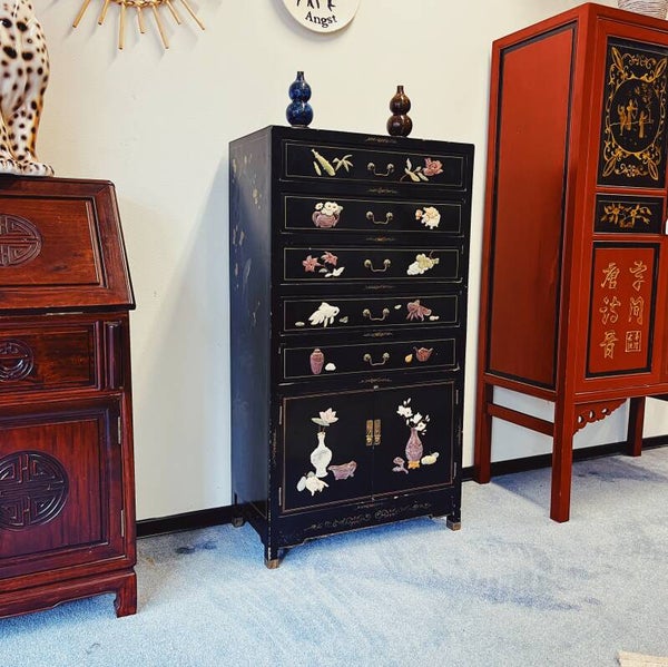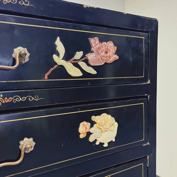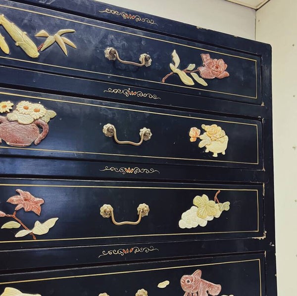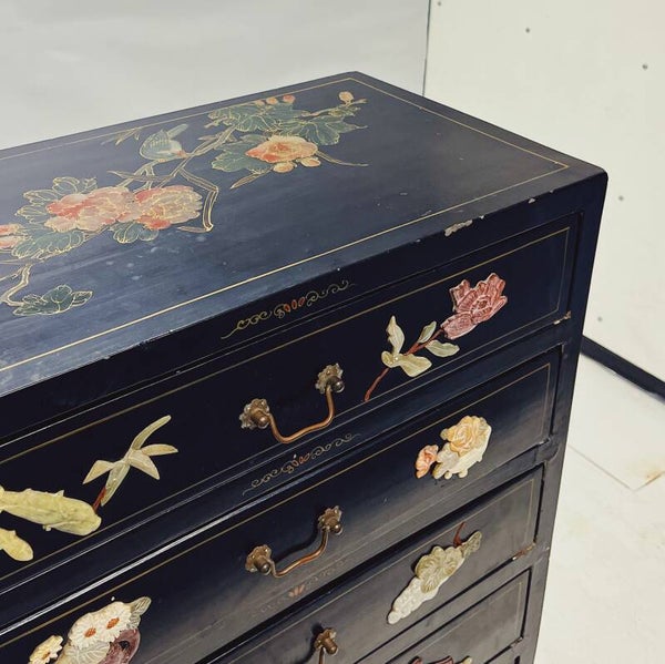 Chinese ladekast in zwarte matte lak, met spekstenen decoraties.
