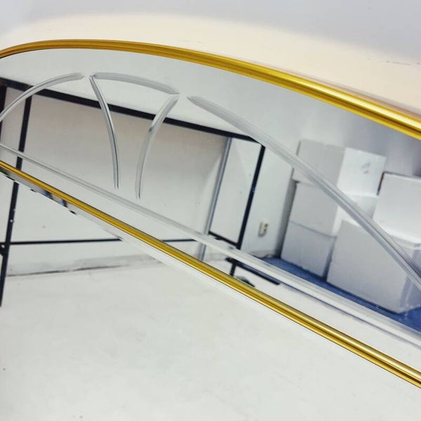 Deze spiegel in Hollywood Regency-stijl is een elegant accessoire voor elke ruimte. De spiegel heeft fraaie facetgeslepen details langs de randen, wat zorgt voor een verfijnde uitstraling. De gouden kunststof omlijsting voegt een luxueuze en glamoureuze touch toe, waardoor deze spiegel een statement maakt in elk interieur.