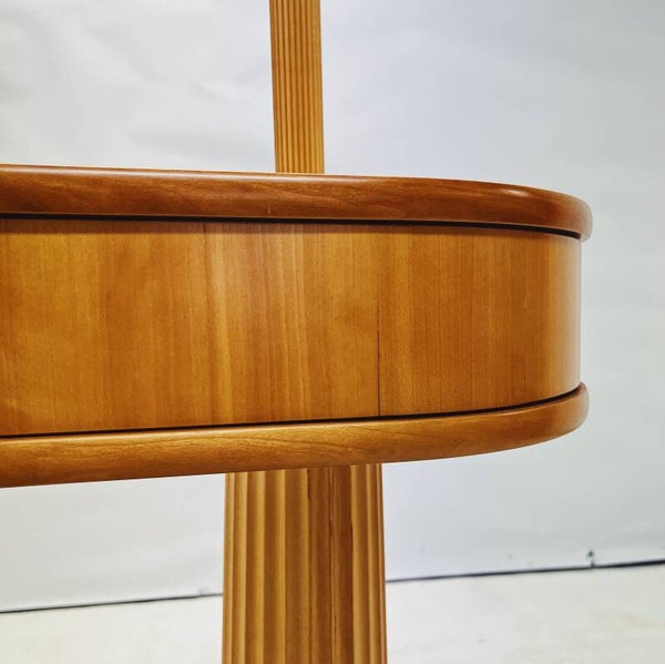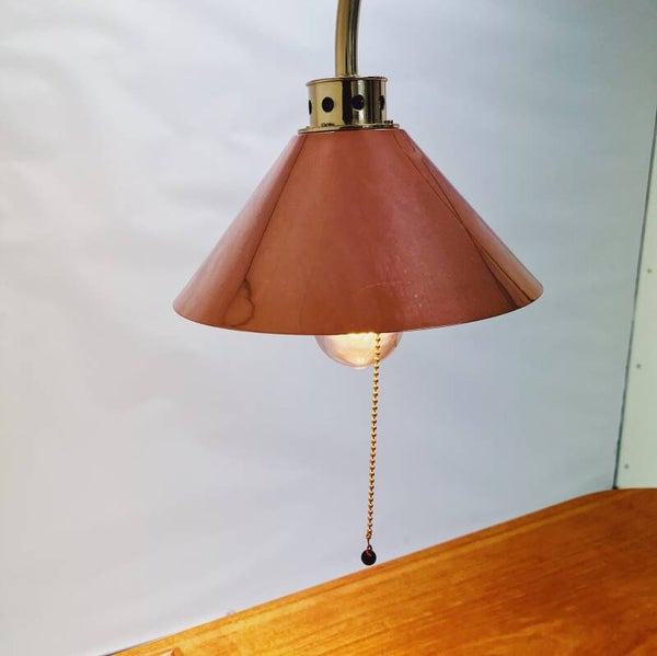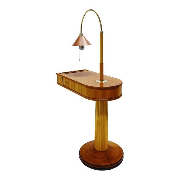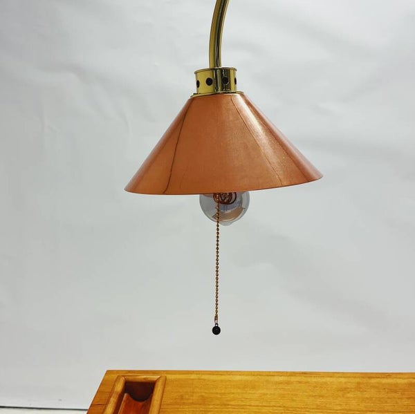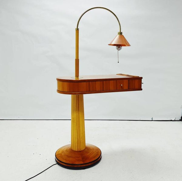 Het bureau valt op door zijn stijlvolle vormgeving, waaronder een gebogen lamp, een elegant metalen frame, en een geïntegreerde lade voor opbergruimte. Let op: het lampje werkt momenteel met een stekkerschakelaar, aangezien het originele trekkoordje niet functioneel is. De lamp was oorspronkelijk defect, maar deze is vervangen en werkt nu uitstekend.