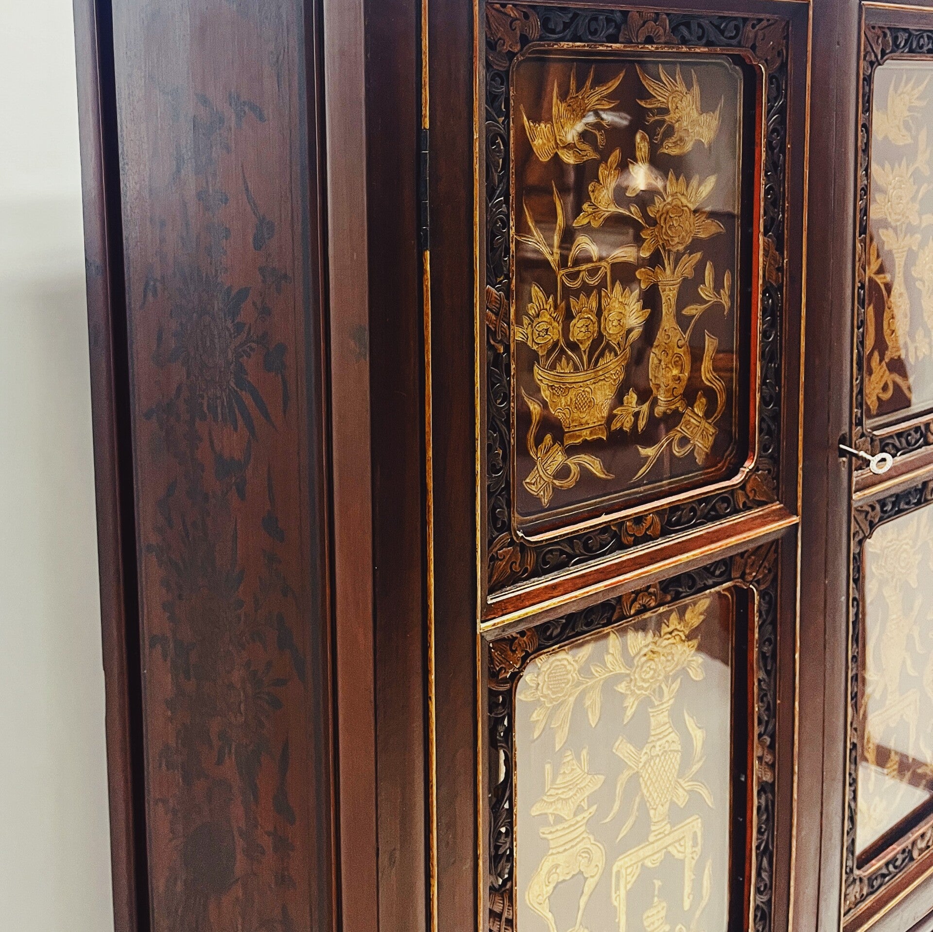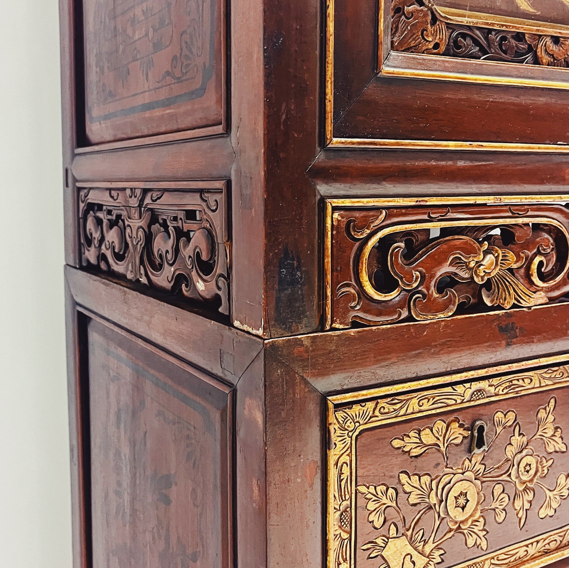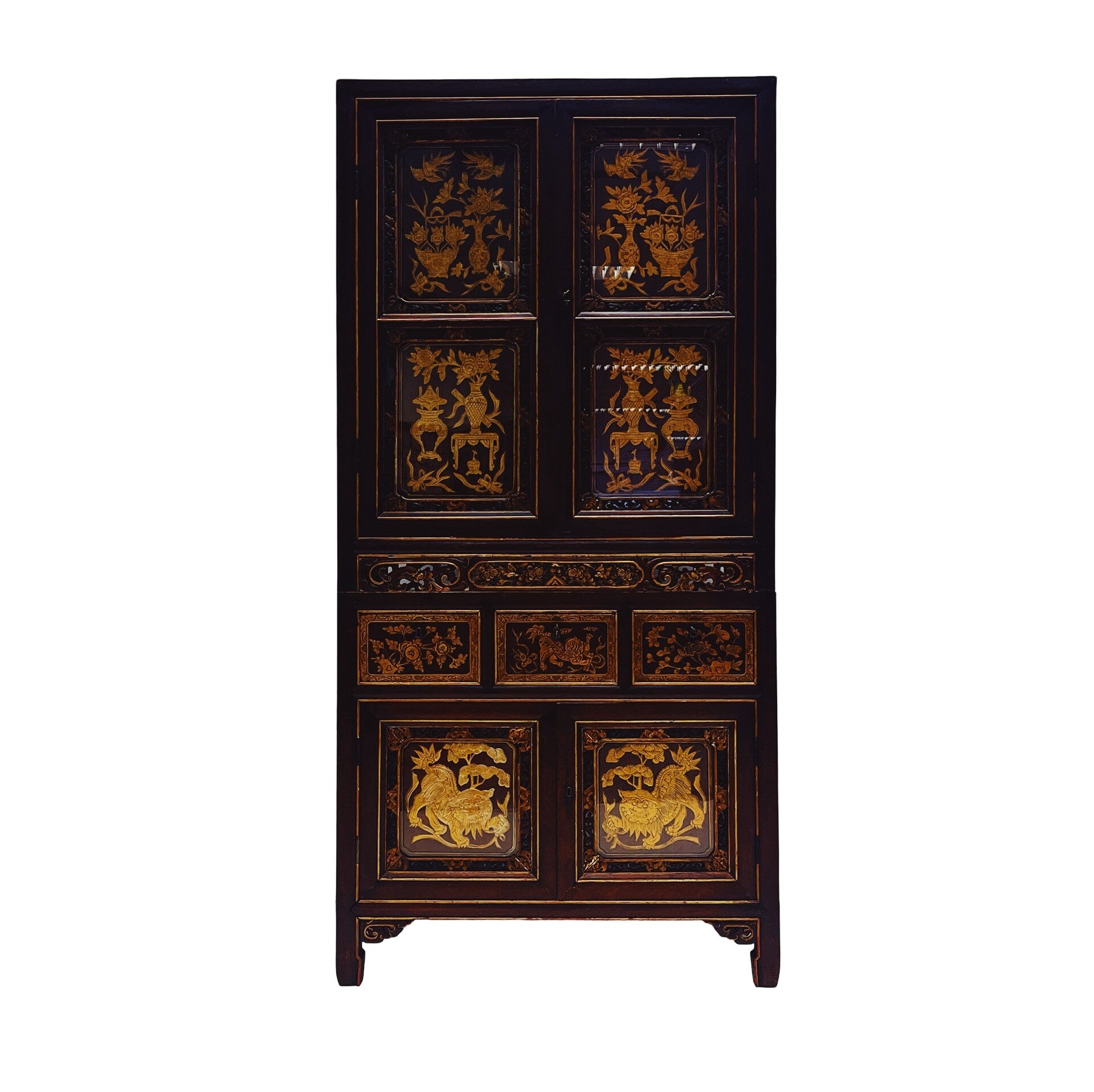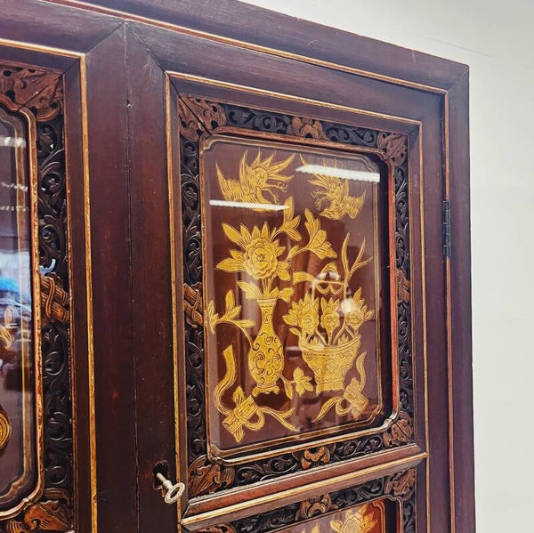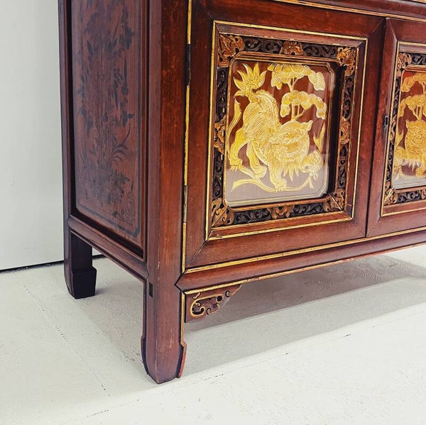 De boven- en onderdeuren zijn voorzien van uitschuifbare panelen van glas en hout. Hoewel de kast enkele gebruikssporen vertoont, maakt zijn diepe rode kleur en de gouden decoraties – die in de Chinese traditie symbool staan voor rijkdom en status – dit meubelstuk zeer bijzonder.
