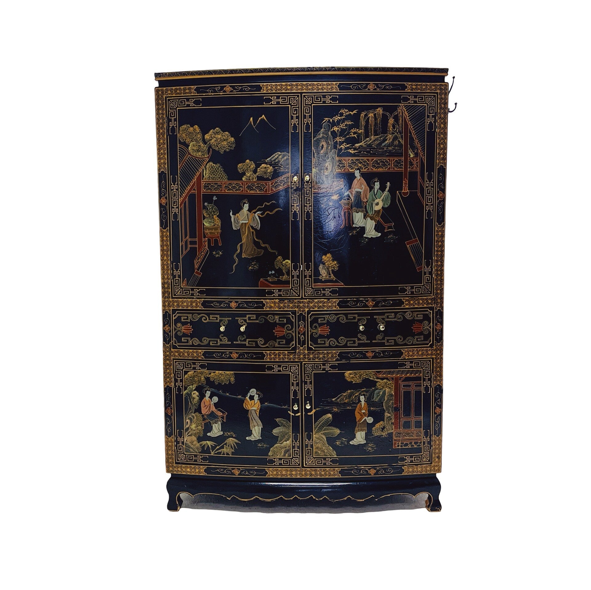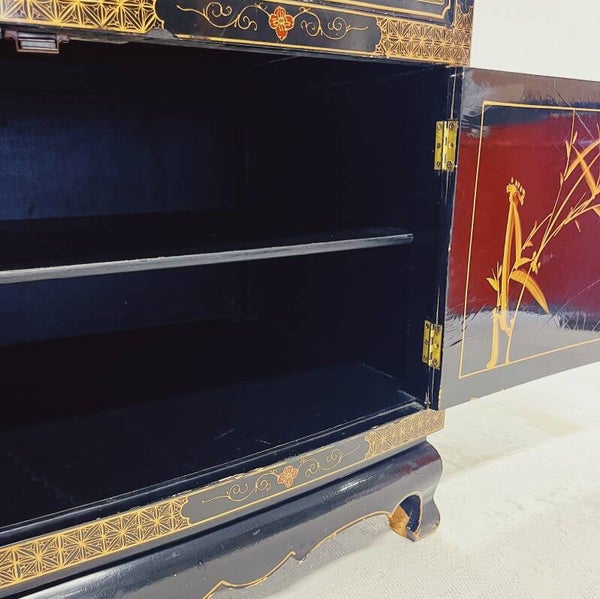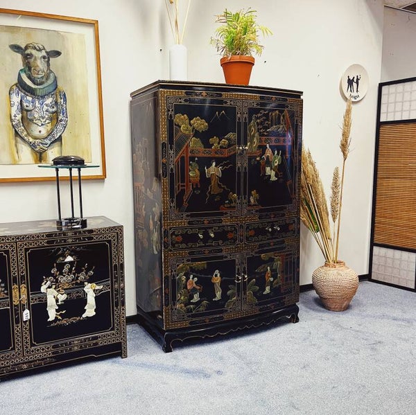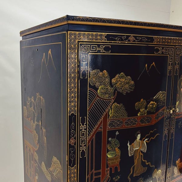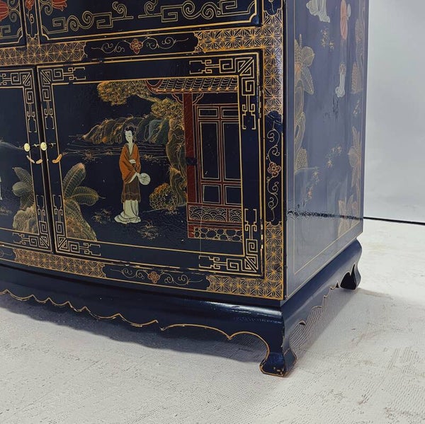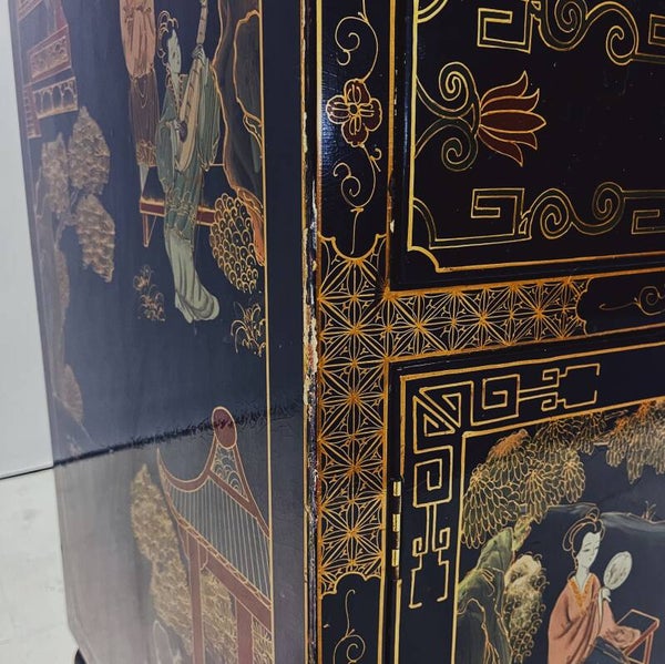 Deze Chinese bruidskast is een prachtig exemplaar dat esthetische waarde combineert met praktische opbergruimte. Het zwarte lakwerk vormt de perfecte achtergrond voor de handgeschilderde taferelen, die in diverse kleuren zijn uitgevoerd en een levendig en cultureel rijk decor bieden. De kast is een ware blikvanger in elke kamer, met een combinatie van verfijning en functionaliteit.