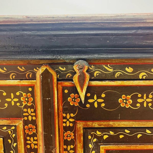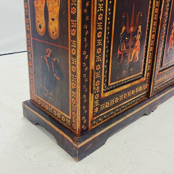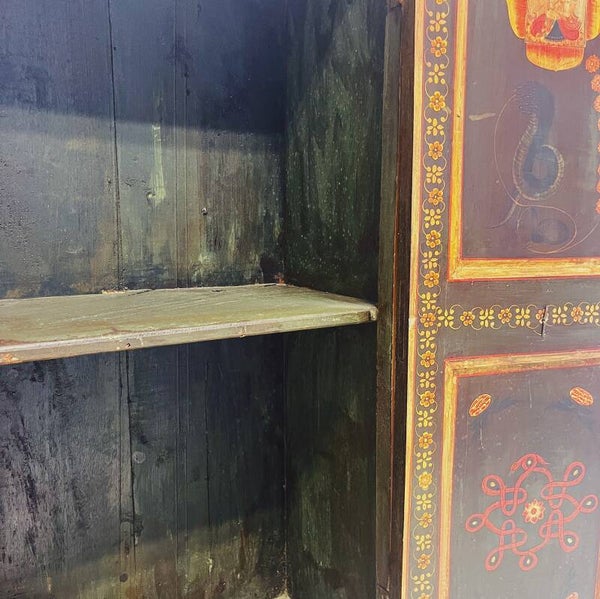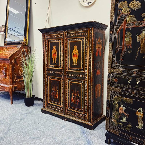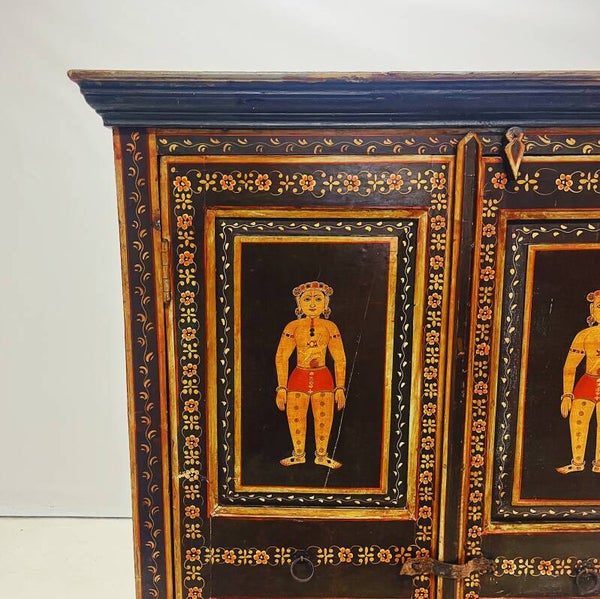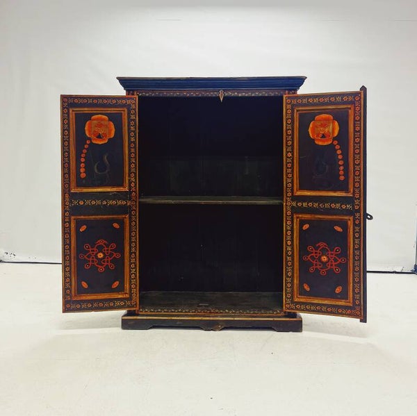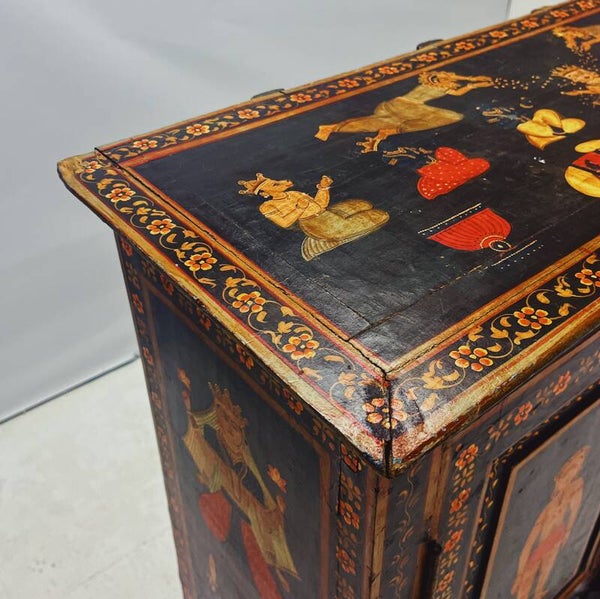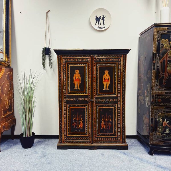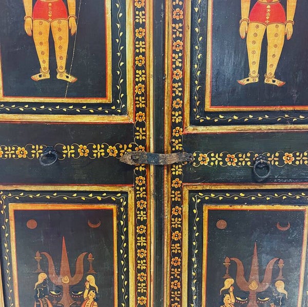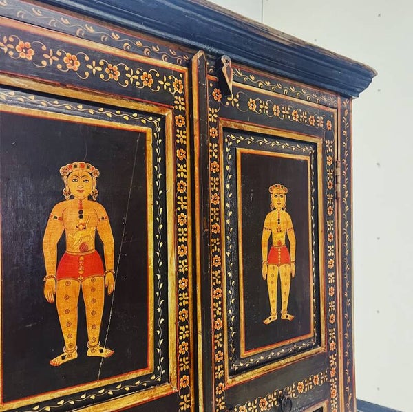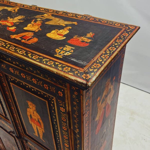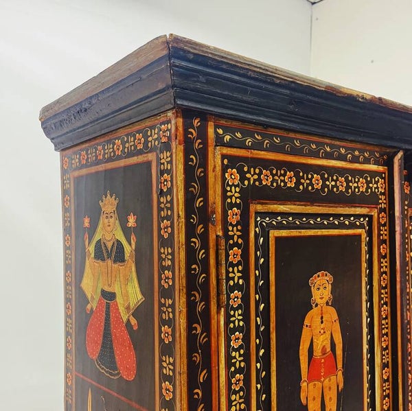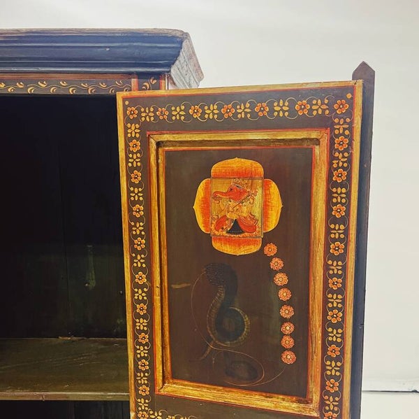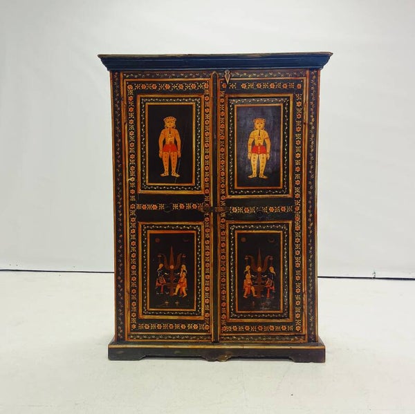 Handbeschilderd Indiaas kastje. Het kastje is versierd met levendige afbeeldingen van mensen en planten, uitgevoerd in felle, opvallende kleuren die het een speelse en warme uitstraling geven. Binnenin is het kastje voorzien van een handige plank, wat het niet alleen mooi, maar ook praktisch maakt voor het opbergen van kleine items.
