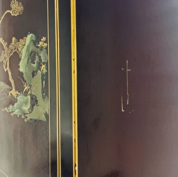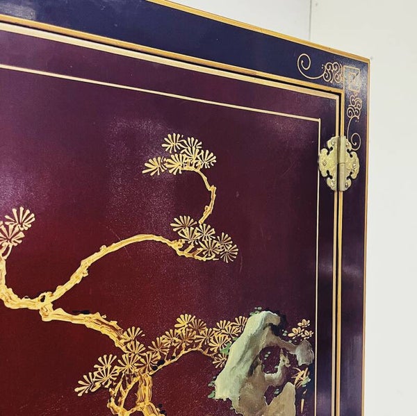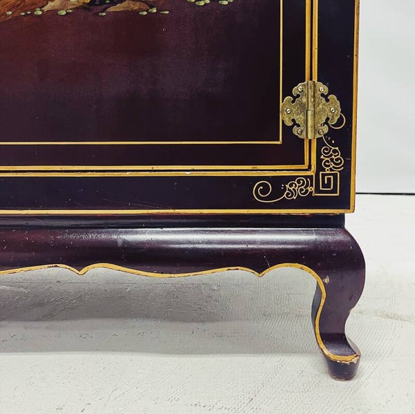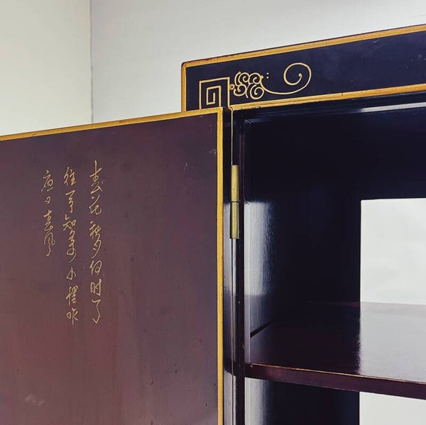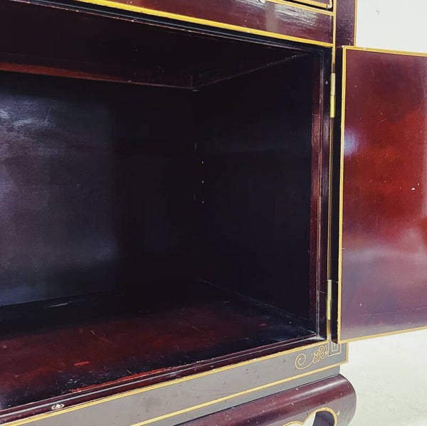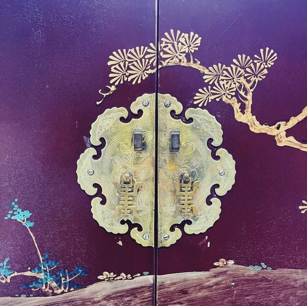 De kast heeft een prachtige bordeauxrode gelakte achtergrond en is versierd met handgeschilderde decoraties, wat de rijke Chinese ambachtelijke traditie weerspiegelt. Het traditionele hang-en-sluitwerk voegt een authentieke touch toe, hoewel de pinnetjes ontbreken, wat het meubel nog meer karakter geeft.
