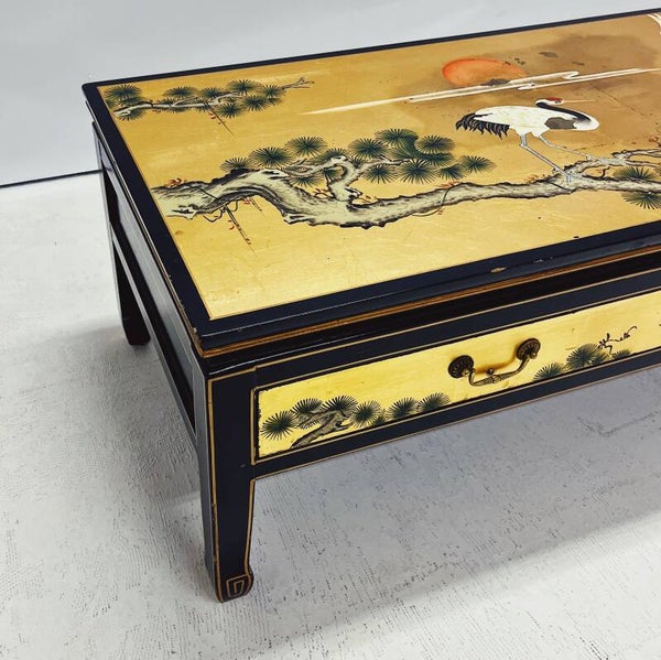 Deze unieke gouden Chinese salontafel is een bijzonder meubelstuk, gemerkt aan de onderkant voor extra authenticiteit. Het tafeltje is afgewerkt met een luxe gouden lak en versierd met prachtige plant- en vogeldecoraties, die het traditionele Chinese ontwerp tot leven brengen.