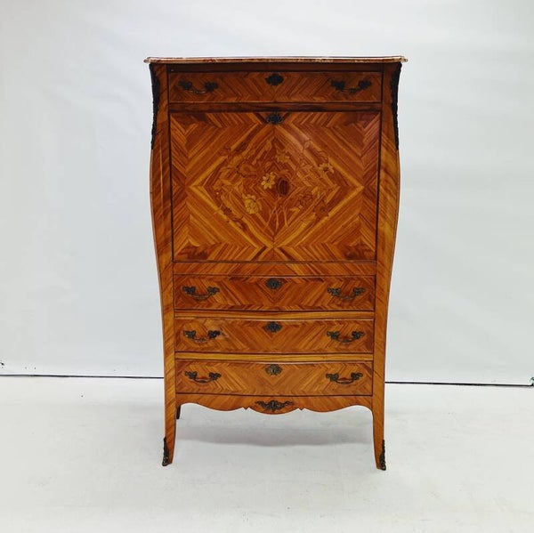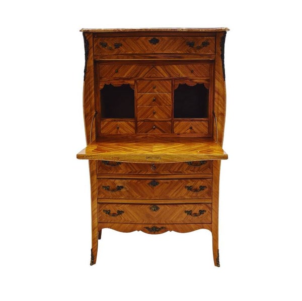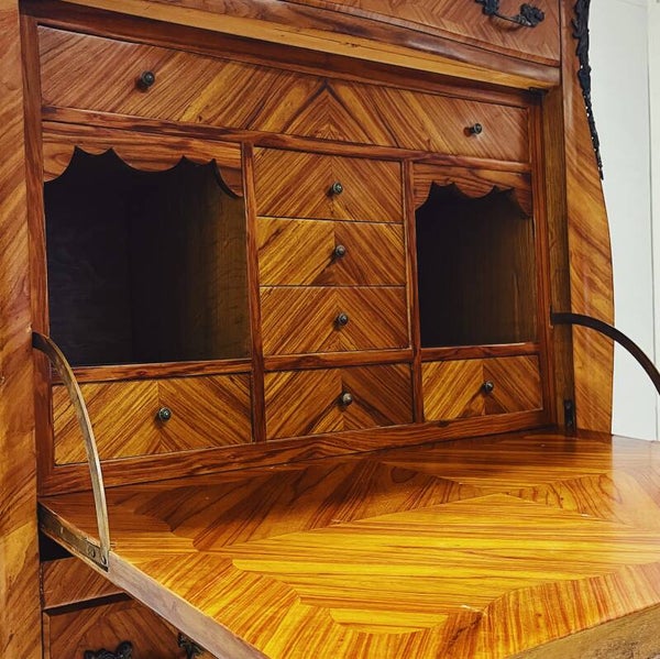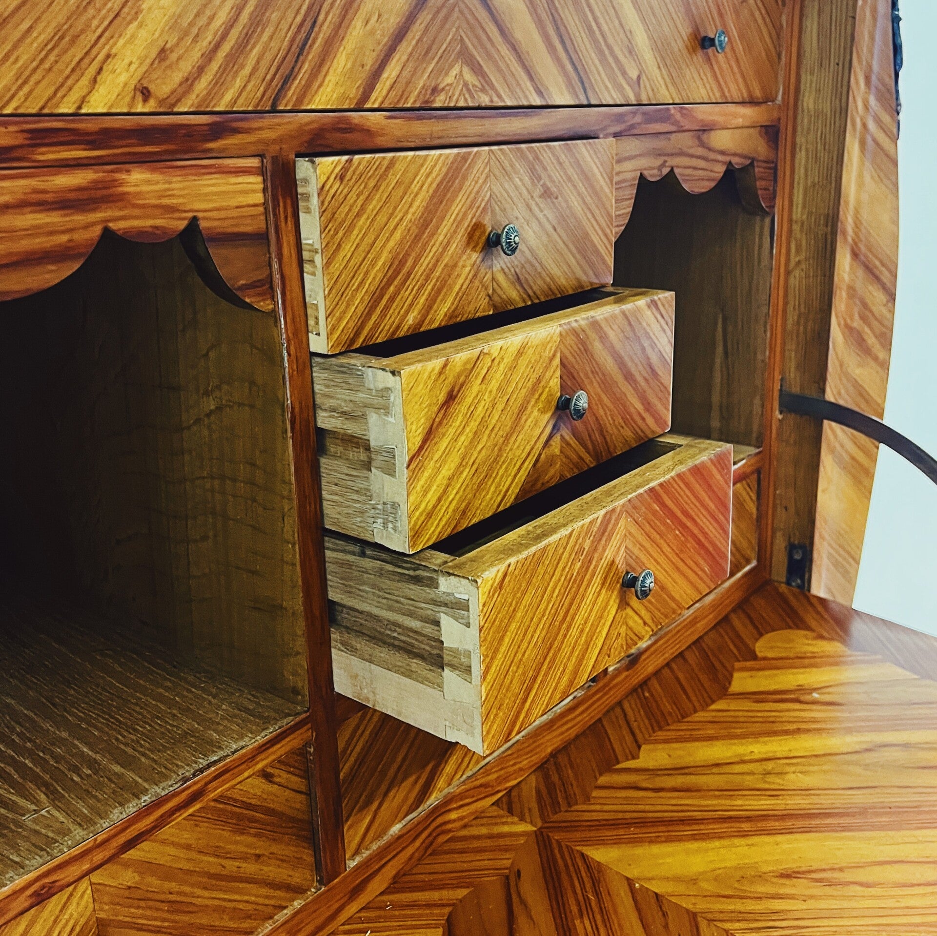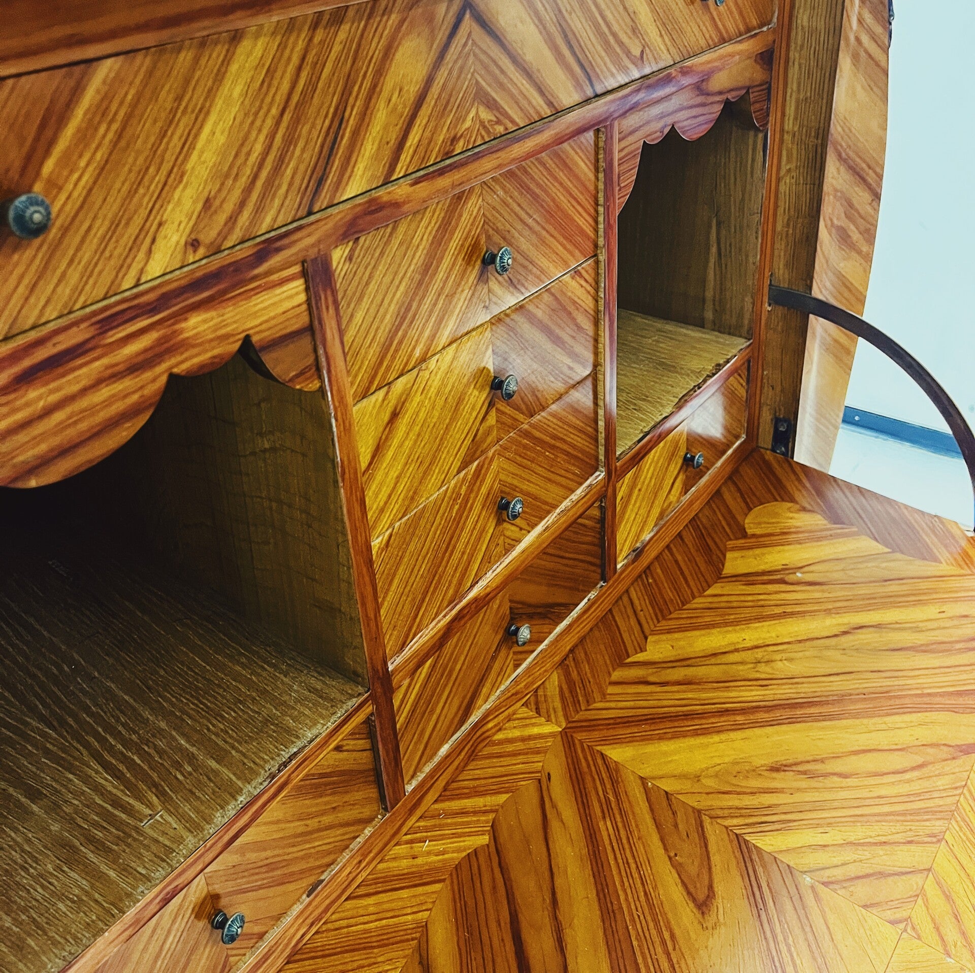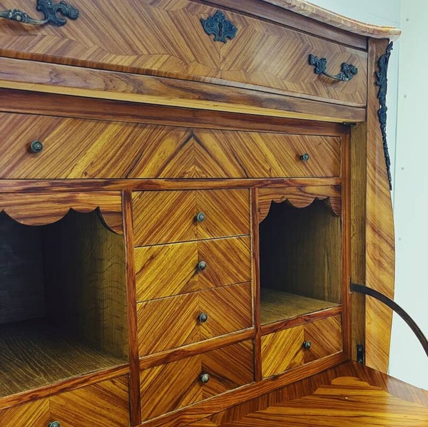 Naast zijn decoratieve waarde biedt de kast praktische functionaliteit. Met zijn vele laden en opbergvakken biedt deze secretaire volop ruimte voor het ordenen van documenten, brieven of andere persoonlijke spullen. Het klapbare werkblad maakt de kast een multifunctioneel meubel: niet alleen een stijlvol object, maar ook een handig werkmeubel.