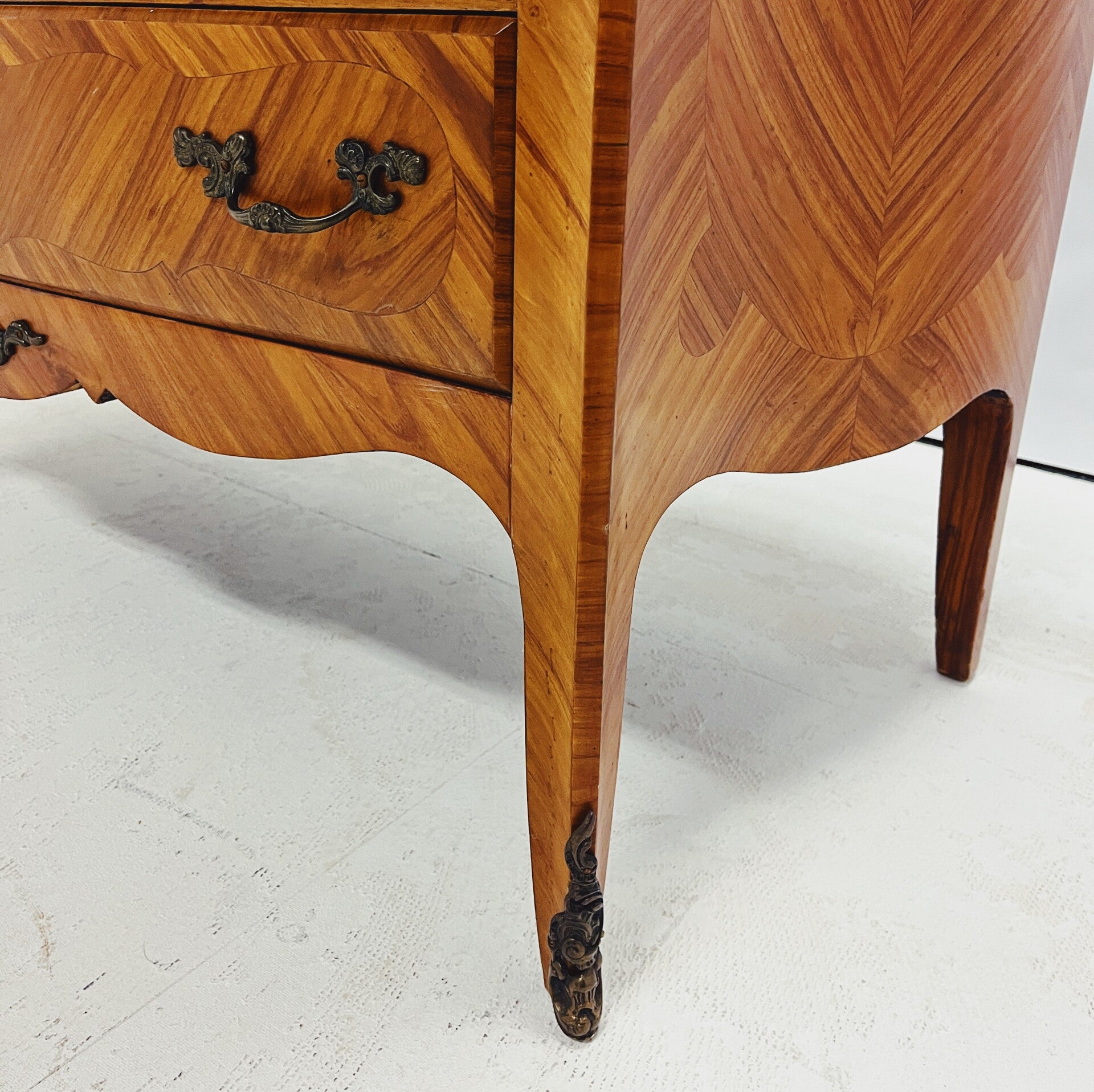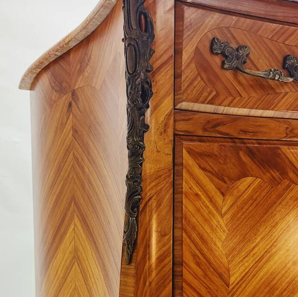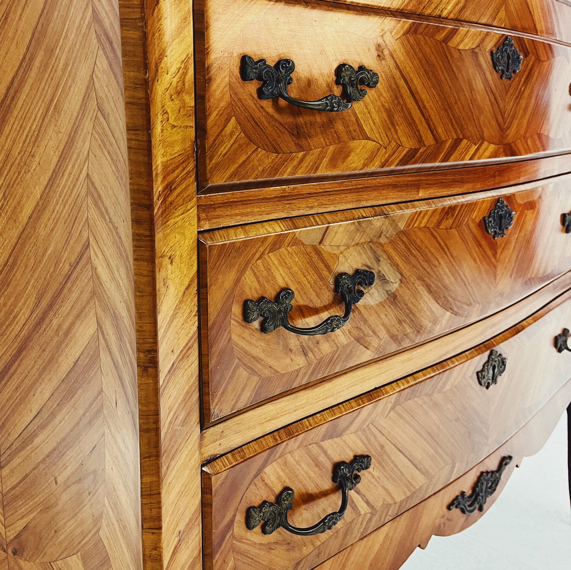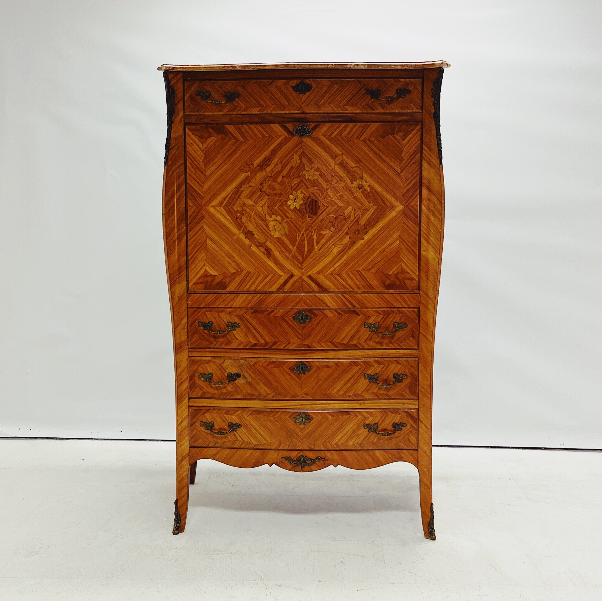 Naast zijn decoratieve waarde biedt de kast praktische functionaliteit. Met zijn vele laden en opbergvakken biedt deze secretaire volop ruimte voor het ordenen van documenten, brieven of andere persoonlijke spullen. Het klapbare werkblad maakt de kast een multifunctioneel meubel: niet alleen een stijlvol object, maar ook een handig werkmeubel.
