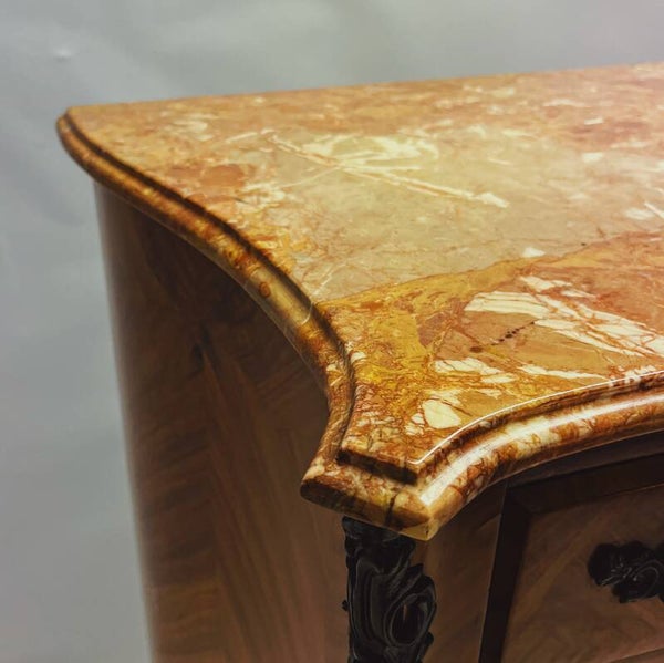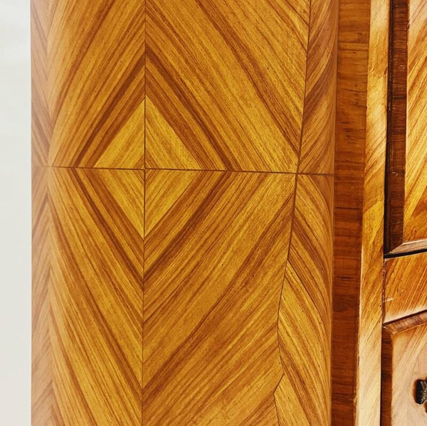 Deze antieke secretaire kast is een prachtig voorbeeld van vakmanschap, vervaardigd uit fineer met notenhout en afgewerkt met een verfijnd vissengraatpatroon. Dit patroon is typisch voor hofwaardig fineerwerk, wat het meubel een luxe uitstraling geeft, vergelijkbaar met klassieke antieke meubels.