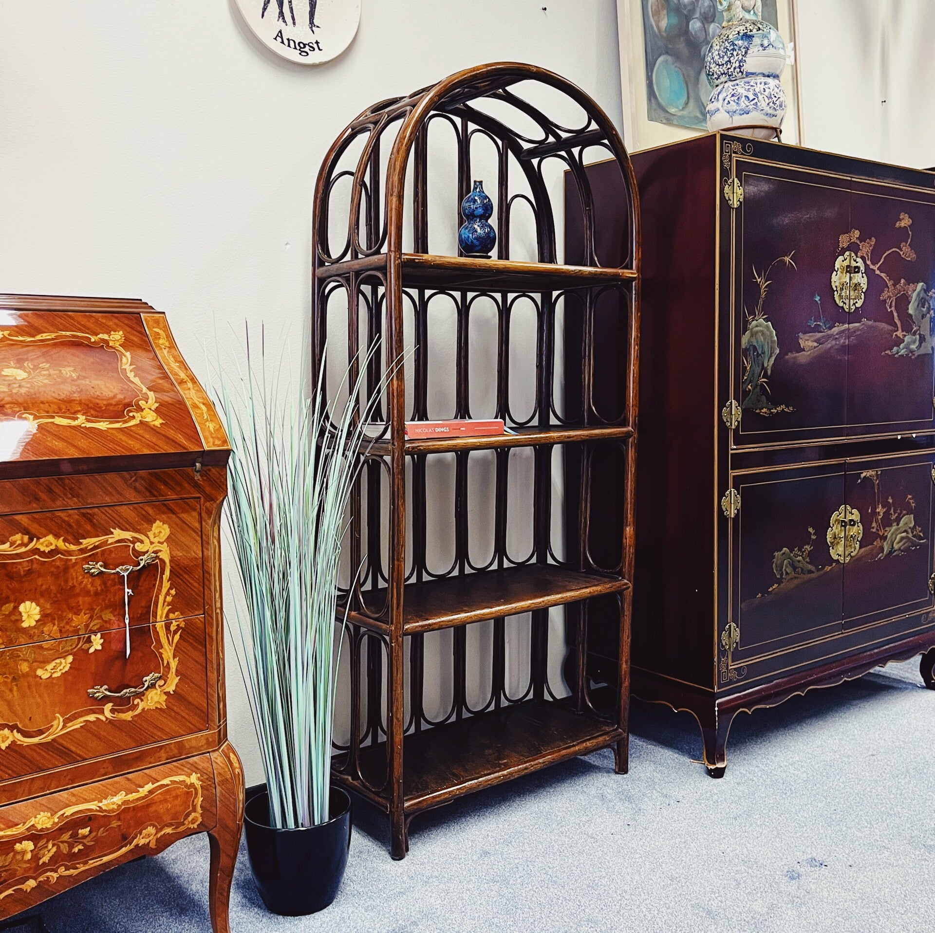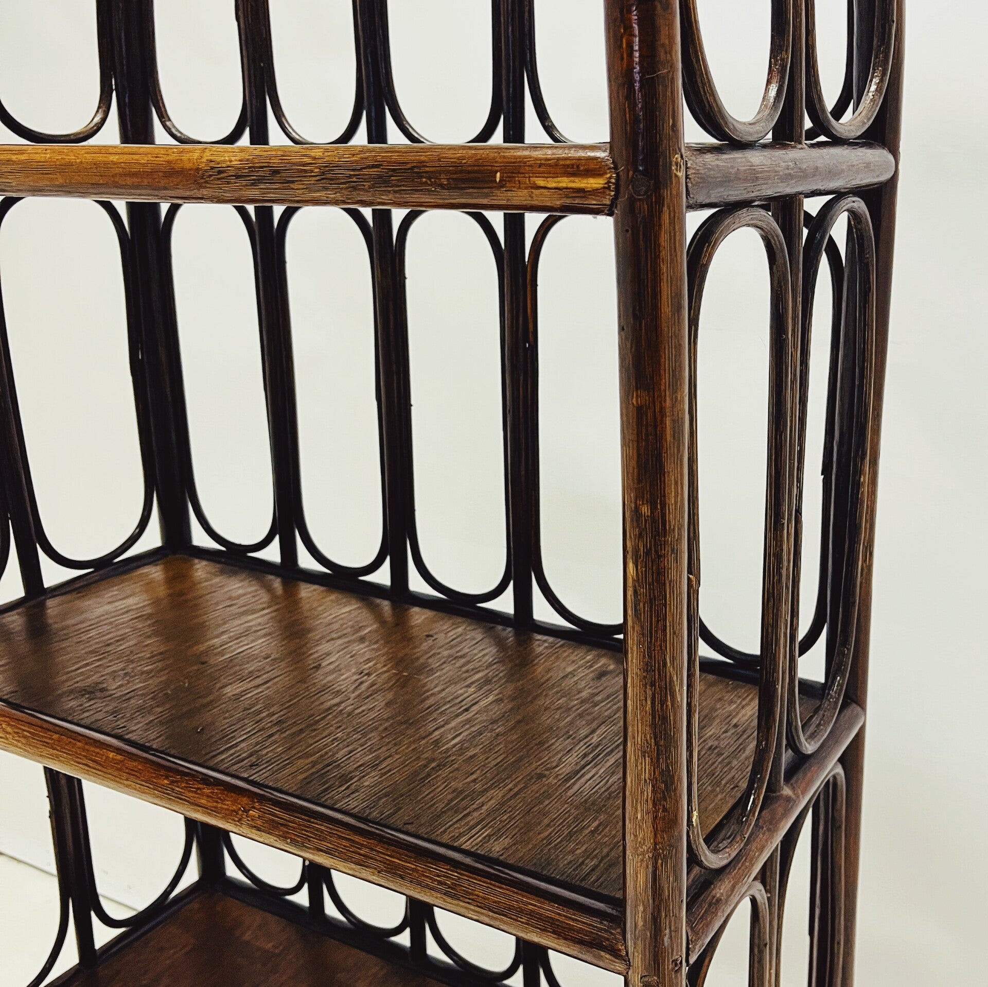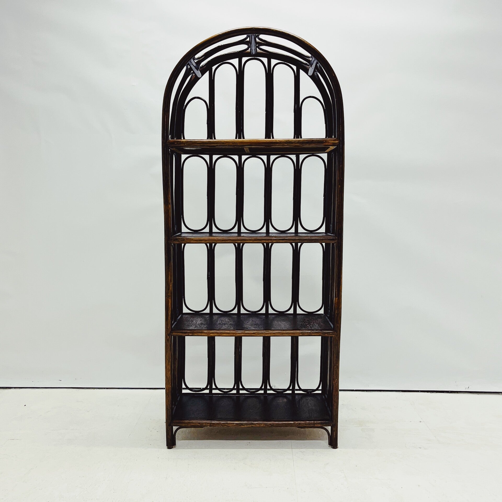 Vintage rotan boogkast met vier plateaus, gemaakt van natuurlijk rotan – een duurzaam materiaal afkomstig van de palmplant. De kast vertoont enkele gebruikssporen passend bij de leeftijd, wat bijdraagt aan het authentieke karakter.