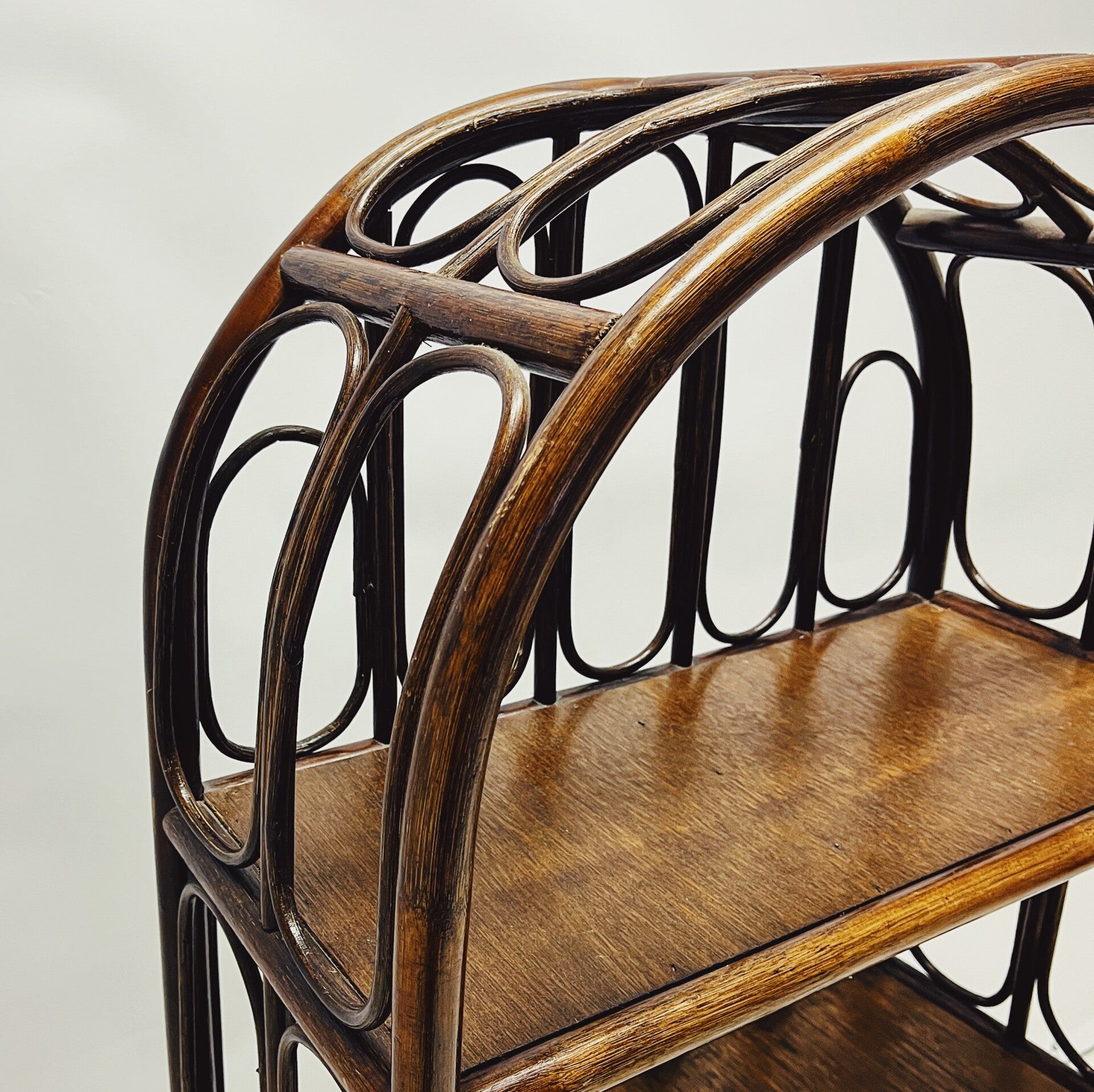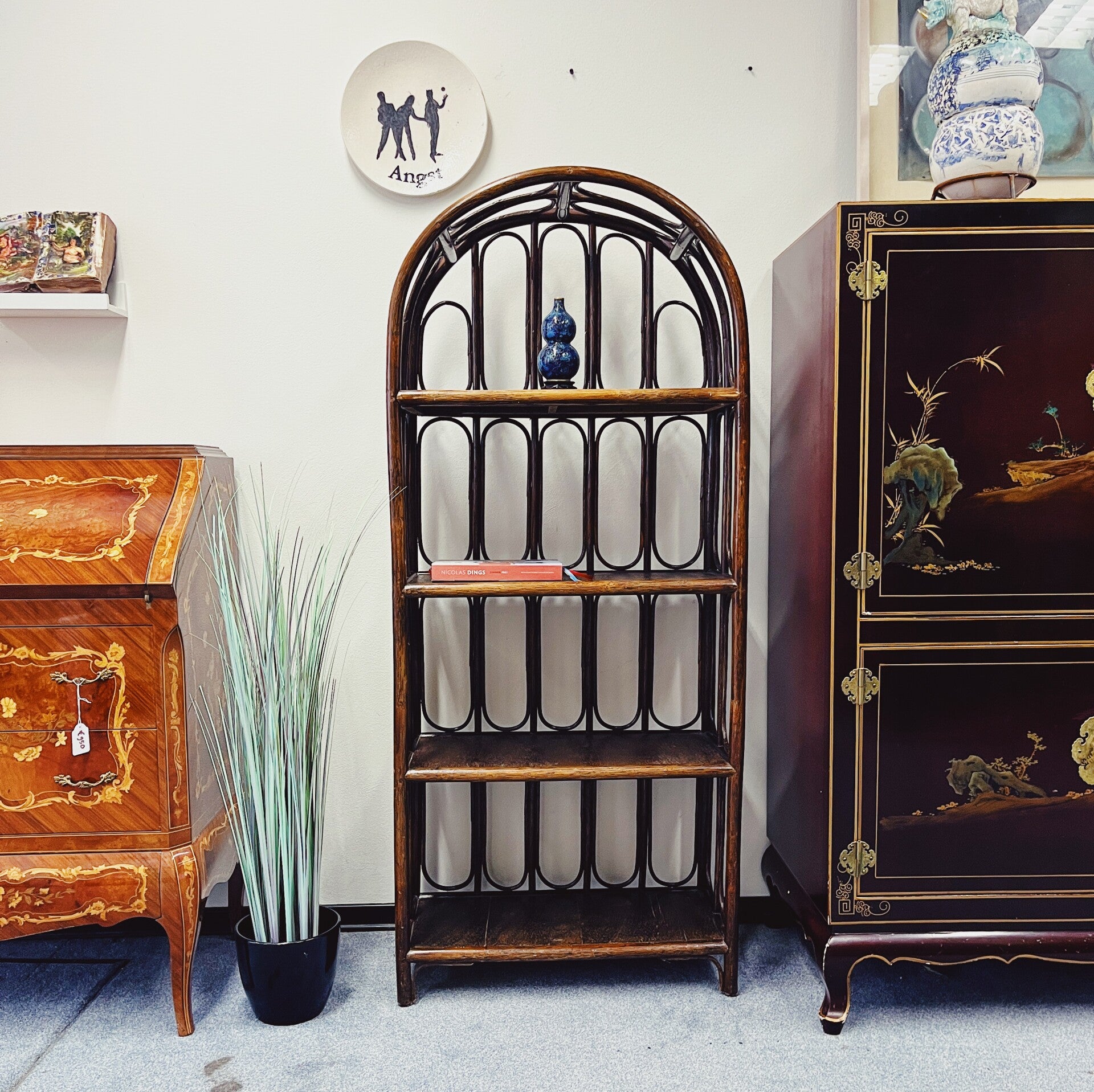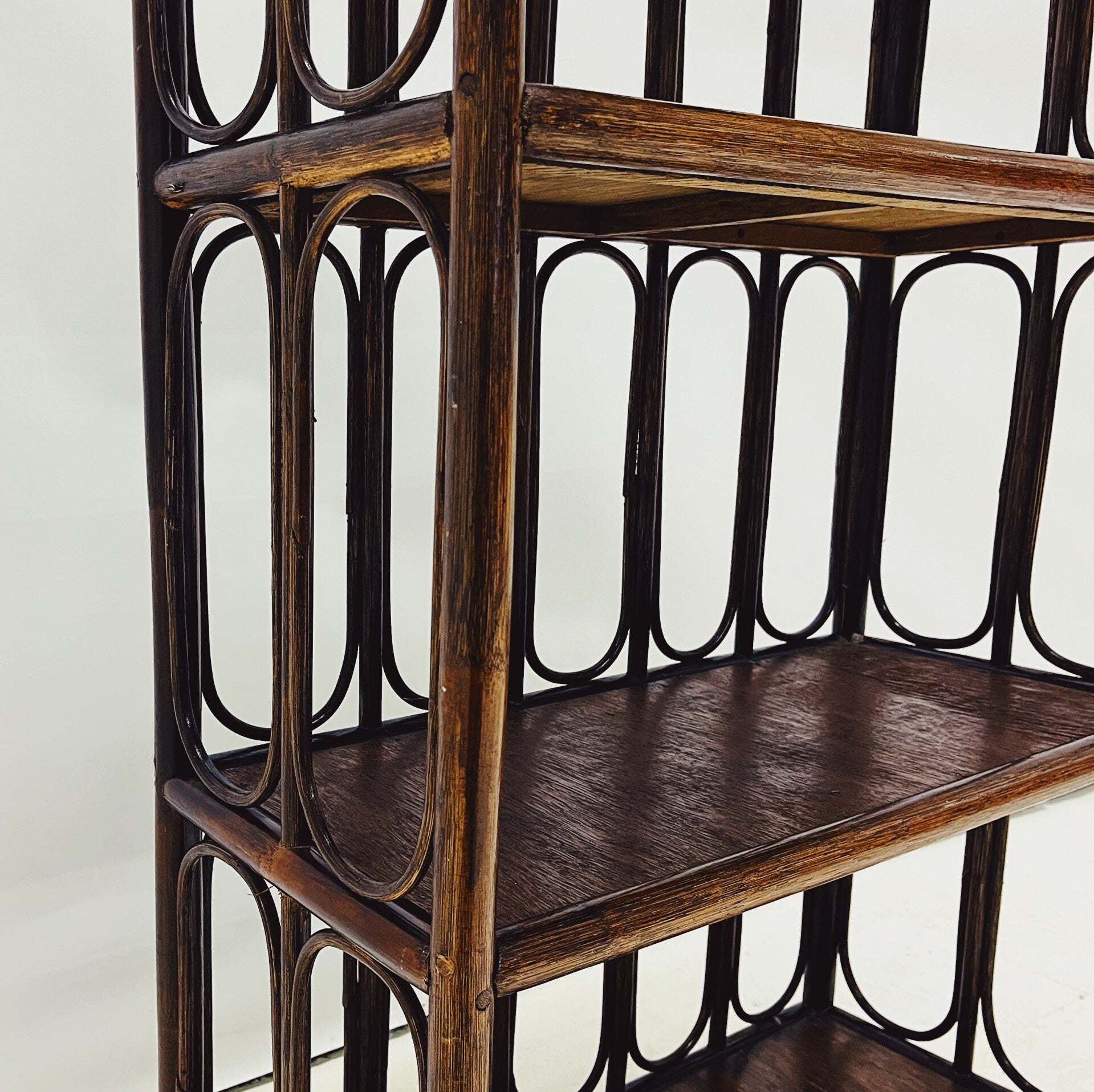 Vintage rotan boogkast met vier plateaus, gemaakt van natuurlijk rotan – een duurzaam materiaal afkomstig van de palmplant. De kast vertoont enkele gebruikssporen passend bij de leeftijd, wat bijdraagt aan het authentieke karakter.