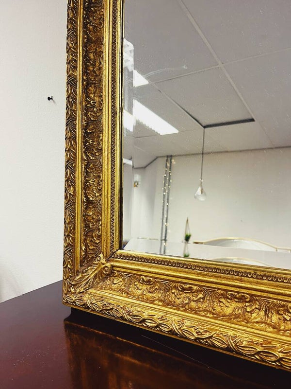 Deze gouden facet geslepen barok spiegel is een prachtig voorbeeld van klassieke barokstijl. Het houten frame heeft een gedetailleerd ontwerp dat perfect past bij de rijke uitstraling van de spiegel. De facetslijping zorgt voor een subtiele schittering, waardoor het meubelstuk een luxe en verfijnde uitstraling heeft.
