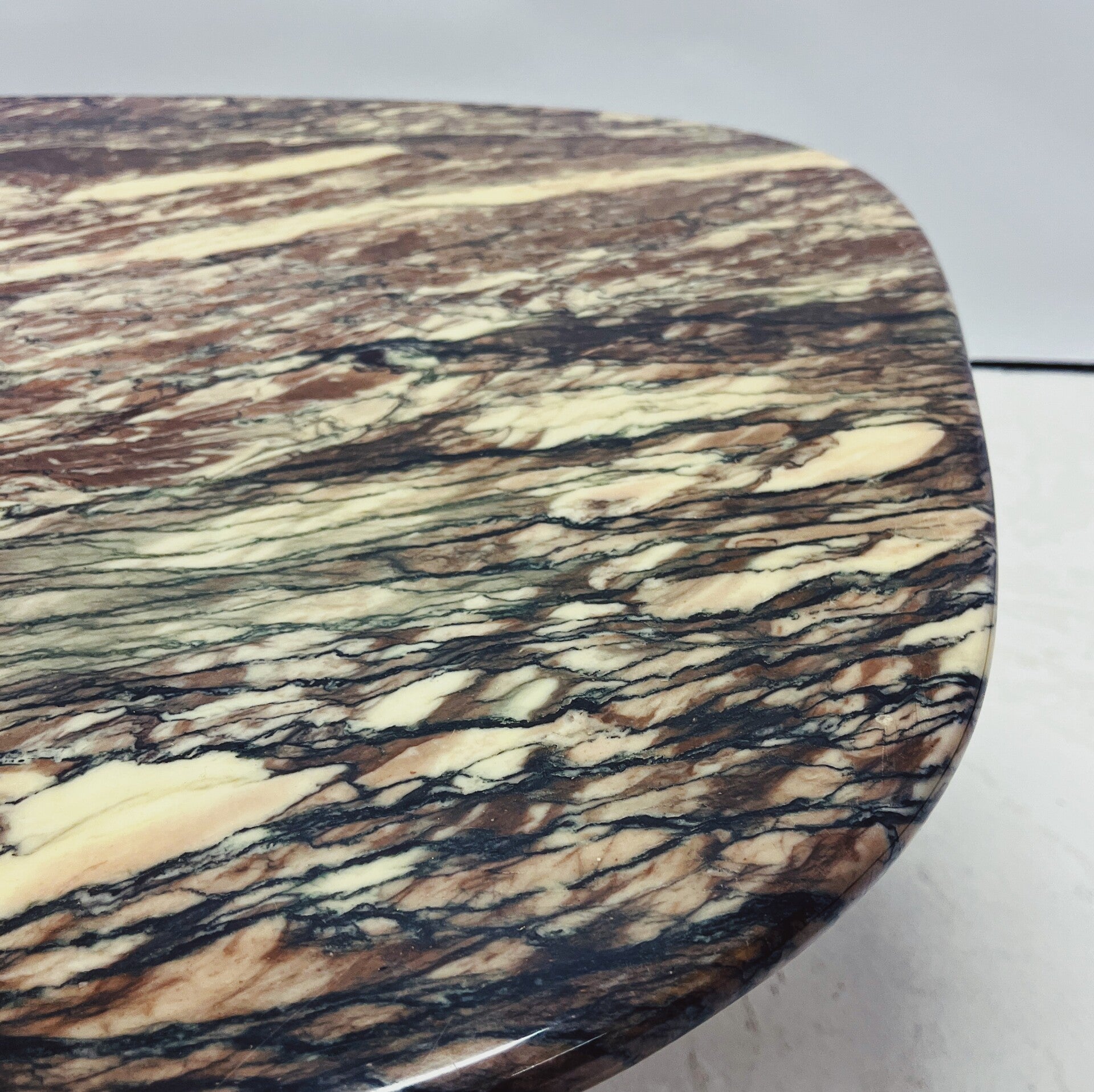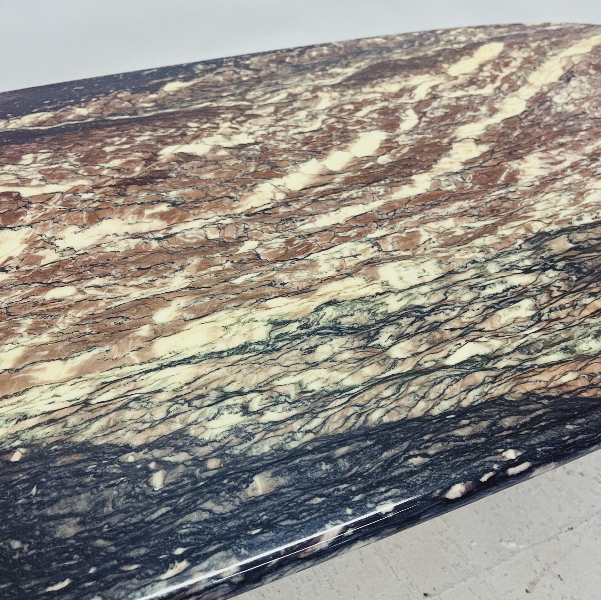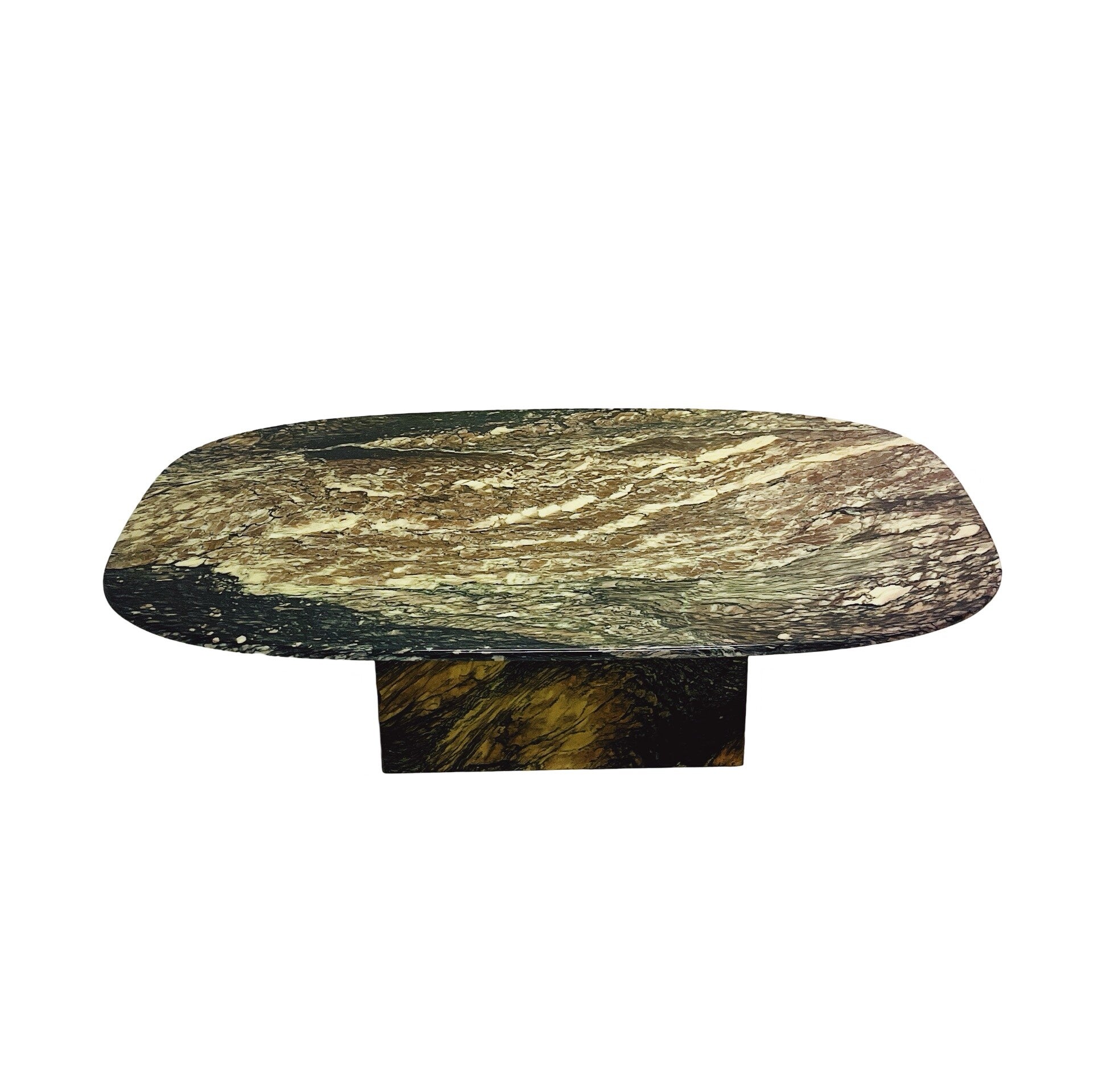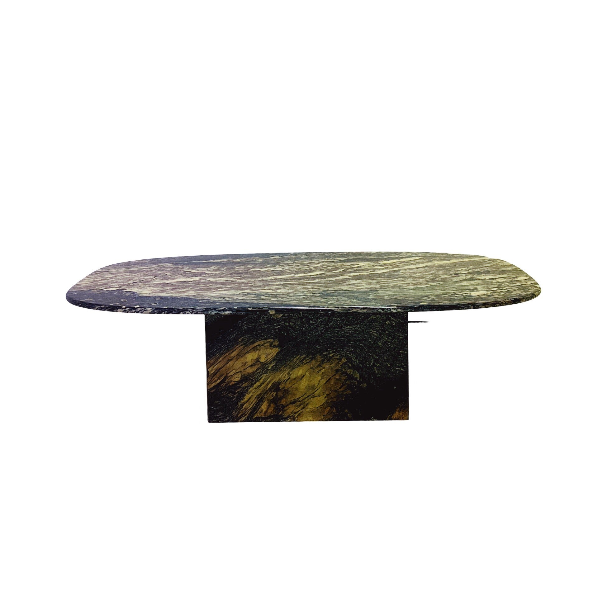 Deze prachtige marmeren salontafel is een unieke vondst dankzij het bijzondere patroon van de aderen in verschillende tinten, met groen als hoofdkleur. De royale, langwerpige vorm met afgeronde hoeken geeft de tafel een elegante en tijdloze uitstraling, waardoor hij perfect past in diverse interieurstijlen, van klassiek tot modern.