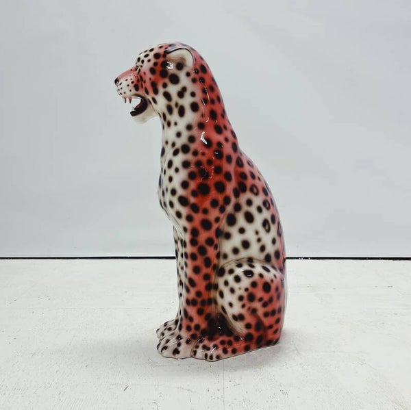 Uniek, handgemaakt luipaardbeeld in een roze kleur. Dit Hollywood Regency-beeld, vervaardigd uit met de hand beschilderd keramiek en gemaakt in Italië, voegt ongetwijfeld een verbluffende en stoere uitstraling toe aan je interieur!
