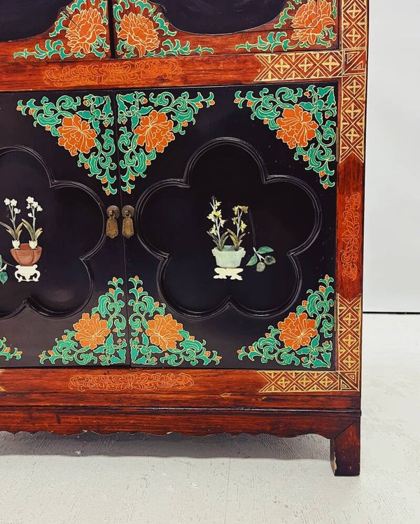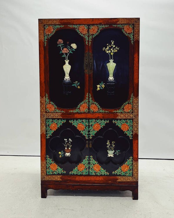 Deze Chinese kast is prachtig gedecoreerd met handbeschilderde details, verfijnd houtsnijwerk en speksteen inleg. Het compacte formaat maakt de kast veelzijdig in gebruik, terwijl hij zowel boven als onder opbergruimte biedt.