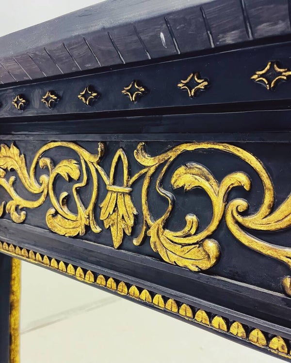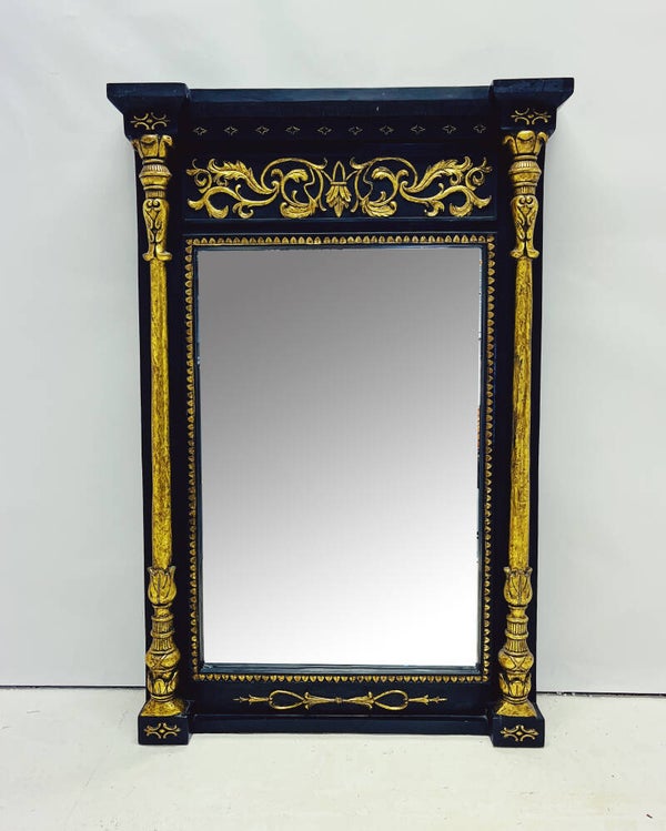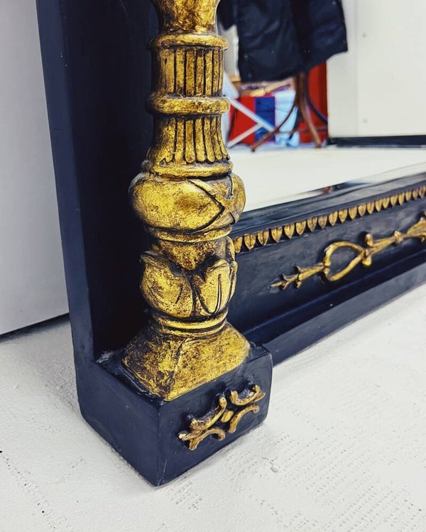 Deze prachtige vintage spiegel is een echte blikvanger in elk interieur. Vervaardigd uit gips, met een stijlvolle zwarte achtergrond en verfijnde gouden versieringen en ornamenten. De spiegel is voorzien van een stevig en handig ophangsysteem, waardoor hij zowel perfect op een schouw als aan de muur bevestigd kan worden.