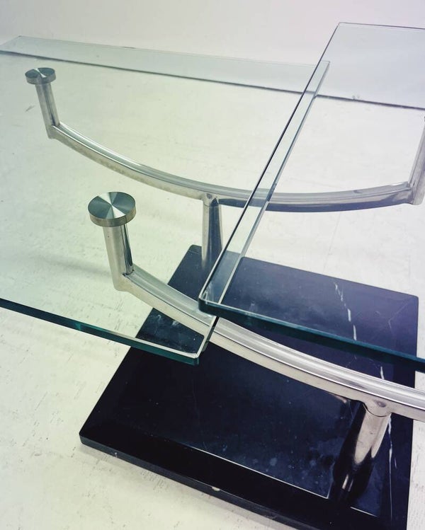 Deze vintage glazen salontafel in Deens design heeft twee niveaus en combineert een glazen blad, een granieten marmeren onderstel en een verchroomd metalen frame. De twee glazen bladen zijn verstelbaar en kunnen op verschillende manieren worden gedraaid, wat zorgt voor veelzijdigheid in gebruik en design.