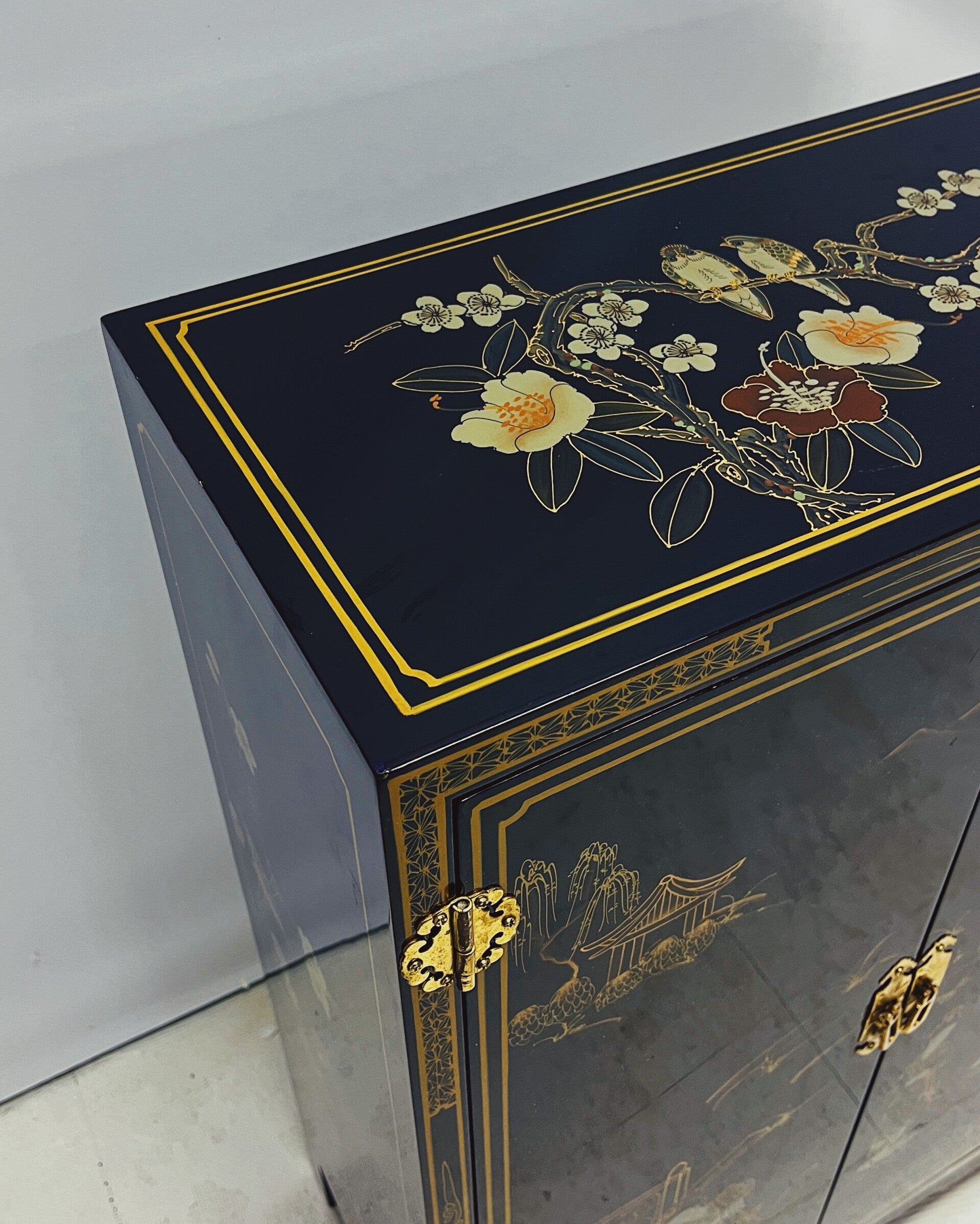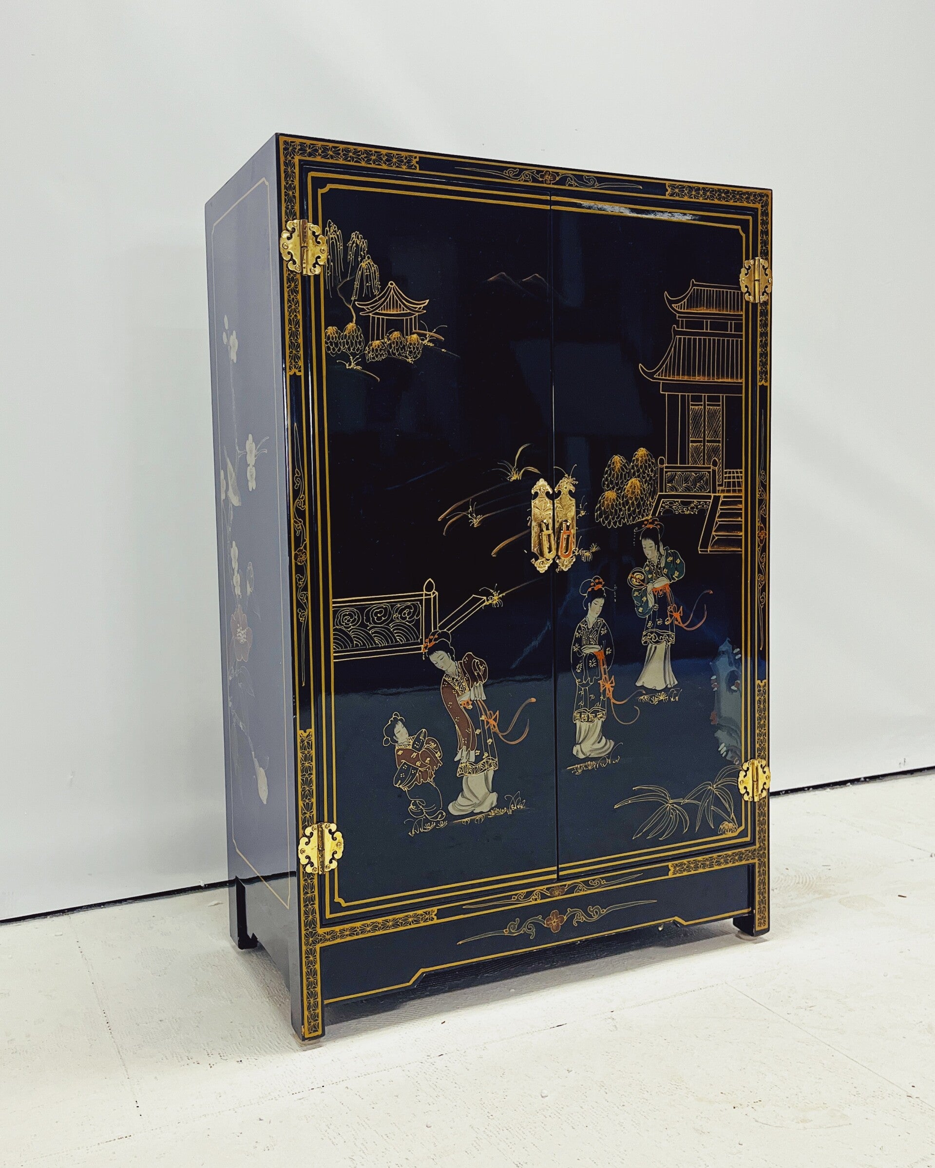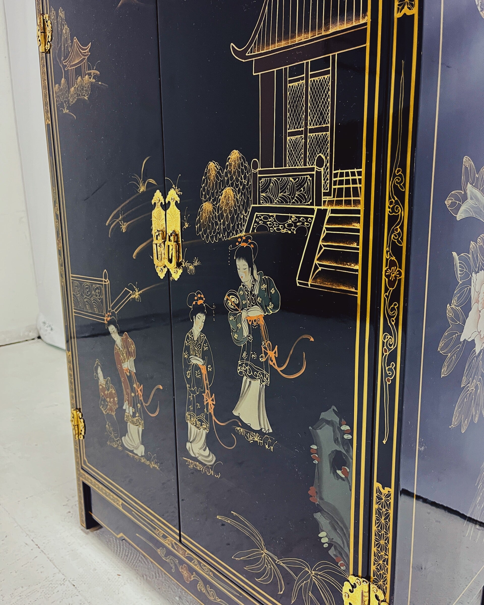 Chinees wandkastje in zwart hoogglanslak. Het is uitgevoerd in stijlvol zwart hoogglanslak en verfraaid met met de hand geschilderde decoraties die menselijke taferelen uitbeelden. Achter de twee deurtjes vind je een handig plankje voor extra opbergruimte. Het kastje heeft minimale gebruikssporen.