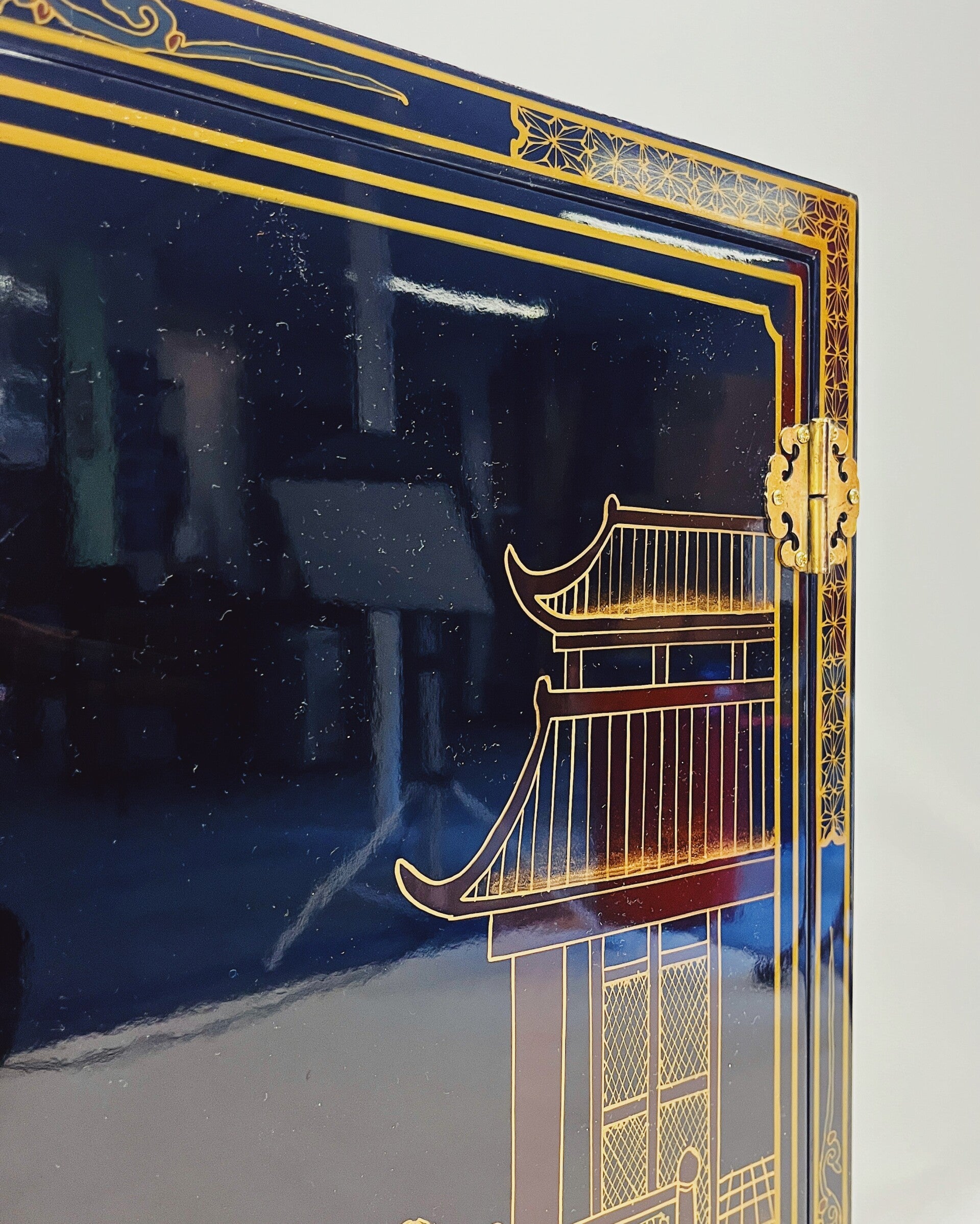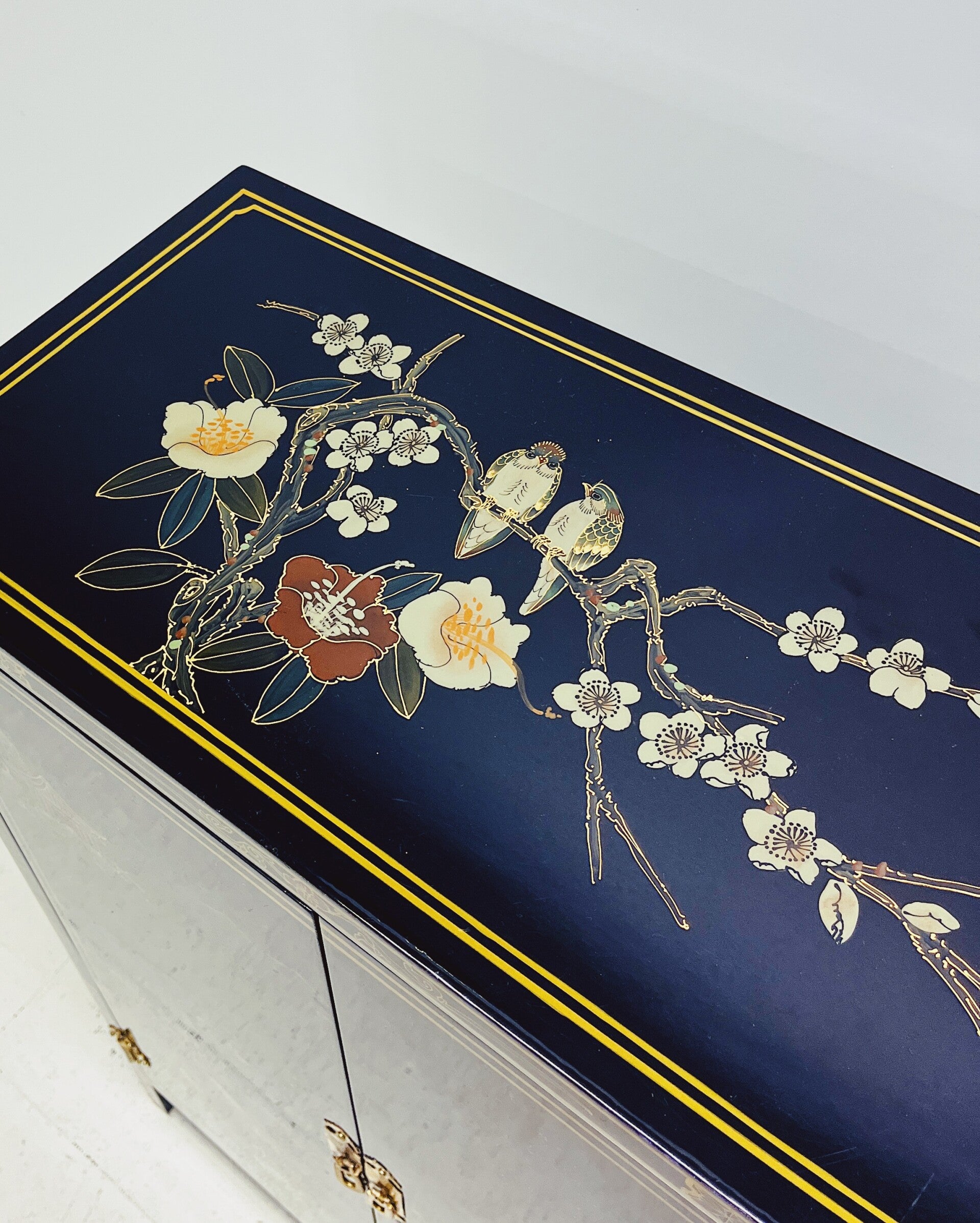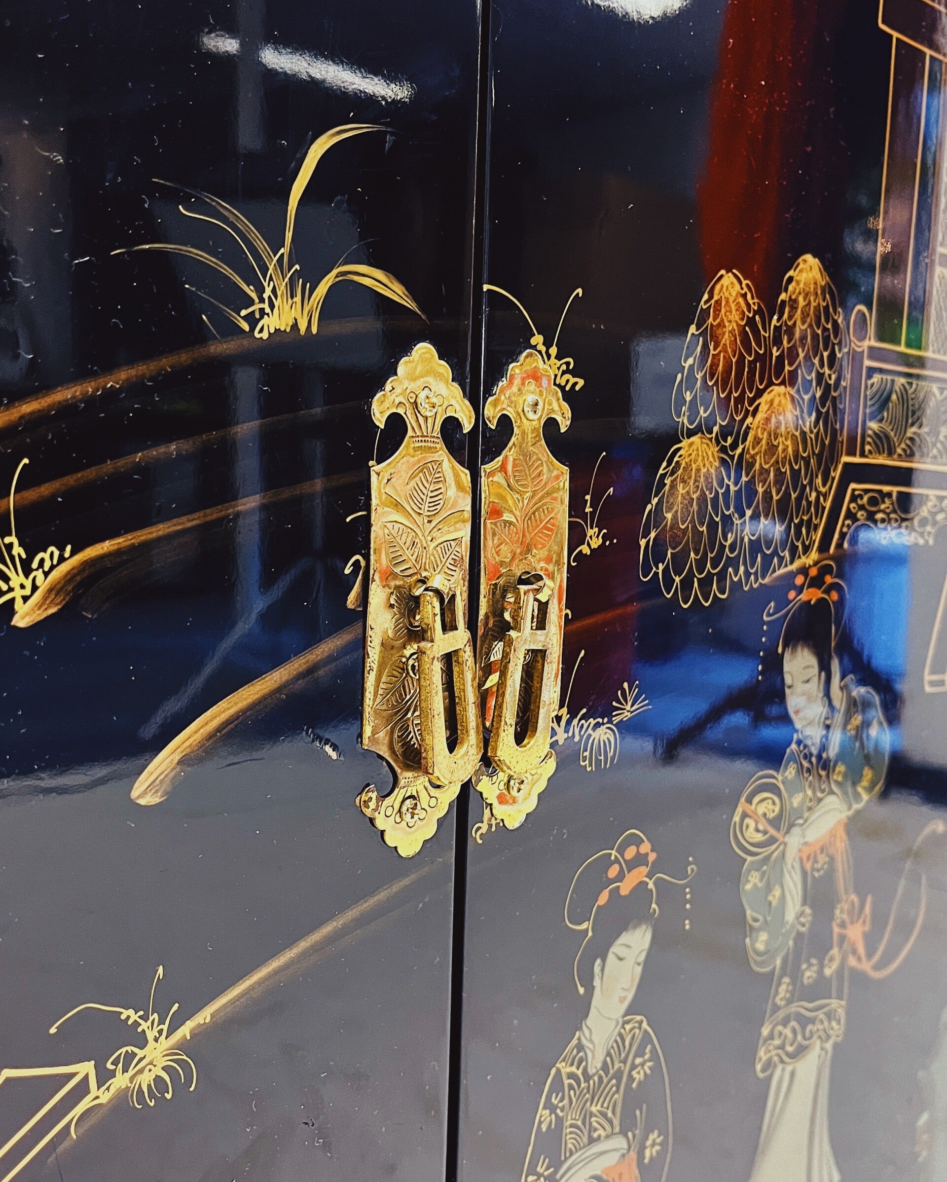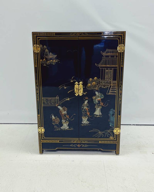 Chinees wandkastje in zwart hoogglanslak. Het is uitgevoerd in stijlvol zwart hoogglanslak en verfraaid met met de hand geschilderde decoraties die menselijke taferelen uitbeelden. Achter de twee deurtjes vind je een handig plankje voor extra opbergruimte. Het kastje heeft minimale gebruikssporen.