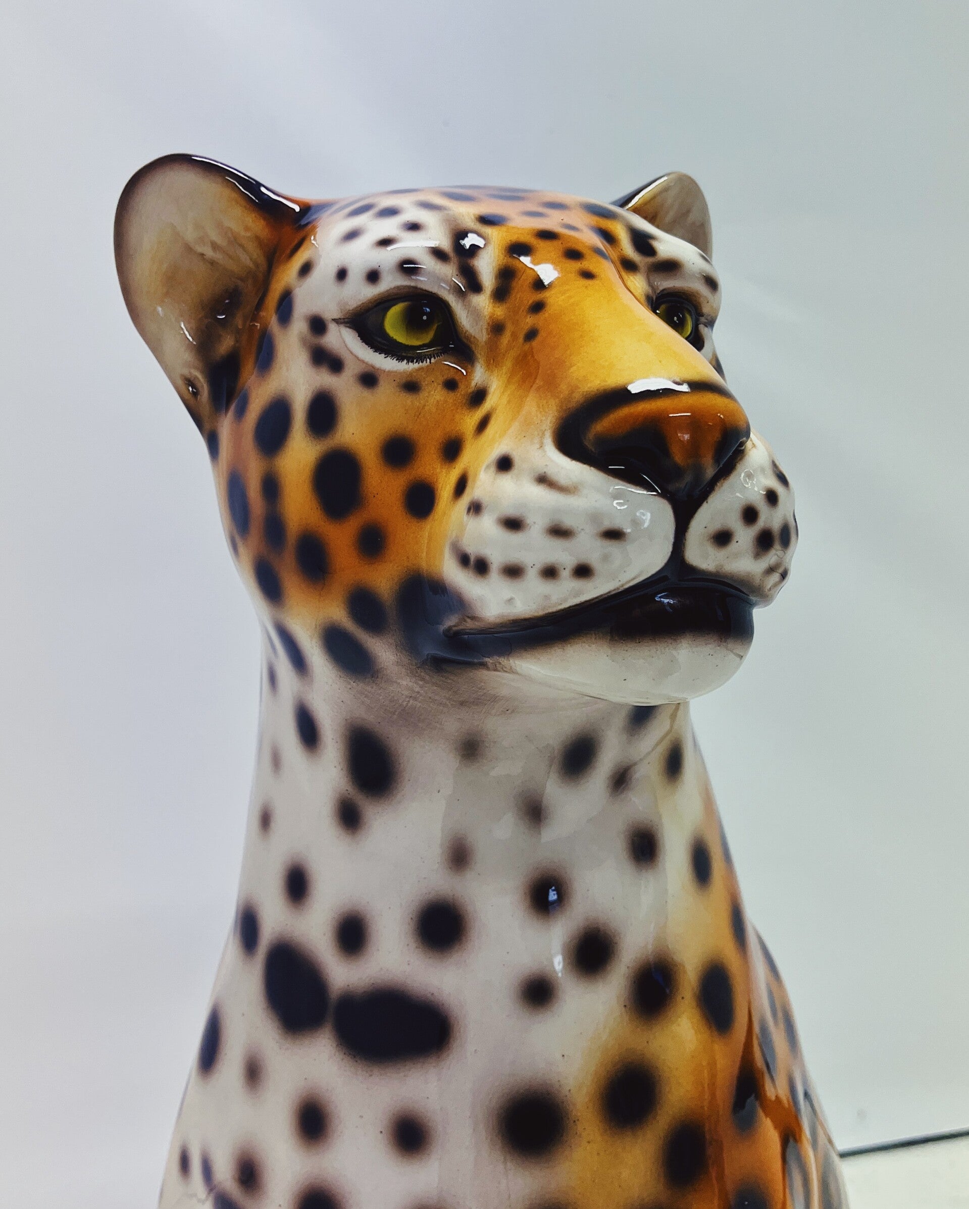 Uniek handgemaakt beeld van een luipaard. Dit Hollywood Regency beeld, vervaardigd van met de hand beschilderd keramiek en gemaakt in Italië, zal ongetwijfeld een verbluffende en stoere uitstraling aan je interieur toevoegen!