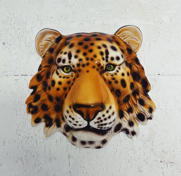 Uniek handgemaakt wandbord/masker van een luipaard. Dit Hollywood Regency beeld, vervaardigd van met de hand beschilderd keramiek en gemaakt in Italië, zal ongetwijfeld een verbluffende en stoere uitstraling aan je interieur toevoegen!