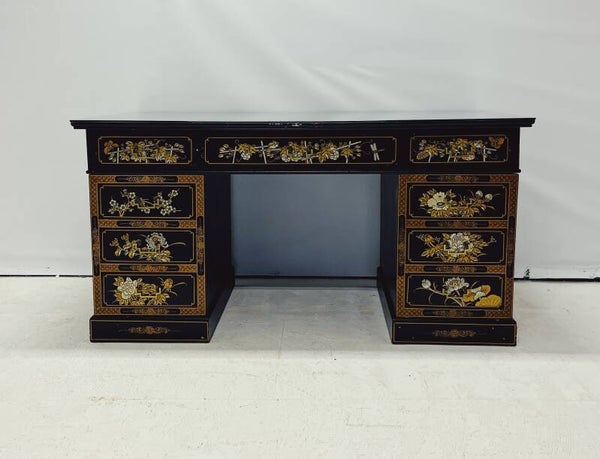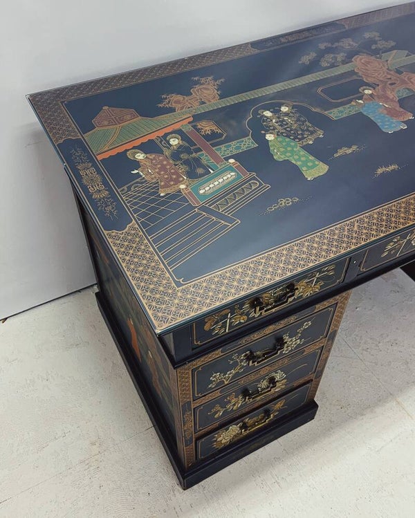 Prachtig en zwaar massief houten bureau in karakteristieke Chinese stijl. Het bureau beschikt over maar liefst negen lades, afgewerkt met sierlijke messing handgrepen. De lades en omlijsting zijn met de hand beschilderd met gedetailleerde voorstellingen van mensen, bloemen en planten, wat het stuk een authentieke en decoratieve uitstraling geeft.