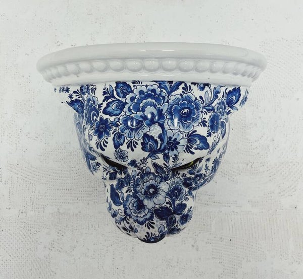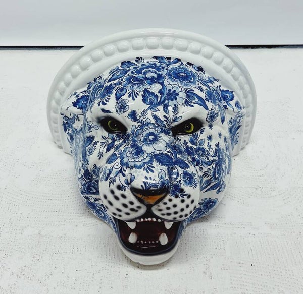 Handgemaakt Delfts blauw wandplank in de vorm van een luipaard Dit bijzondere beeld is een custom made kunstwerk: een luipaard kop met handgeschilderde Delfts blauwe decoraties, gemaakt met authentieke Delfts blauwe zeefdruktechniek. Elk beeld wordt met de hand vervaardigd en is daardoor uniek in zijn soort – er bestaat er maar één zoals deze.