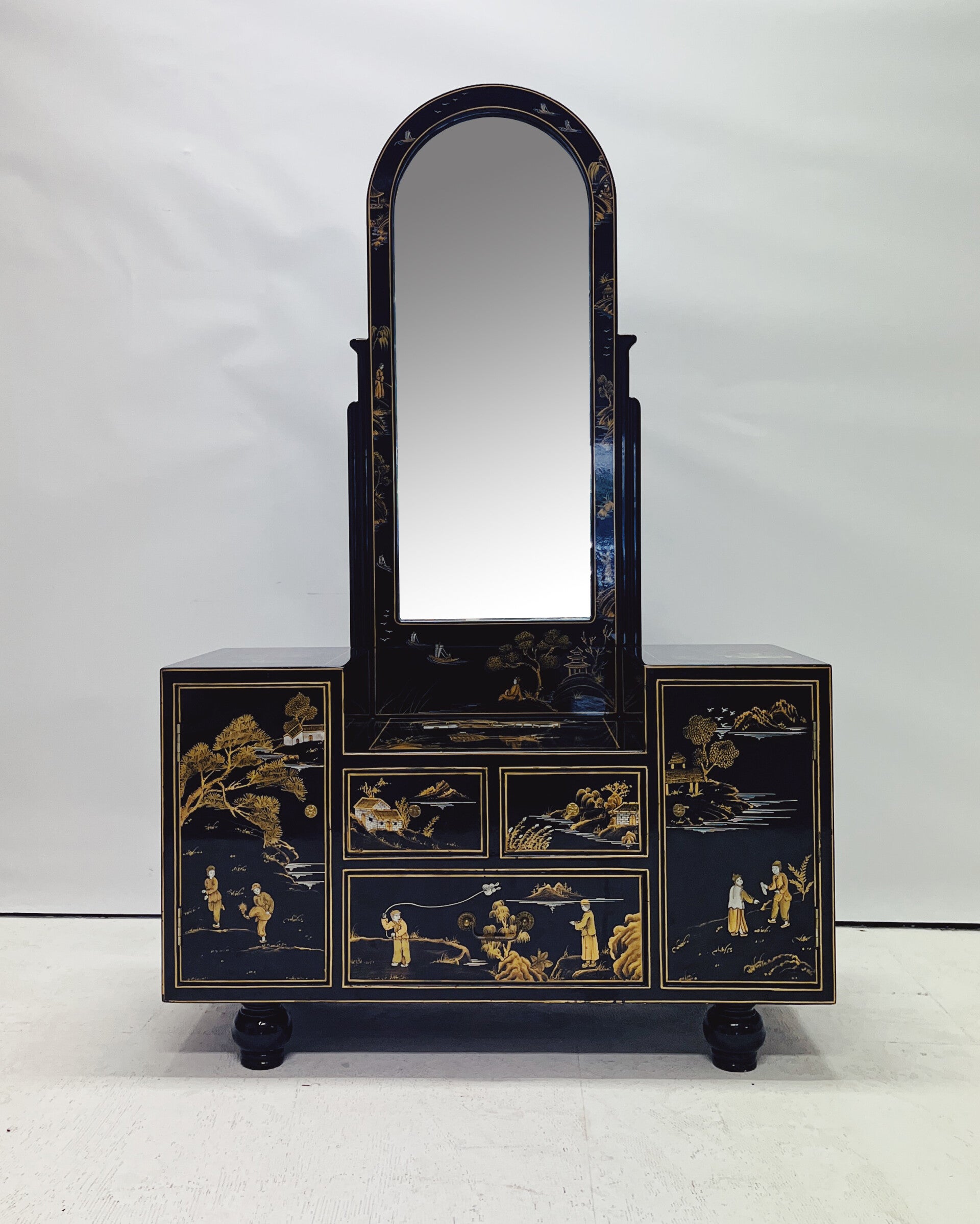 Deze elegante kast beschikt over drie lades en twee deurtjes, wat zorgt voor extra opbergruimte. De spiegel in het midden is verstelbaar. Het meubel vertoont gebruikssporen passend bij de leeftijd, wat bijdraagt aan het karakter en de charme.