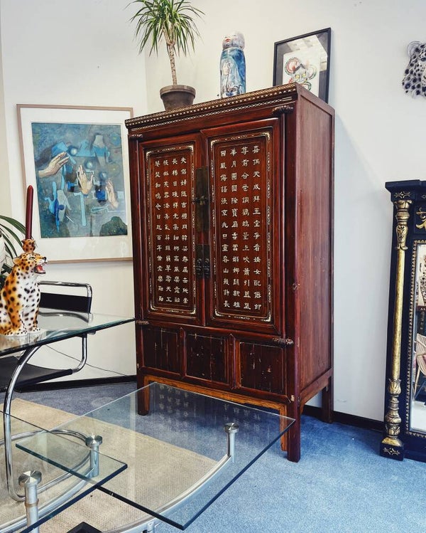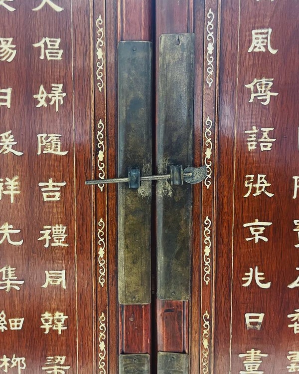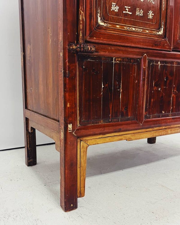 Deze antieke Chinese kast is voorzien van inlegwerk in de vorm van sierlijke Chinese karakters.