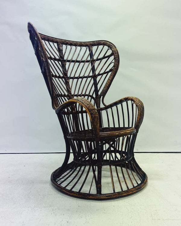 Deze vintage rotan pauwstoel is een echte blikvanger. Met zijn organische vormen en open gevlochten rugleuning straalt hij een bohemian en retro sfeer uit. De stoel is handgemaakt van donker rotan en heeft een elegante, luchtige uitstraling die perfect past in een natuurlijk of eclectisch interieur.