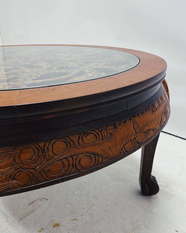 Deze ronde houten salontafel heeft een ingelegd blad met Aziatisch houtsnijwerk. Het reliëf toont een gedetailleerde voorstelling, waardoor het blad een opvallend element vormt. De tafel staat op gebogen poten en heeft lichte gebruikssporen passend bij de leeftijd. Een bijzonder stuk voor wie een meubel zoekt met een duidelijke, decoratieve uitstraling.