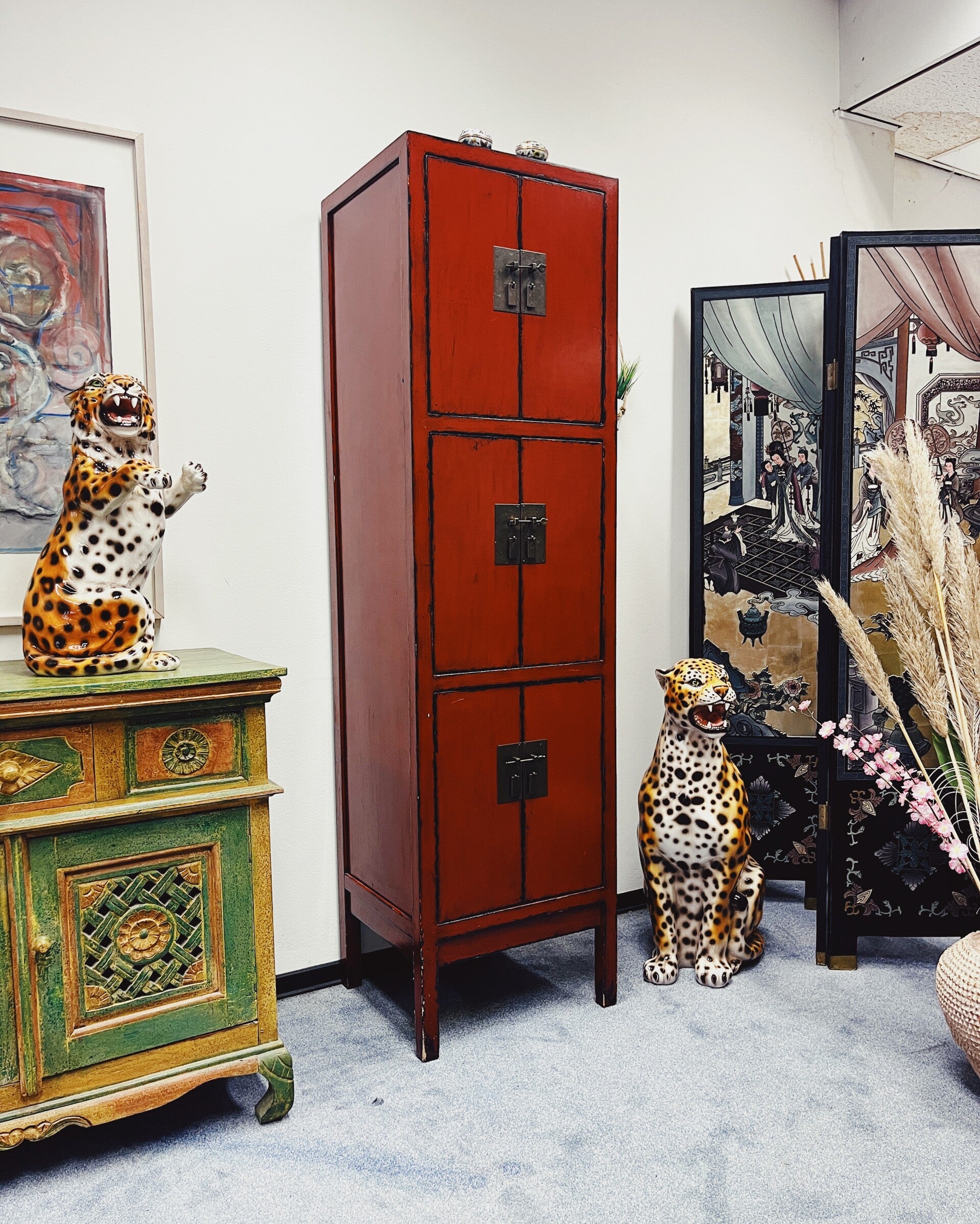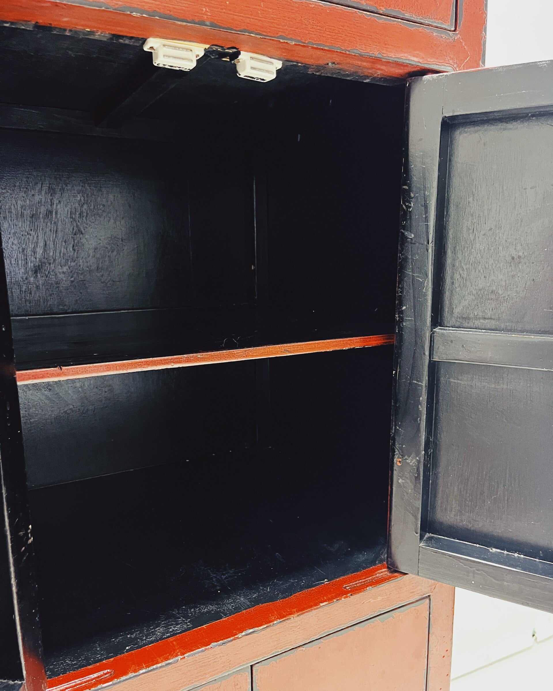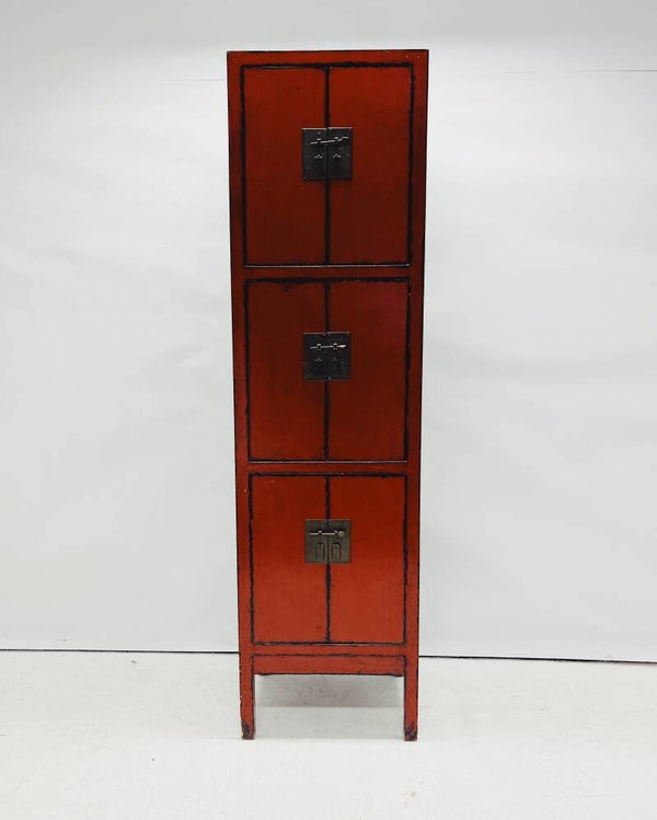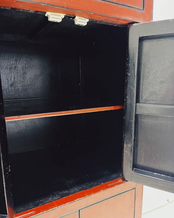 Rode Chinese kast met drie deuren. Deze rode Chinese kast heeft drie deuren met daarachter twee ruime vakken, gescheiden door een vaste plank. De kast is uitgevoerd met traditioneel hang- en sluitwerk, wat zorgt voor een herkenbare en tijdloze uitstraling. Het meubel heeft gebruikssporen en een licht verweerde look, maar is naar verwachting van recentere makelij.