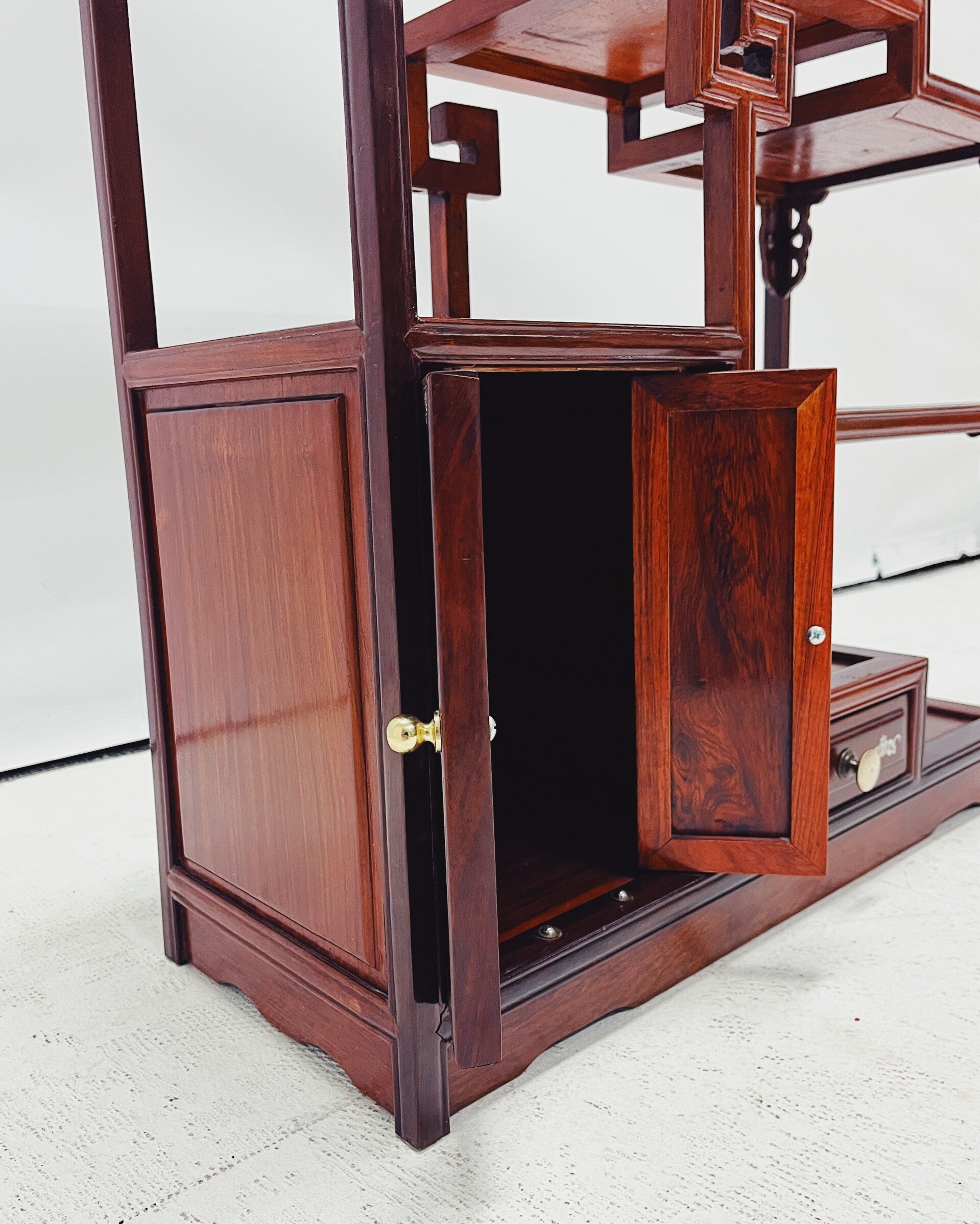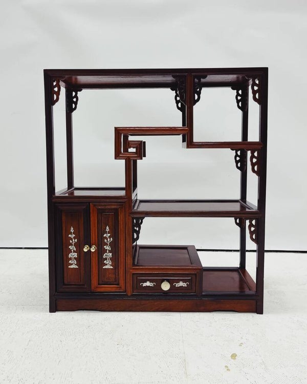 Dit kleine Chinese vitrinekastje is voorzien van één lade en een deurtje, ideaal voor het opbergen van kleine items. Het kastje is waarschijnlijk gemaakt van rozenhout en heeft fijn houtsnijwerk met parelmoer inleg. Het kastje verkeert in goede staat en is een prachtige toevoeging aan iedere ruimte.