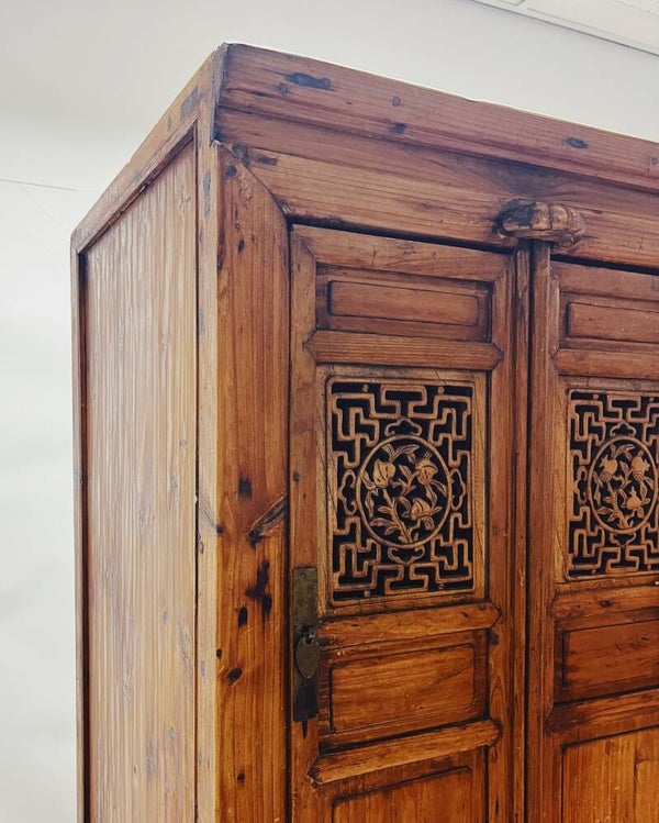 Chinese kast antiek. Deze antieke Chinese kast heeft 3 laden en 4 deurtjes, waarvan ook de deurtjes aan de zijkanten kunnen openen. De bovenste deurtjes zijn voorzien van houtsnijwerk. Onder de laden bevindt zich een open gedeelte met spijlen en daaronder een open vak. De kast staat op hoge poten en heeft gebruikssporen passend bij de leeftijd.