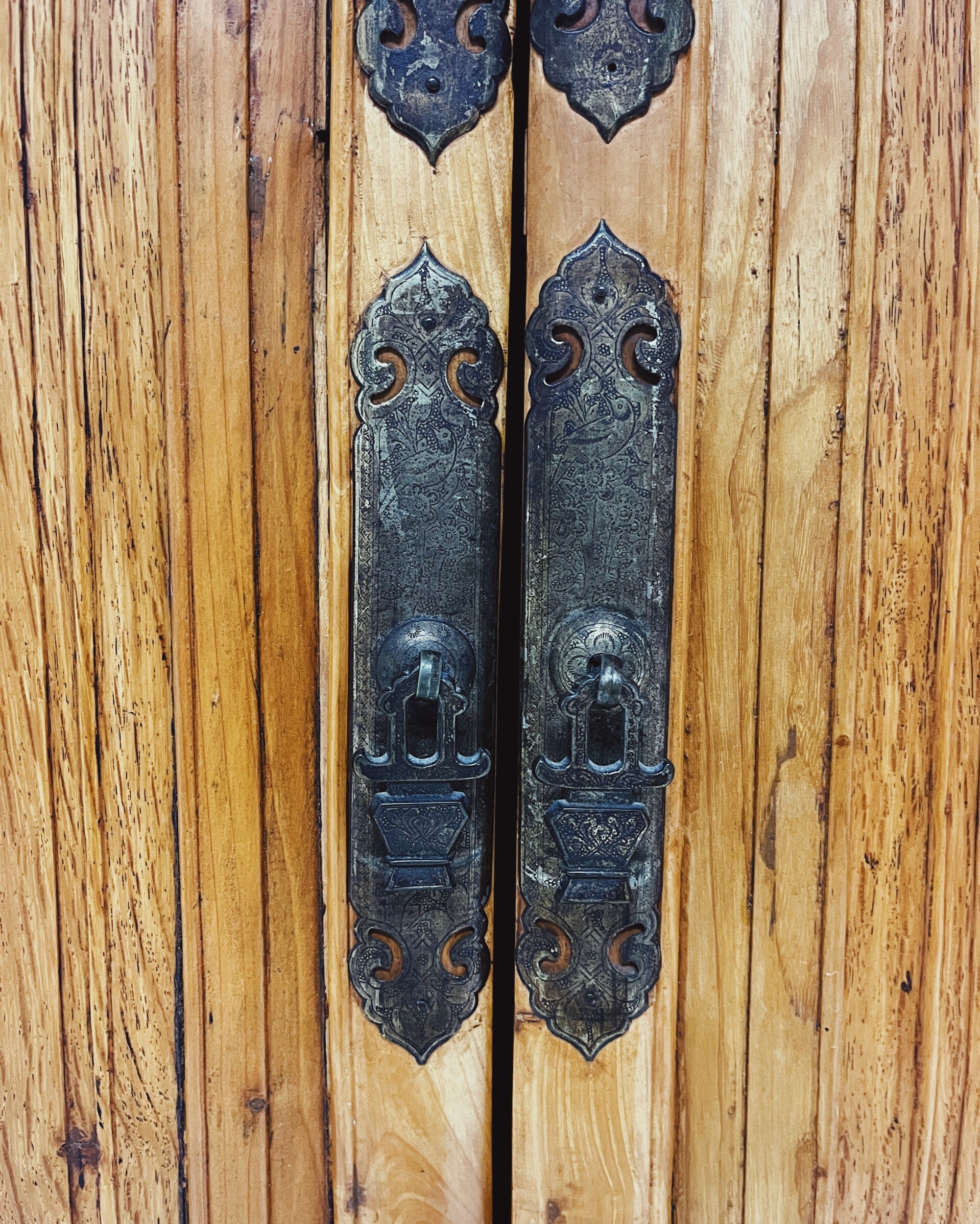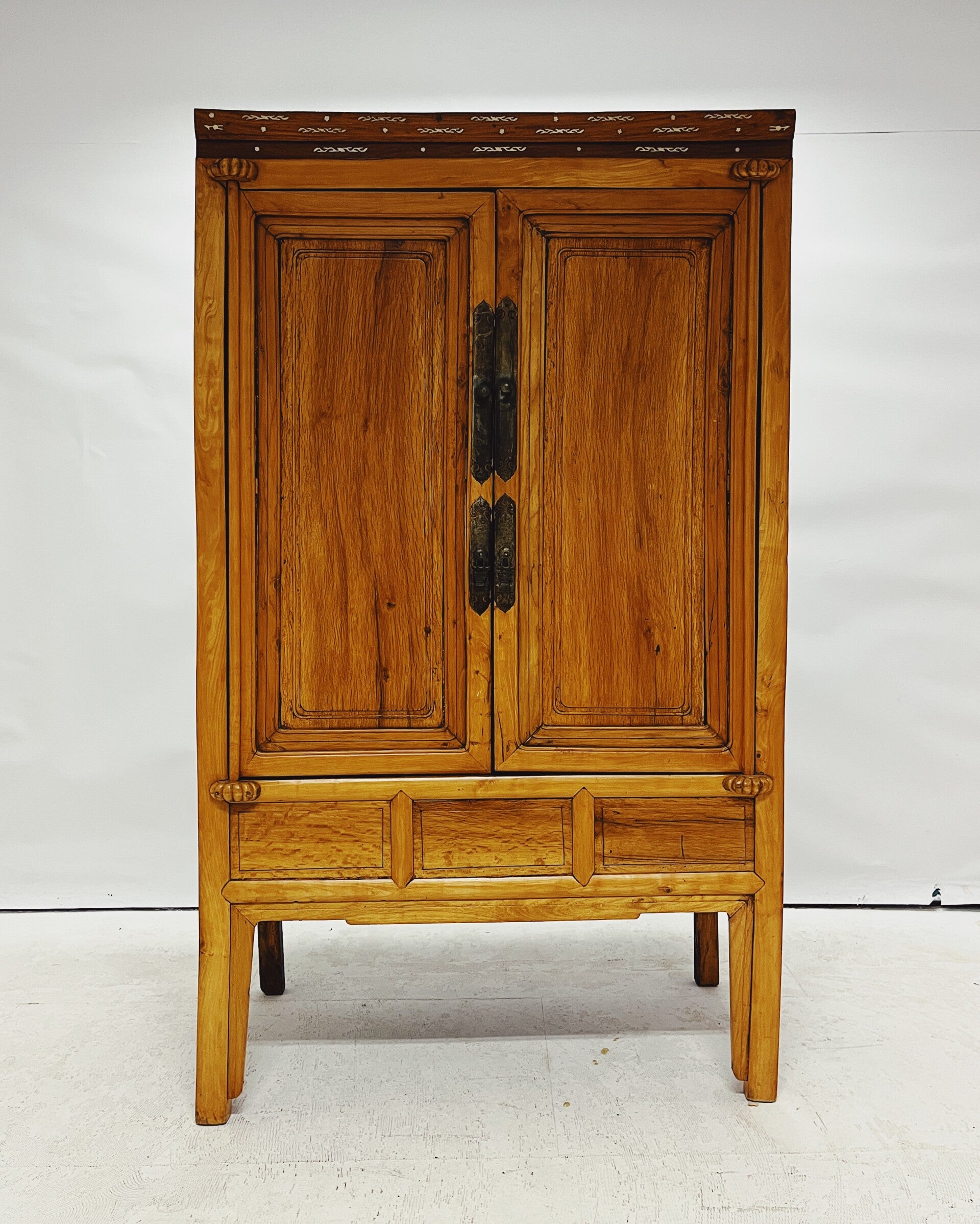 Antieke Chinese kast van licht hout. De kast heeft bijzondere paneeldeuren en een versierde bovenkant met inlegwerk. Voorzien van traditioneel Chinees hang- en sluitwerk; één pinnetje ontbreekt.