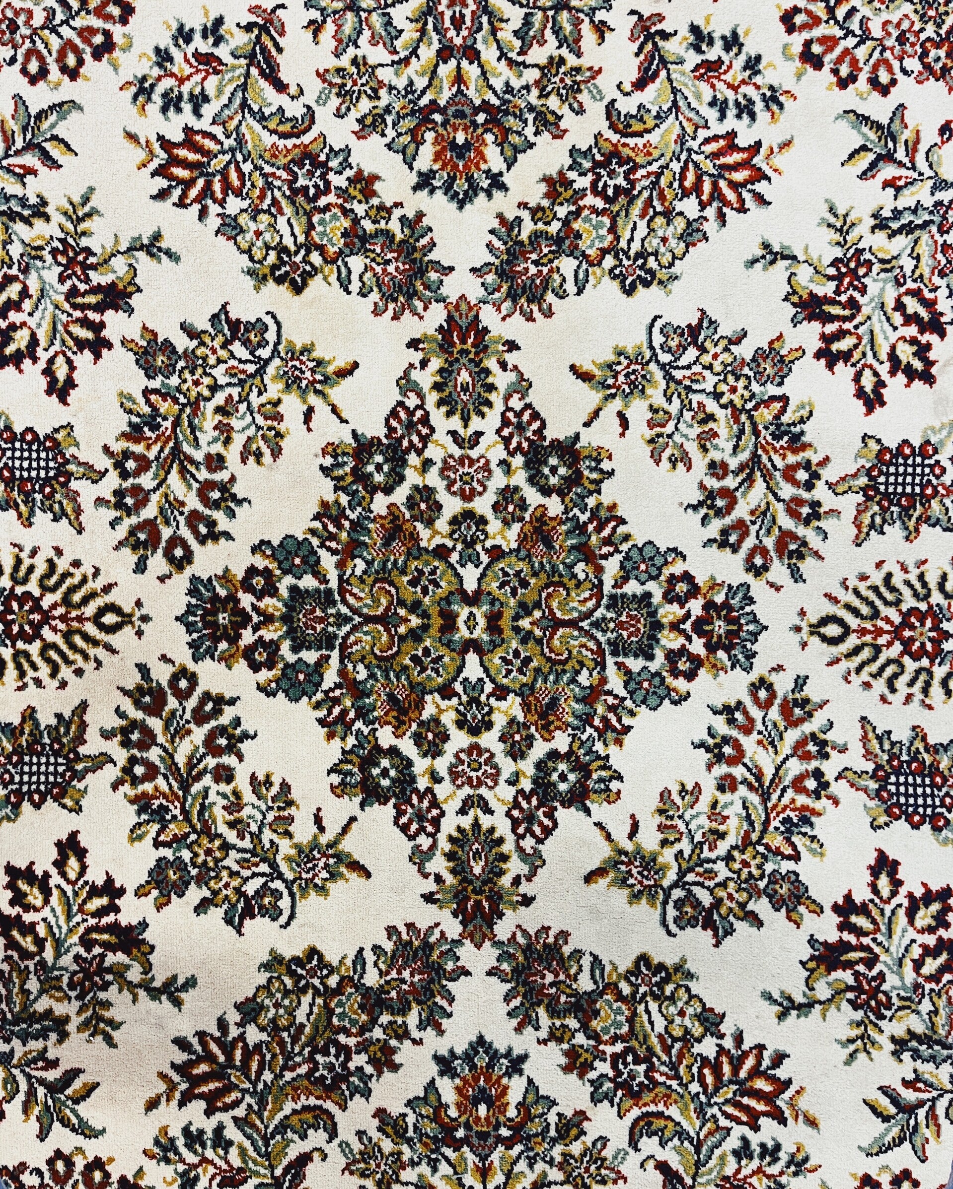 Groot tapijt met bloem- en plantmotieven op een wit/crèmekleurige achtergrond. De bloemen zijn uitgevoerd in diverse kleuren.Afmetingen340 x 250cm