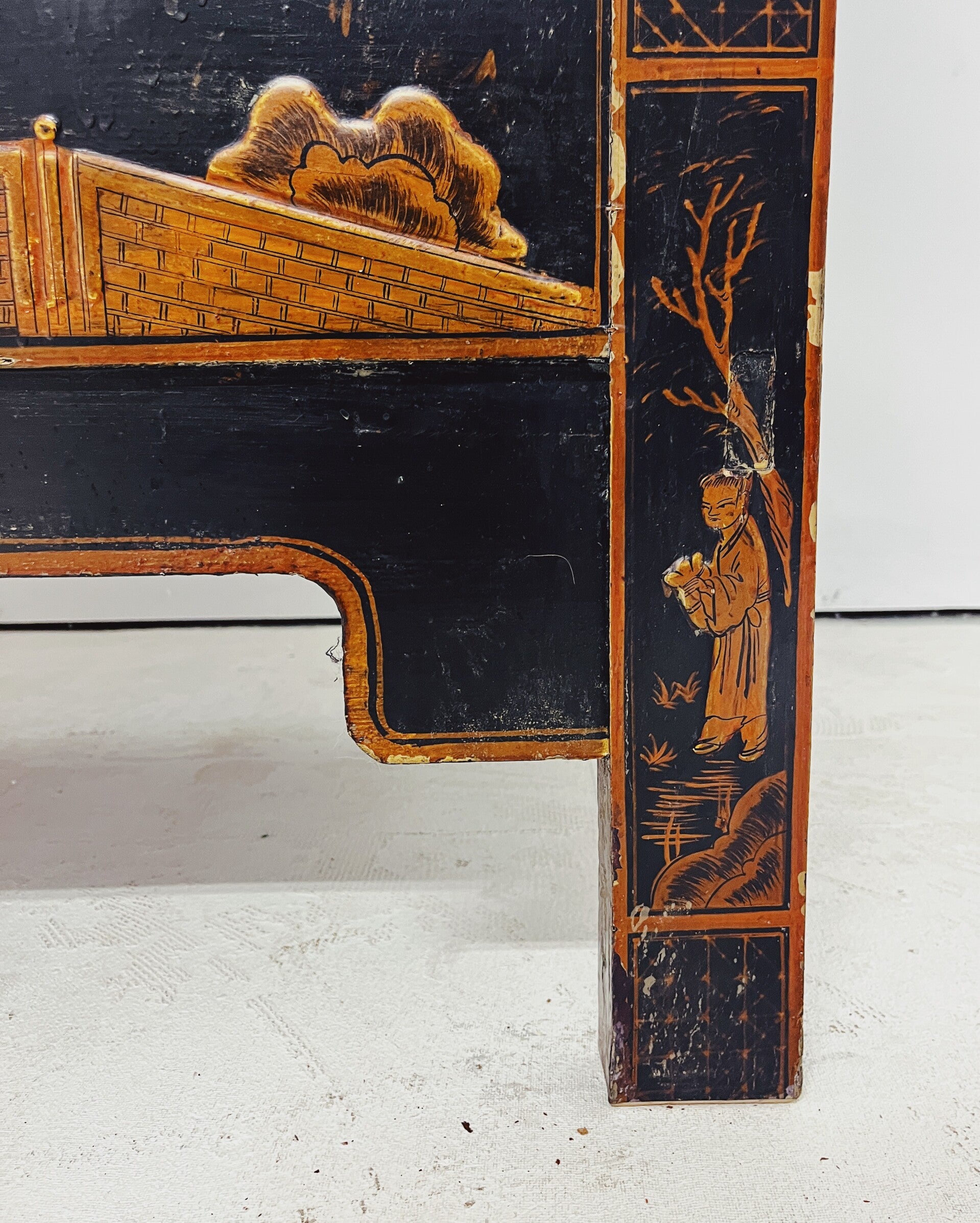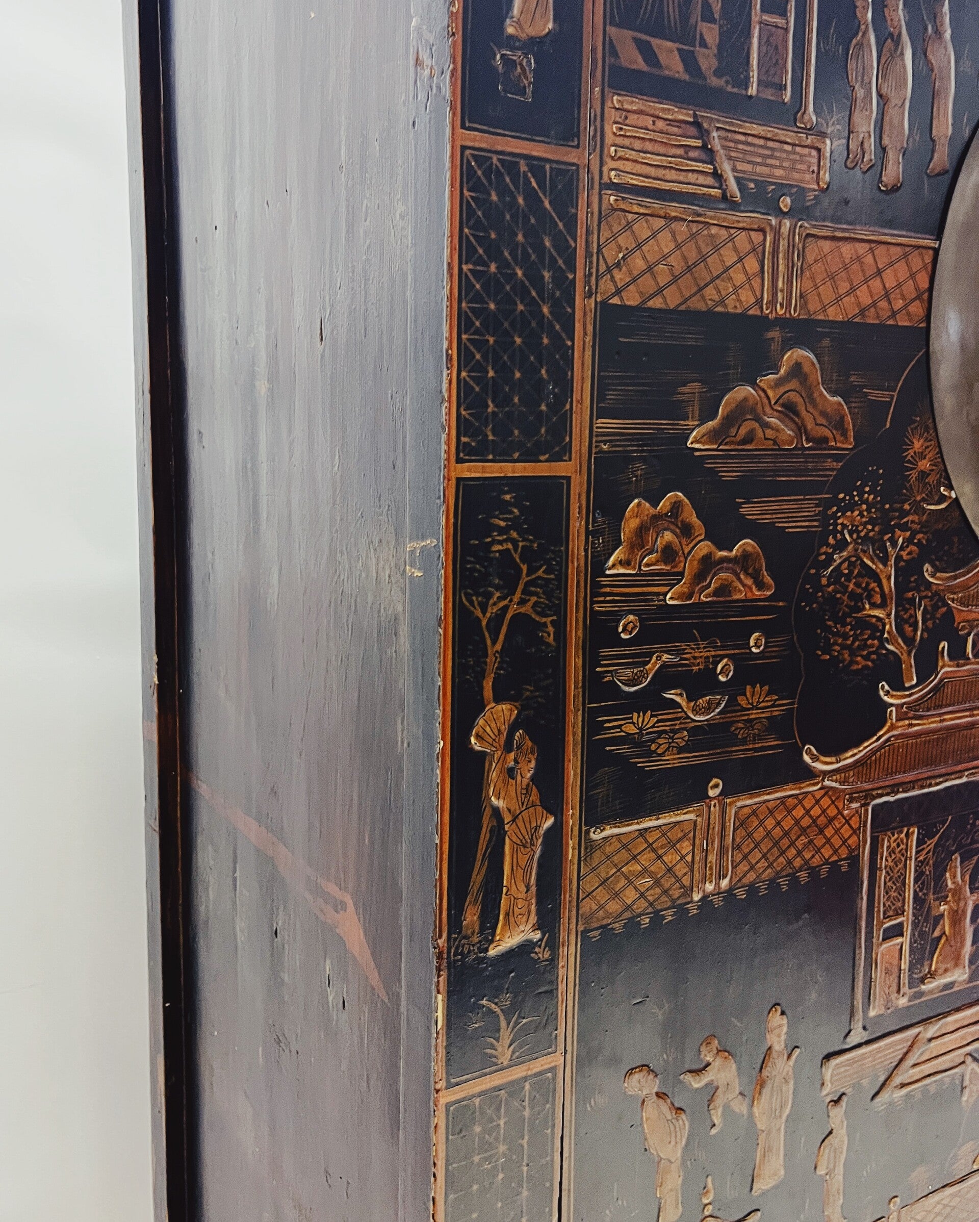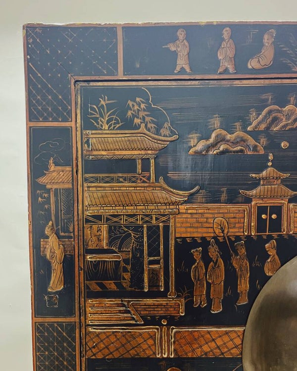 Antieke Chinese kast met inleg- en schilderwerk waarin een doorlopend verhaal is afgebeeld. De kast is voorzien van groot, origineel hang- en sluitwerk met een rond metalen embleem.