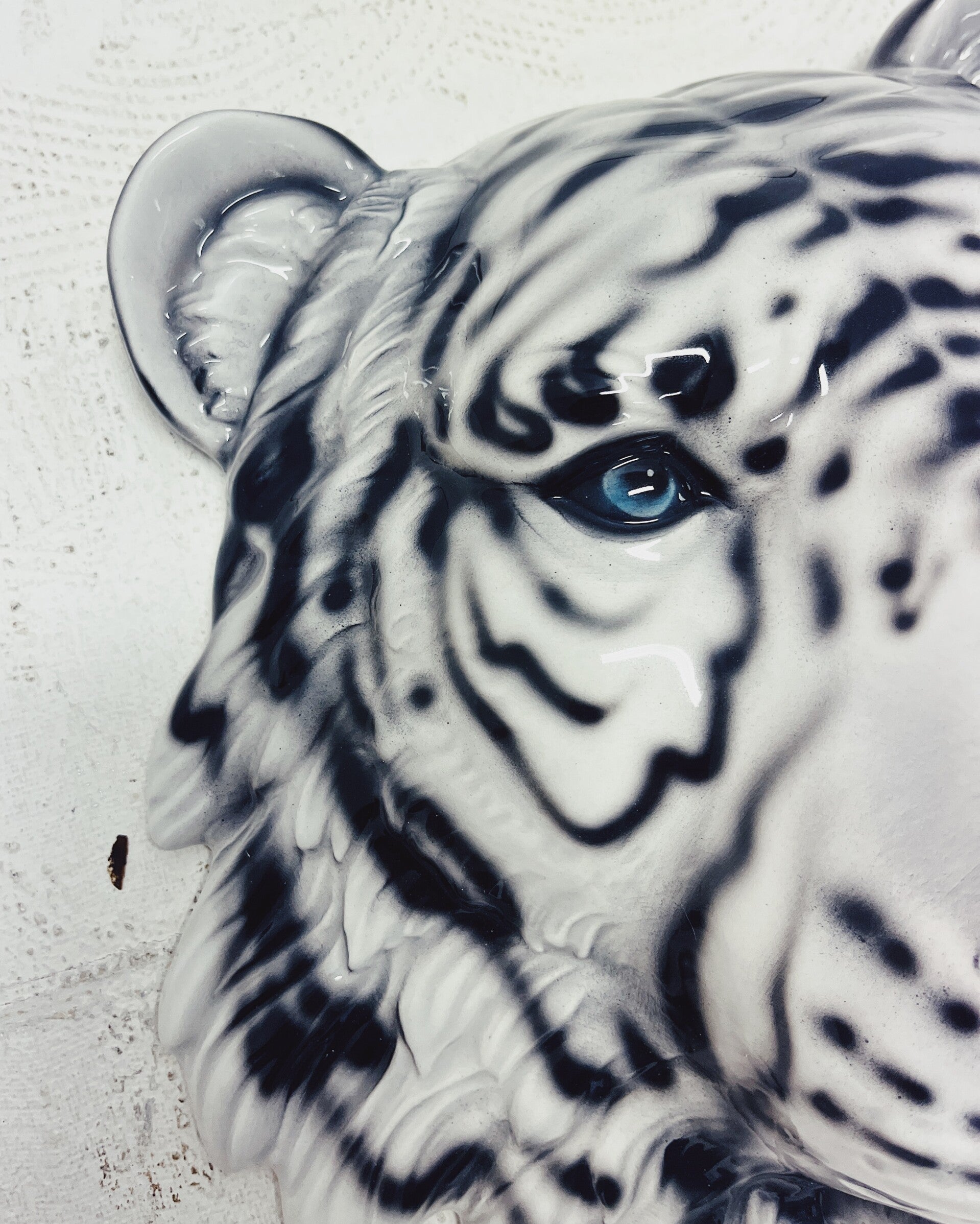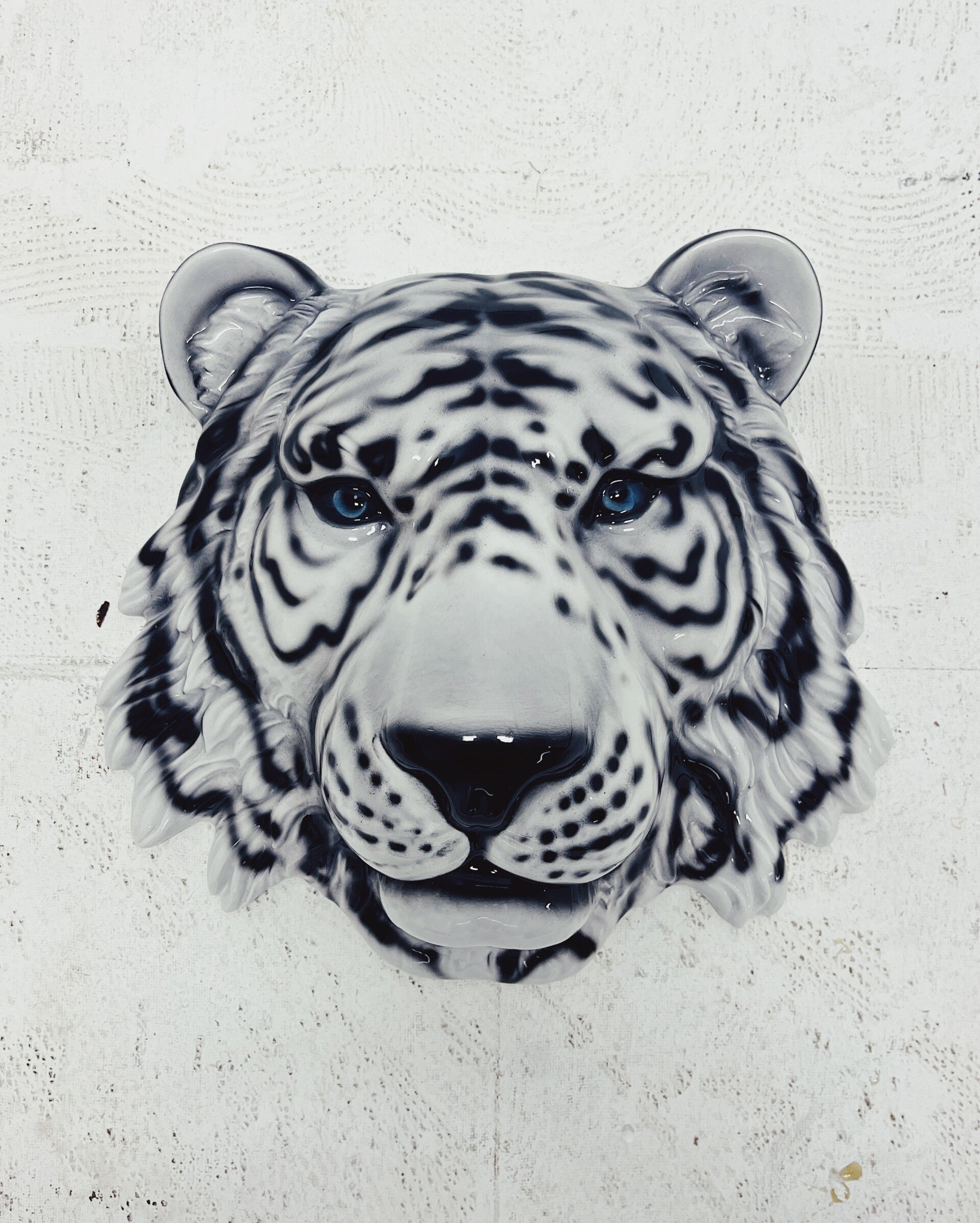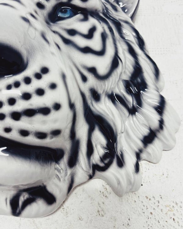 Uniek handgemaakt wandbord/masker van een tijger met zwarte neus. Dit Hollywood Regency beeld, vervaardigd van met de hand beschilderd keramiek en gemaakt in Italië, zal ongetwijfeld een verbluffende en stoere uitstraling aan je interieur toevoegen!