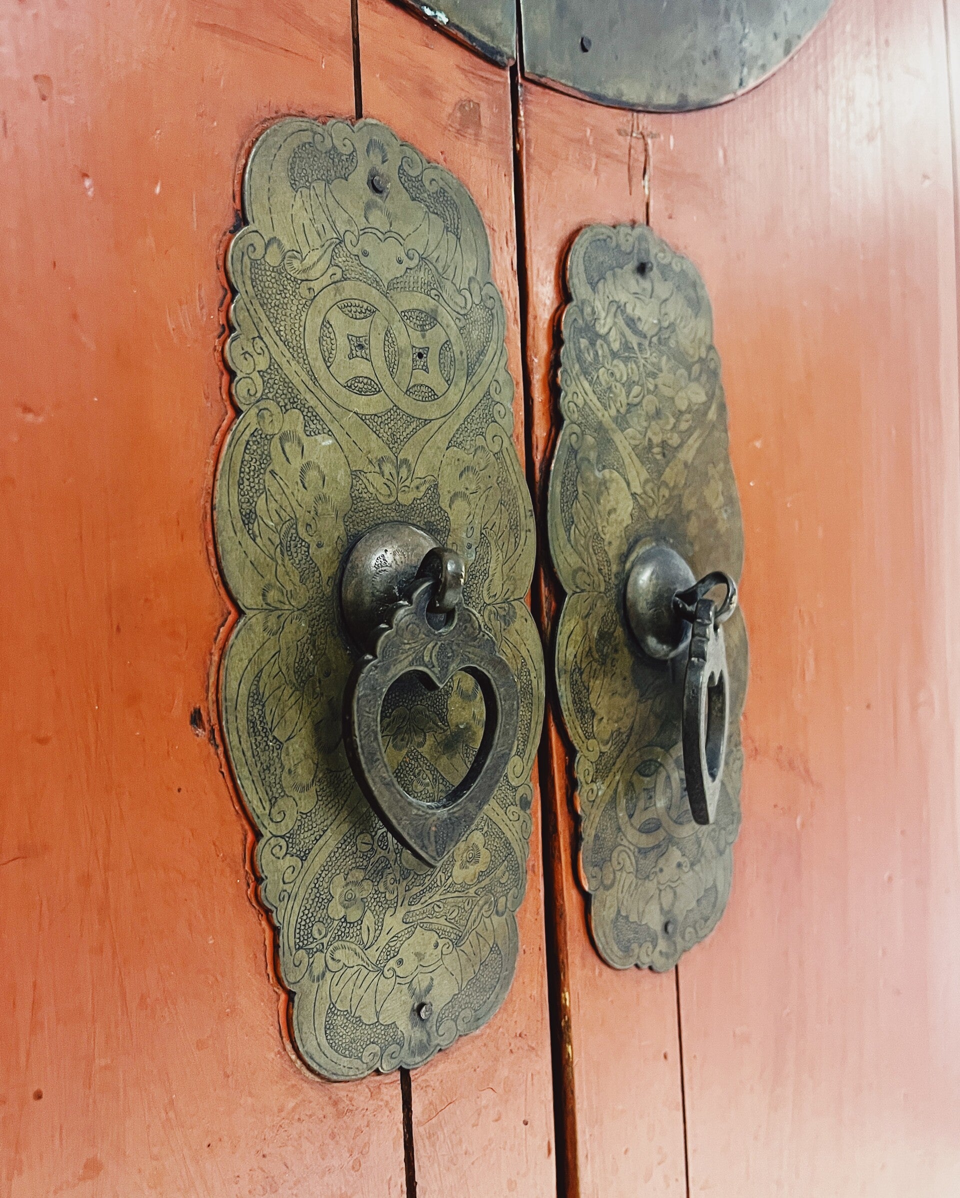 Chinese bruidskast uitgevoerd in rood. De kast is vermoedelijk antiek en gemaakt van hout, met originele details zoals het donkere metalen beslag op de deuren en bijpassende handgrepen.De kast beschikt over twee laden, twee losse schappen en een opbergvak onderin, en is daardoor praktisch in gebruik als kledingkast, servieskast of linnenkast.