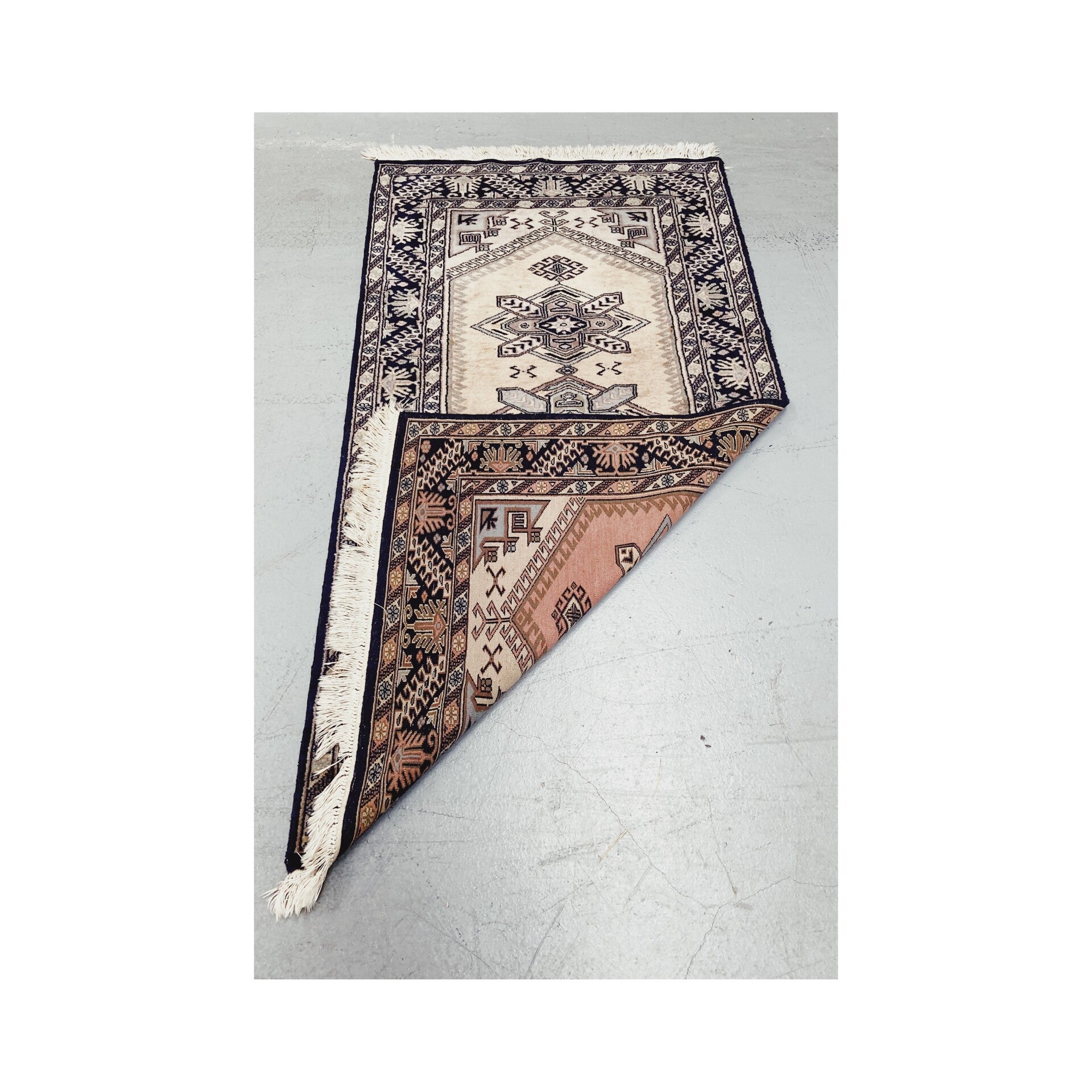 Mooi handgeknoopt tapijt met bijzondere geometrische vormen. Het bruin, blauw en beige zorgen voor een mooi rustiek uiterlijk. Het tapijt heeft wat gebruikssporen maar ziet er verder nog prima uit.