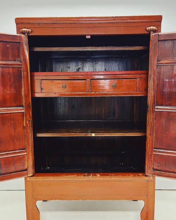 Prachtige antieke kast in een warme rode kleur, voorzien van een groot rond messing beslag met verfijnde decoraties. De kast heeft karakteristiek hang- en sluitwerk en een authentieke uitstraling. Binnenin beschikt de kast over 2 lades en 3 schappen, waarvan de planken verstelbaar zijn voor praktisch gebruik.