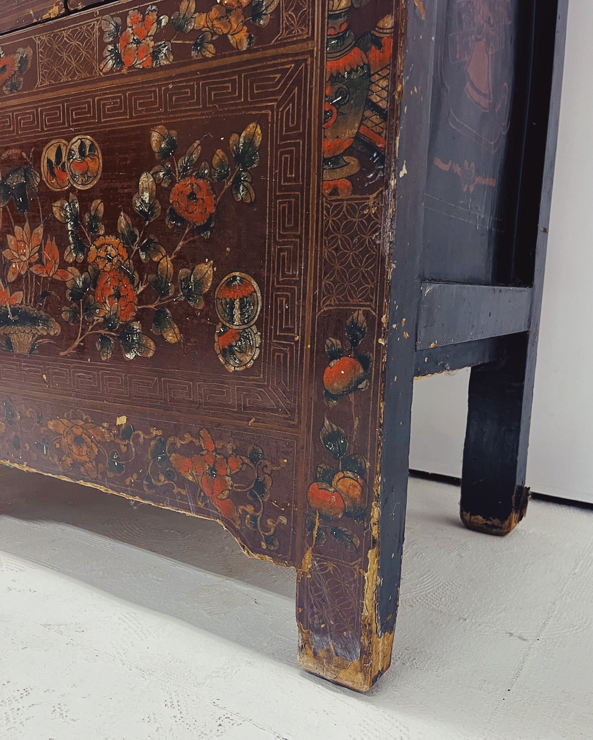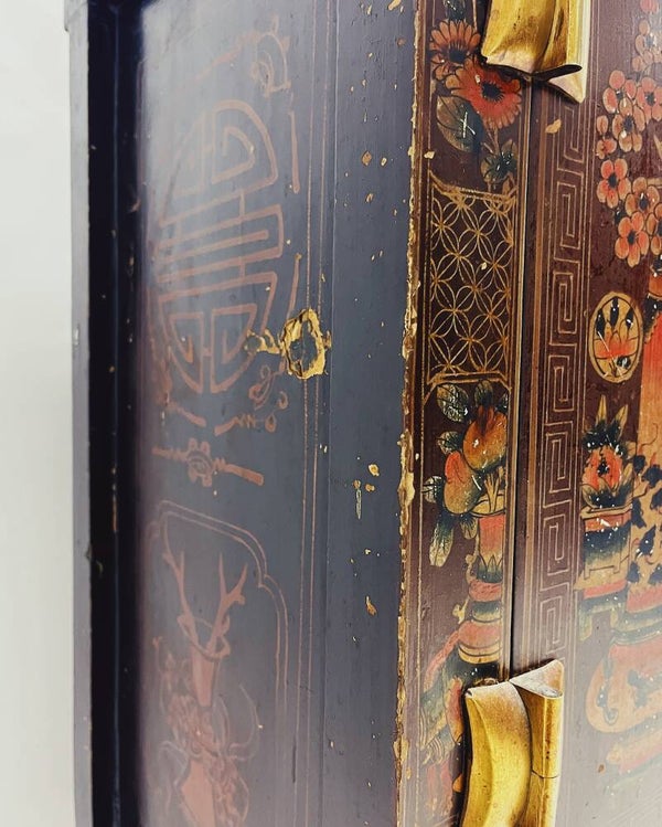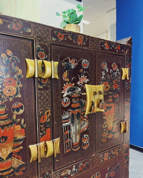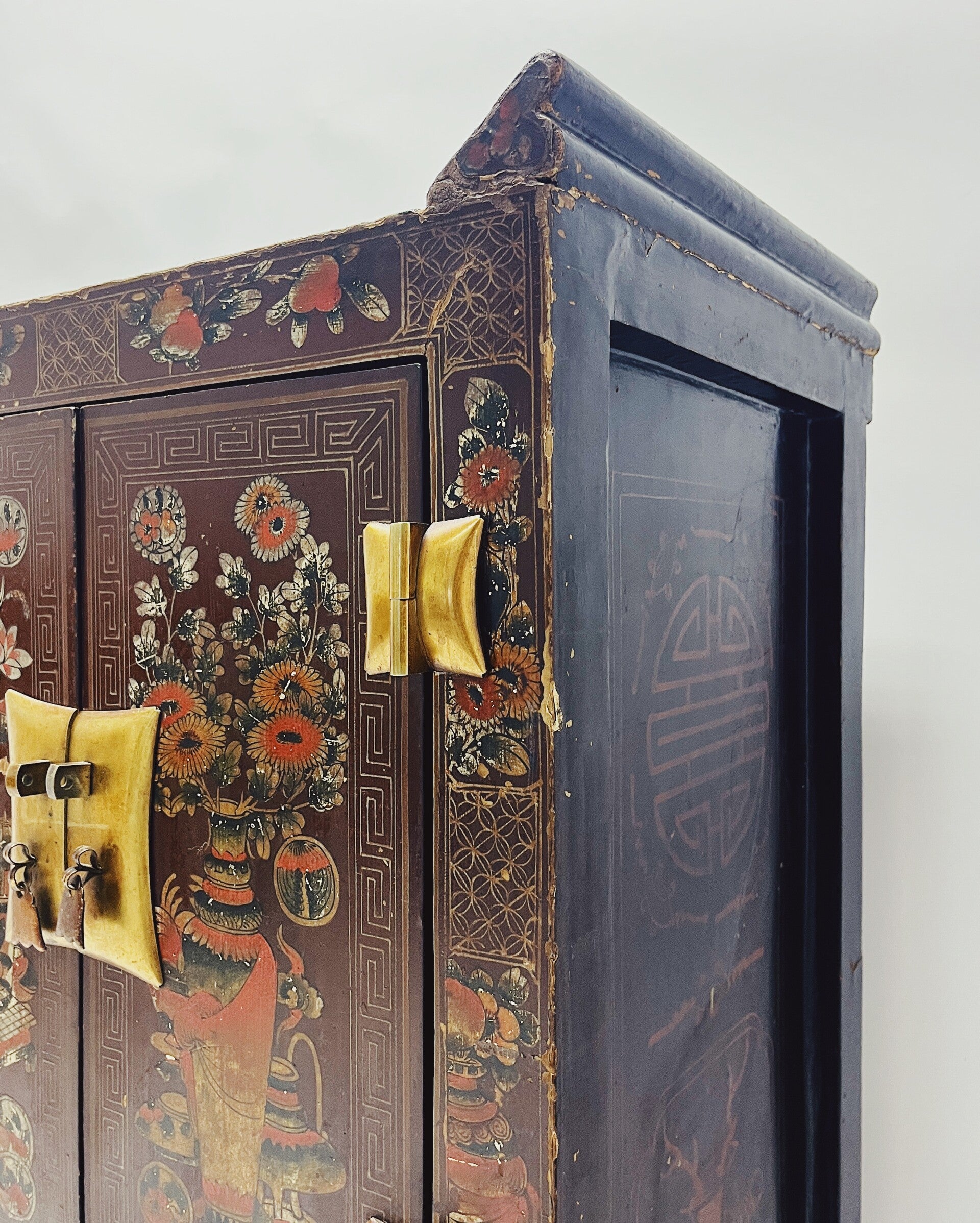 Unieke Chinese lak kast met rijke handgeschilderde decoraties van bloemen en planten op een donkere achtergrond. De kast is voorzien van opvallend messing beslag en heeft een authentieke, decoratieve uitstraling.