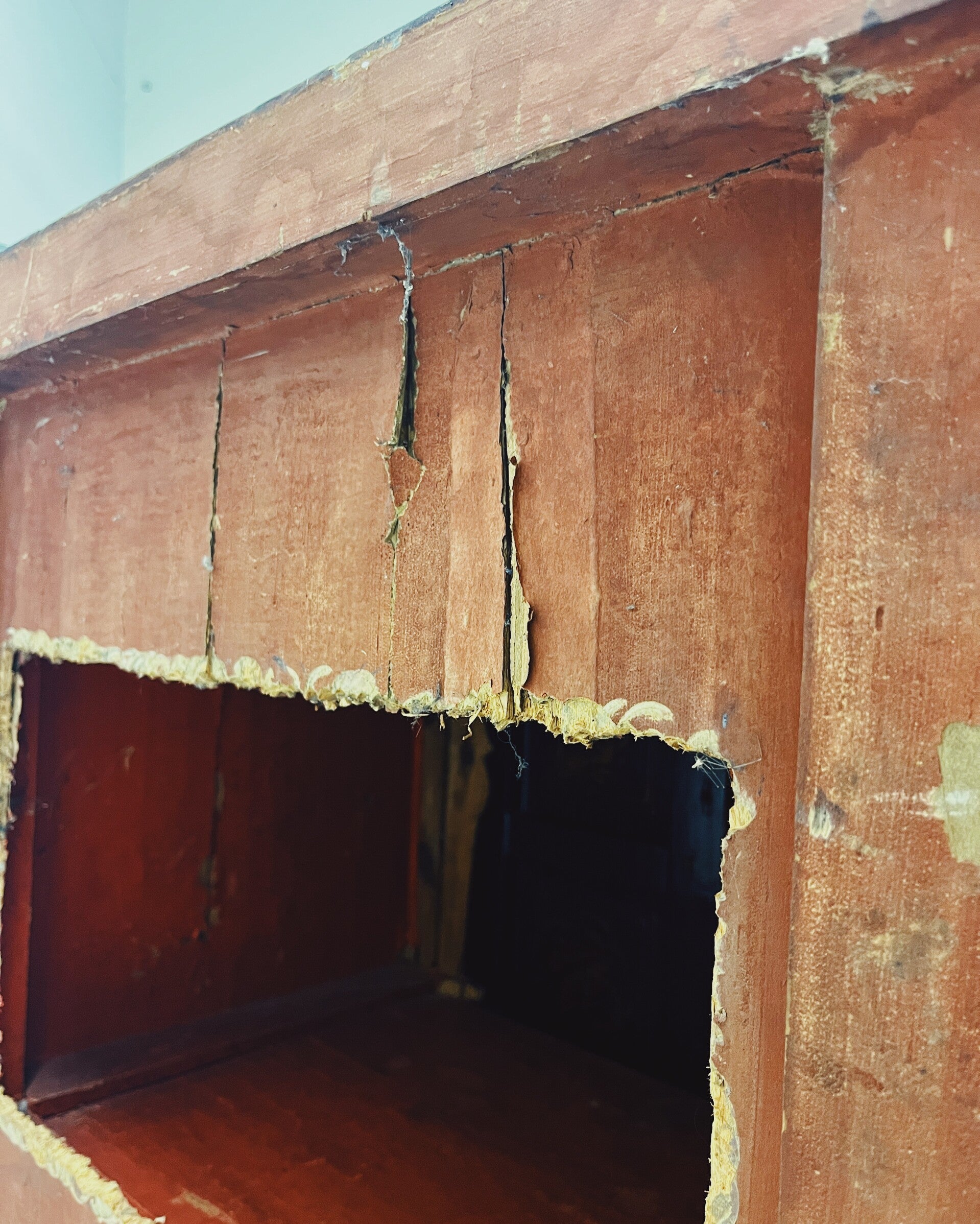De kast vertoont duidelijke gebruikssporen en beschadigingen, met name aan de poten en twee gaten in de achterzijde. Dit is meegenomen in de prijs en maakt het een bijzonder, maar gereduceerd stuk.