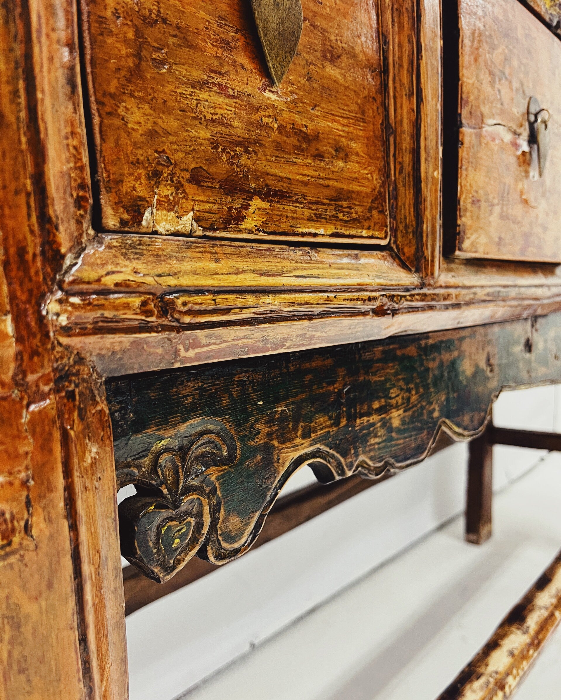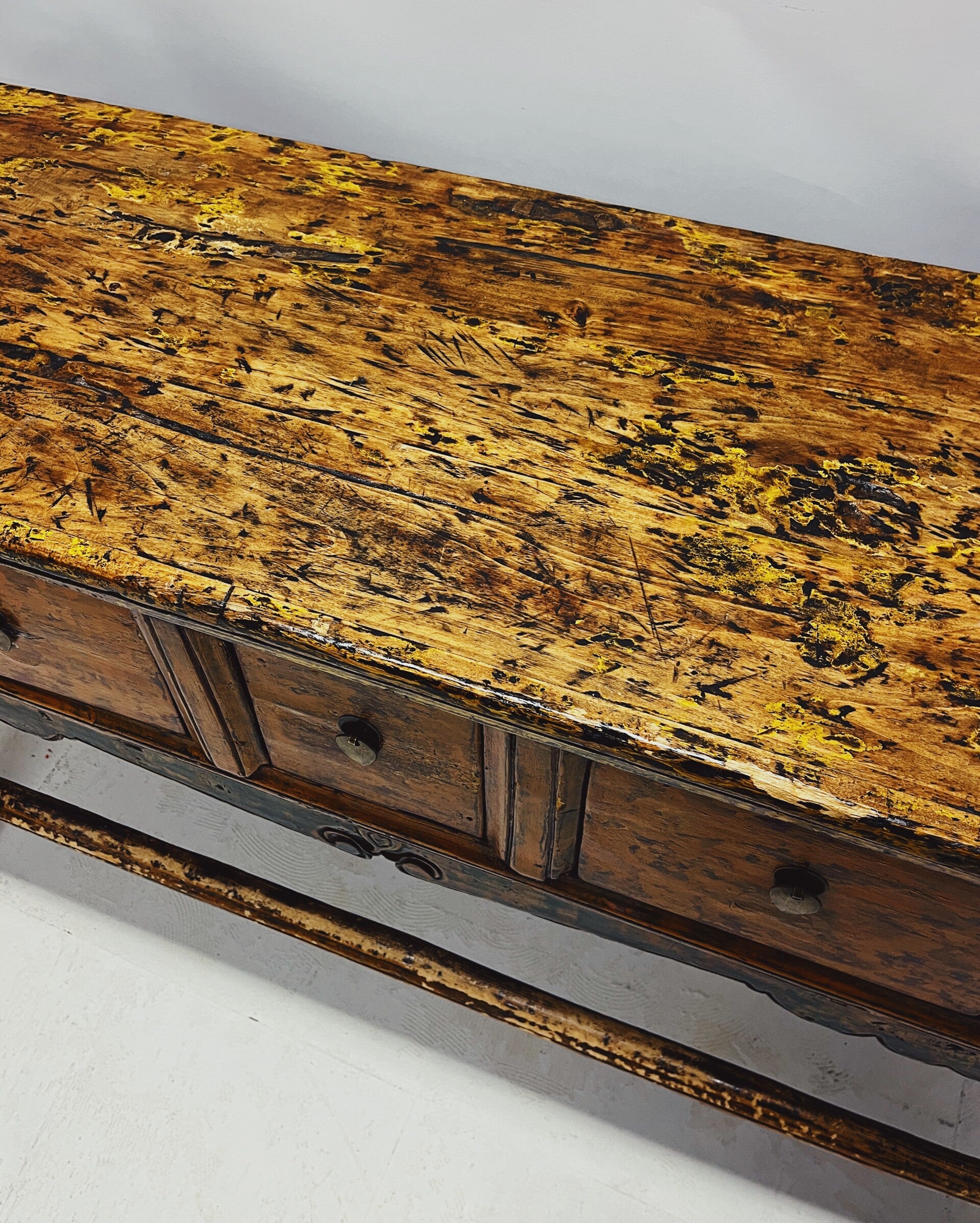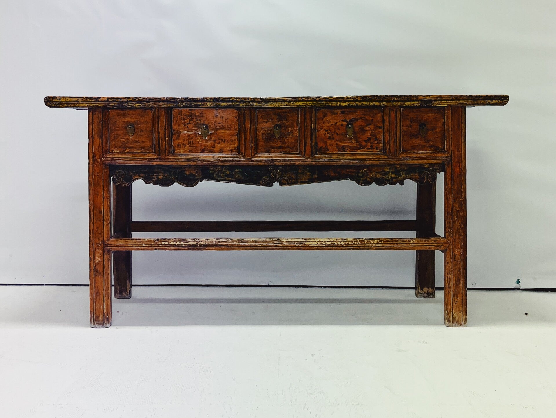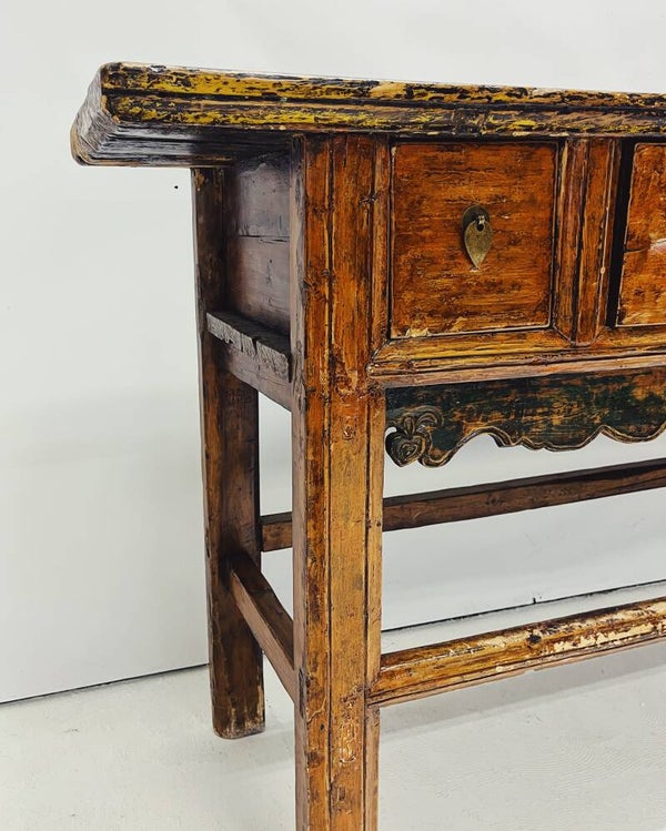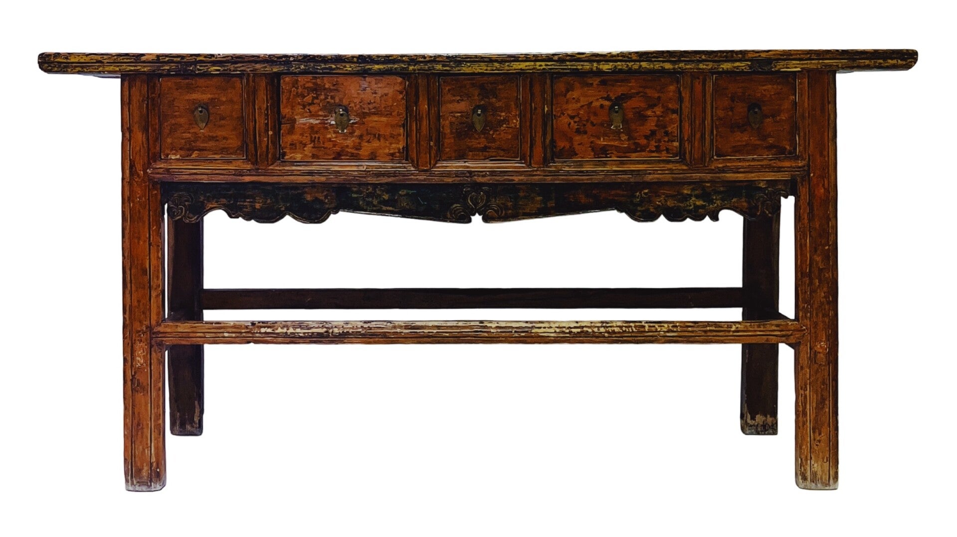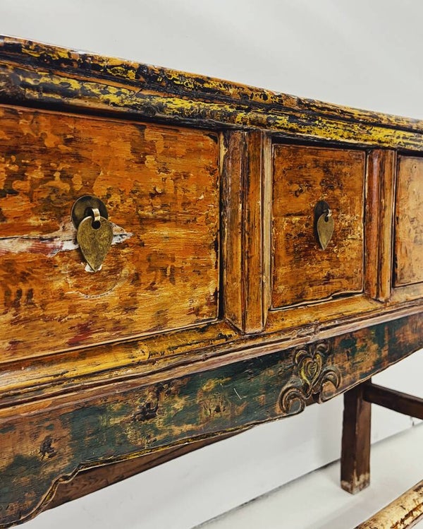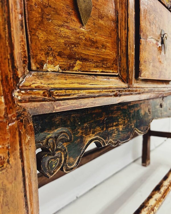 Karaktervolle antieke sidetable / consoletafel van massief hout, voorzien van 5 ruime lades met originele grepen. Het blad heeft een mooi reliëf en onder de lades bevindt zich verfijnd houtsnijwerk met subtiele groene accenten.