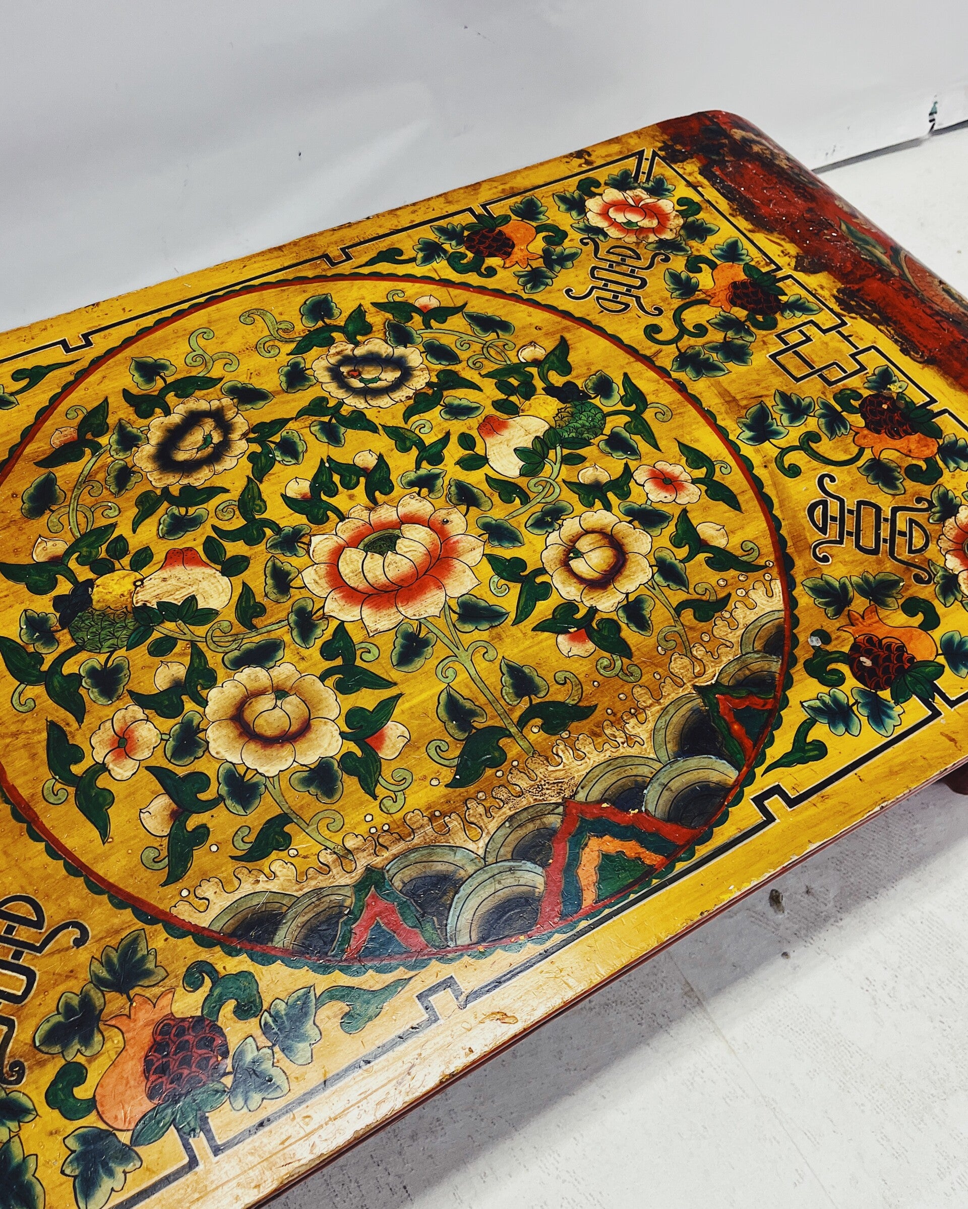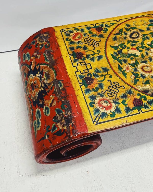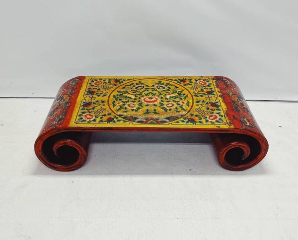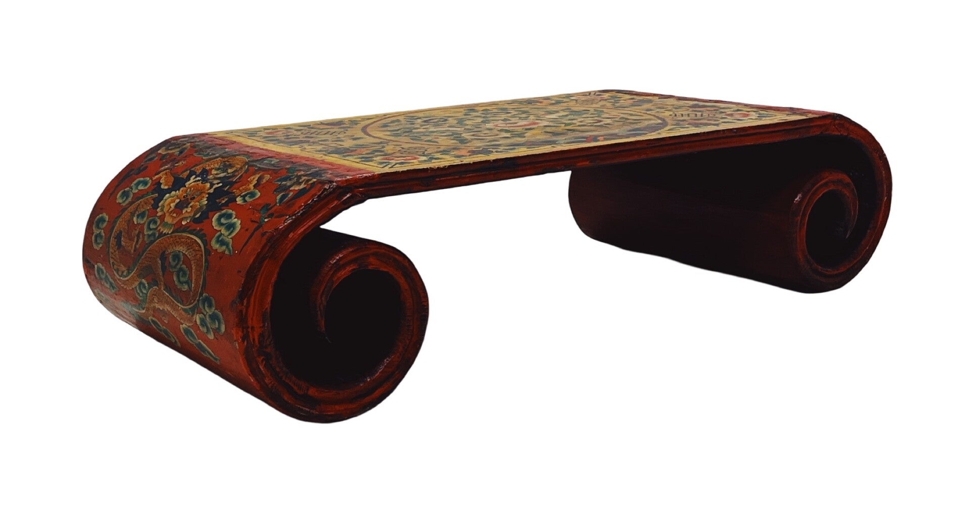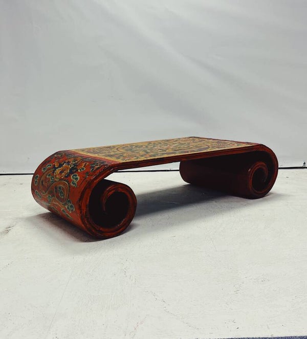 Tibetaanse salontafel / altaartafel met handbeschilderde bloemen- en drakenmotieven. Uitgevoerd in rood met een gedetailleerd decor op het blad en de zijkanten. Voorzien van fraai gekrulde poten.