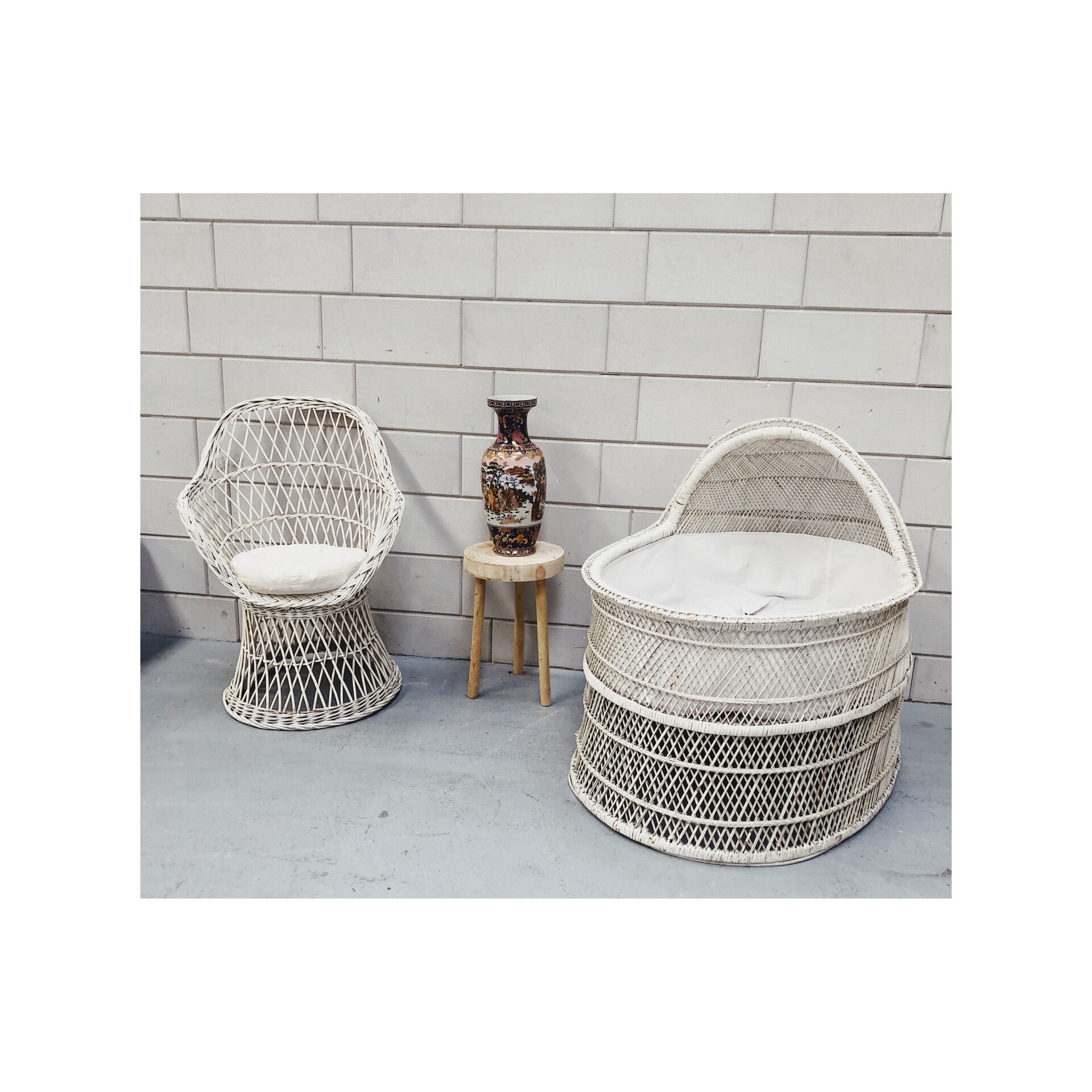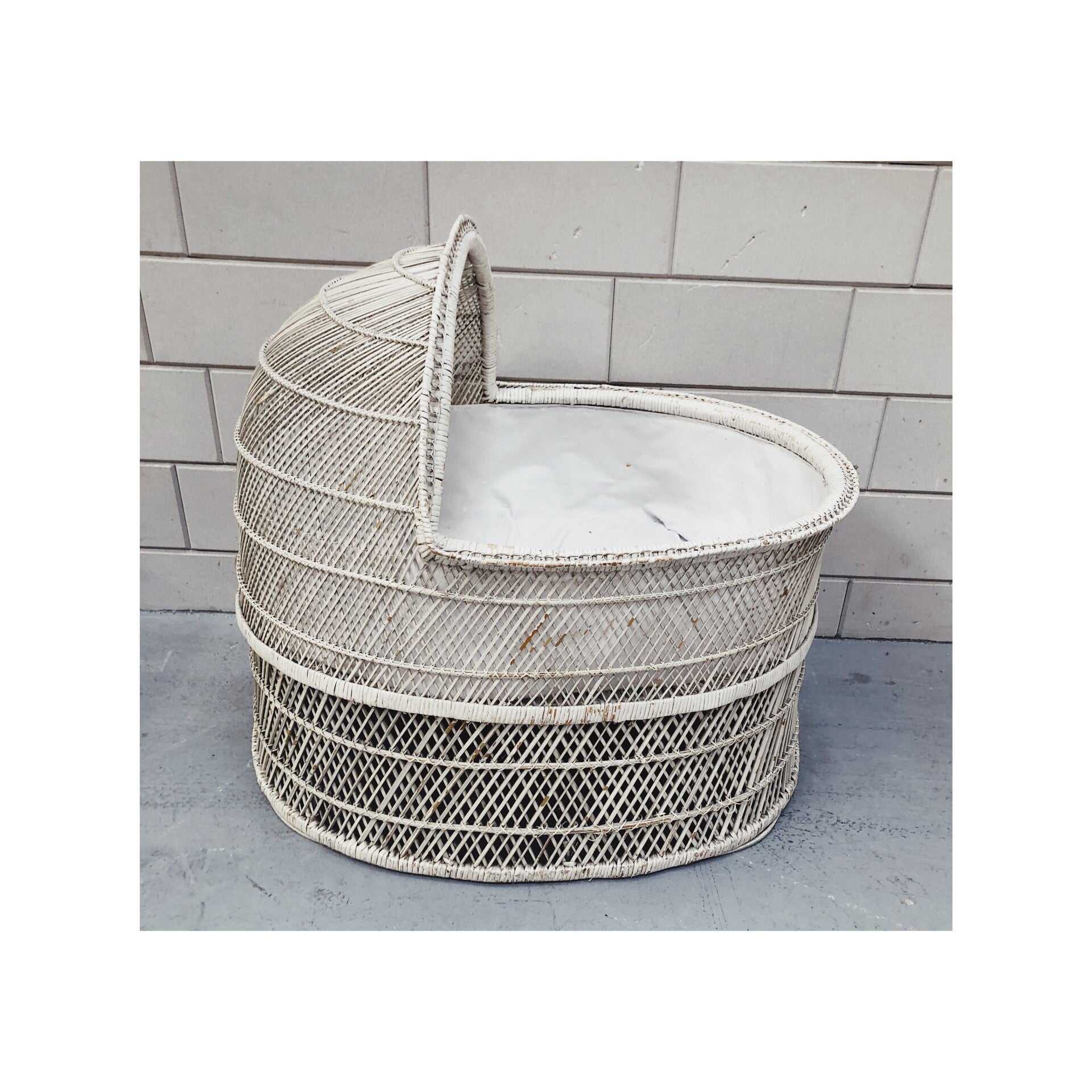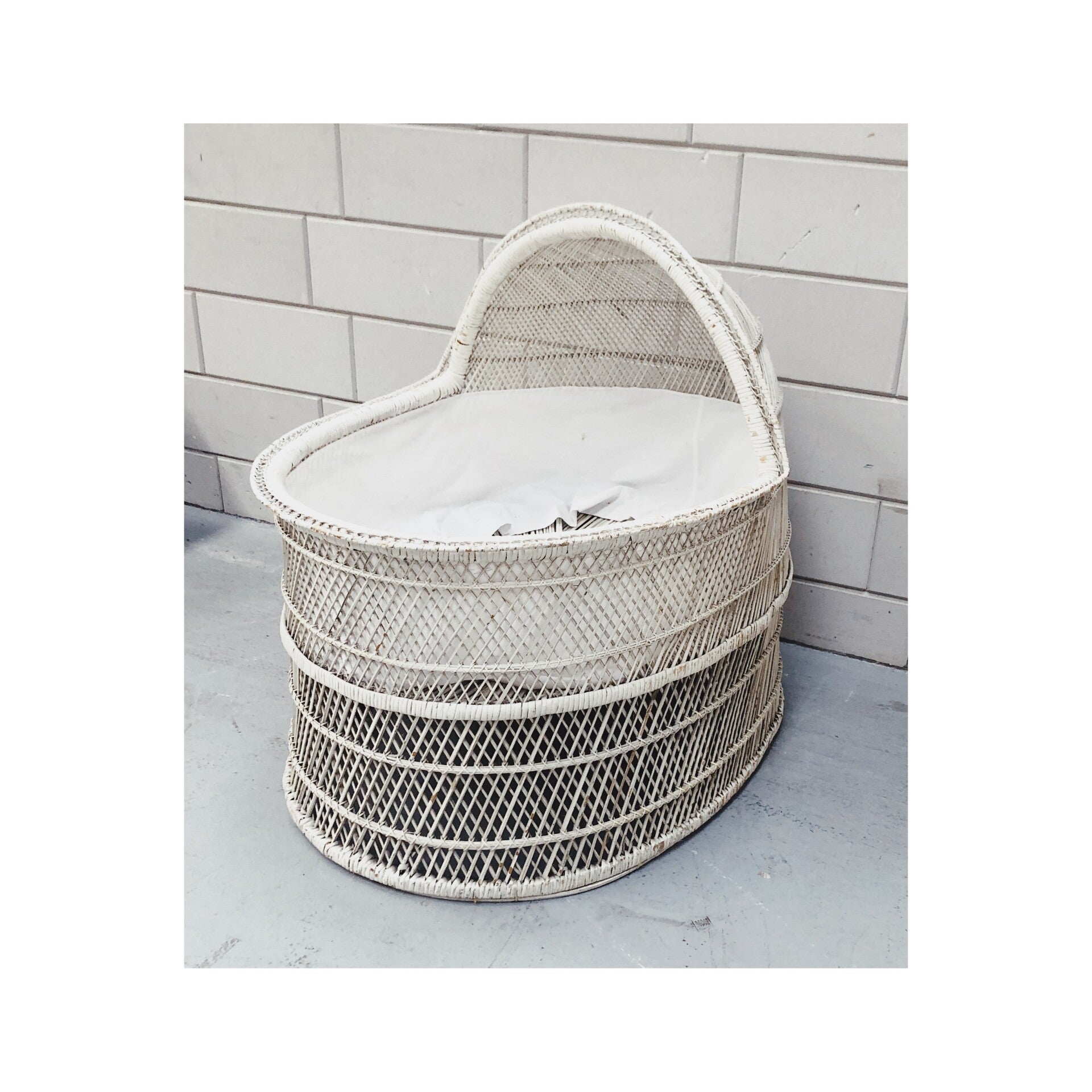 Deze wit-rotan vintage wieg maakt je duurzame babykamer helemaal af. De stevige wie heeft een grote kuip waar alleen nog een passend matrasje voor gemaakt moet worden. De wieg staat stevig op de grond en is in hele goede vintage conditie.