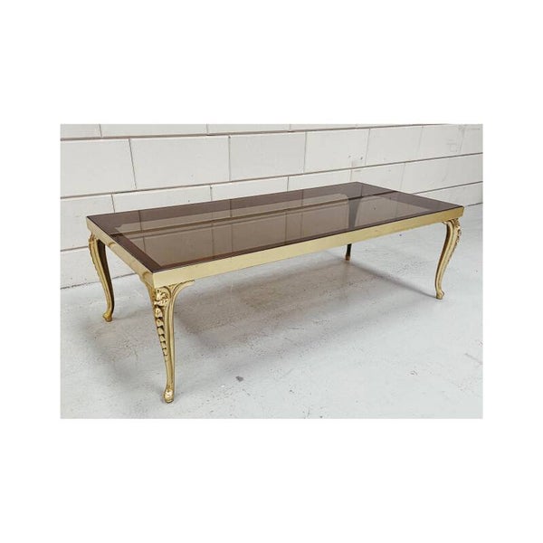 Deze rechthoekige, geelkopere salontafel is een echte blikvanger in je interieur. De tafel is voorzien van een zwaar rookglas dat los op het onderstel ligt. De tafel heeft prachtige sierlijke poten en een onderstel dat nog enorm glanst. De tafel is in hele goede conditie.