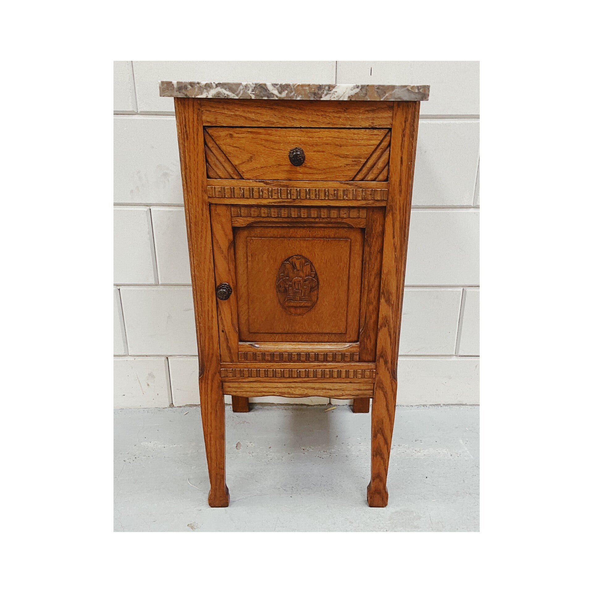 Prachtige vintage plantenkast met een mooi marmeren bovenblad. Het kastje is gemaakt van mooi warm hout en heeft een mooi slank postuur. De kast beschikt over een klepdeur en een lade. Het marmeren blad zit los op het bovenblad. Het kastje heeft hier en daar wat gebruikerssporen, maar is verder in een goede vintage staat!