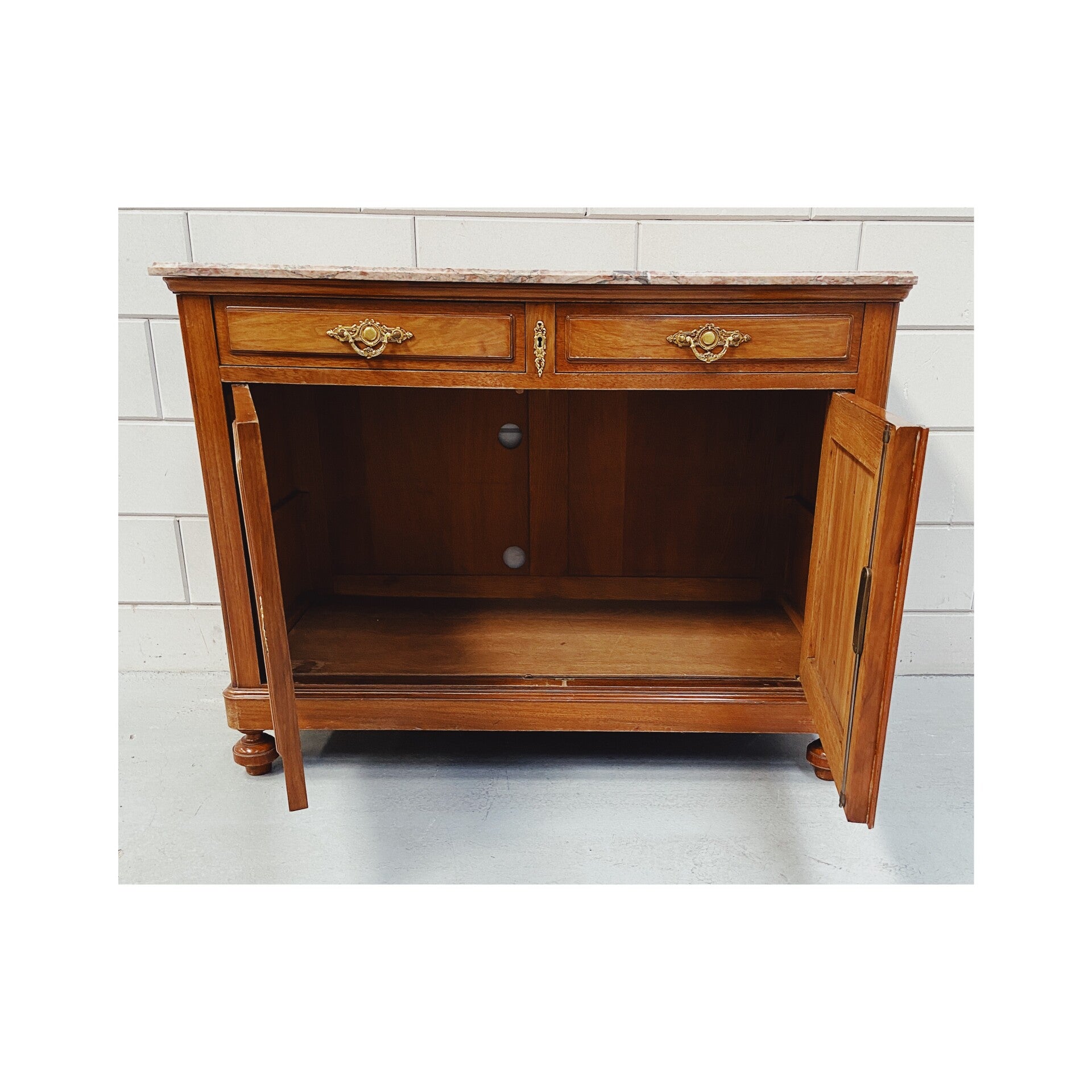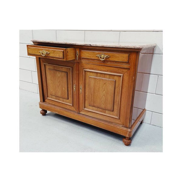 Dit dressoir/commode is een ideaal opbergmeubel met een prachtig uiterlijk. De kast is voorzien van een bovenblad van een mooi paars-bruin achtig marmer. Verder is het dressoir voorzien van twee laden, twee klepdeuren en een enorm veel opbergruimte. De kast heeft ook nog een extra plank die gemonteerd kan worden zodat de ruimte in tweëen verdeeld kan worden. De kast is in prima vintage conditie.