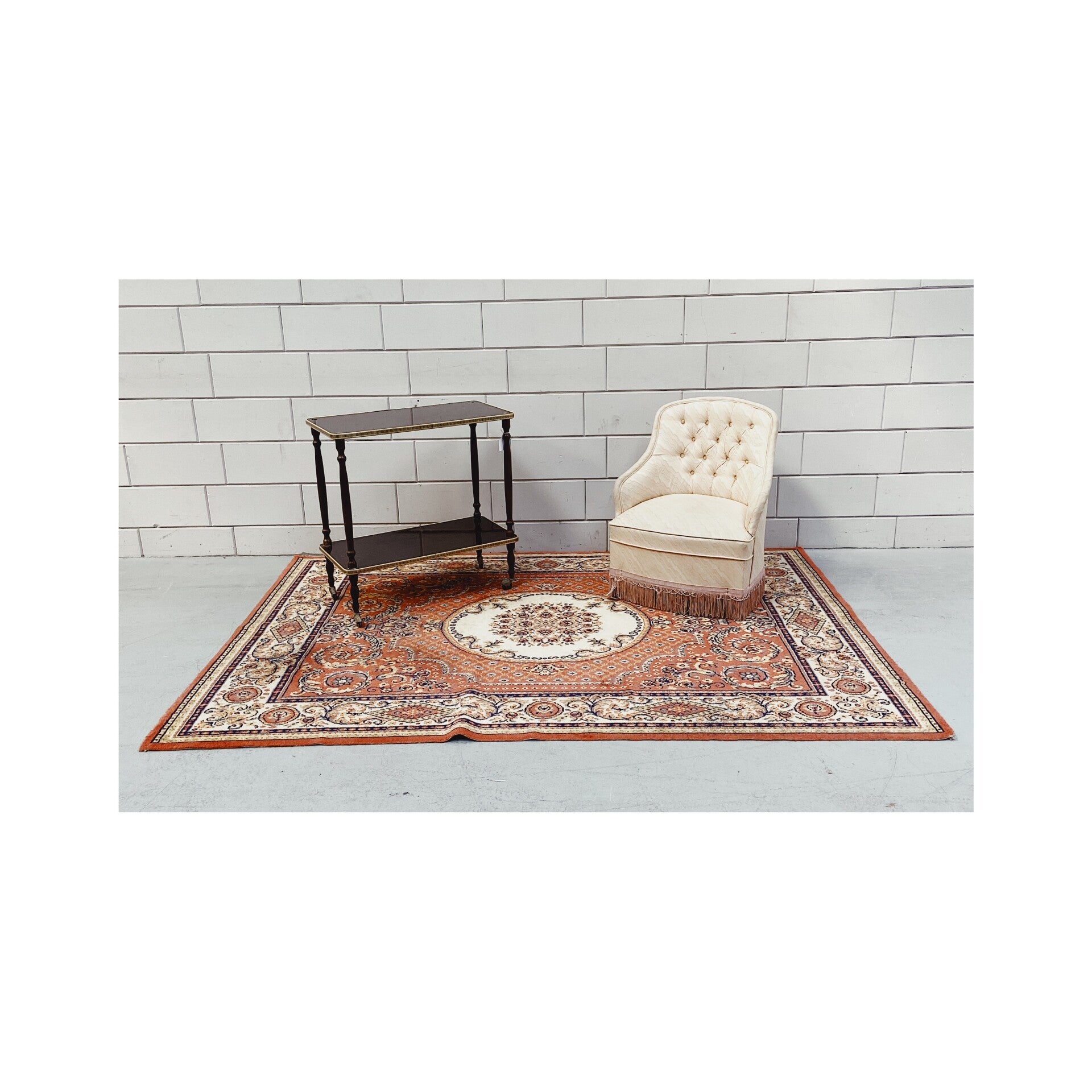 Oosters kleed, met mooie sierlijke vormen. Het tapijt heeft prachtige aardkleuren en is van een stevig wolsoort. Het tapijt heeft wat gebruikerssporen maar kan nog zeker een extra ronde mee.