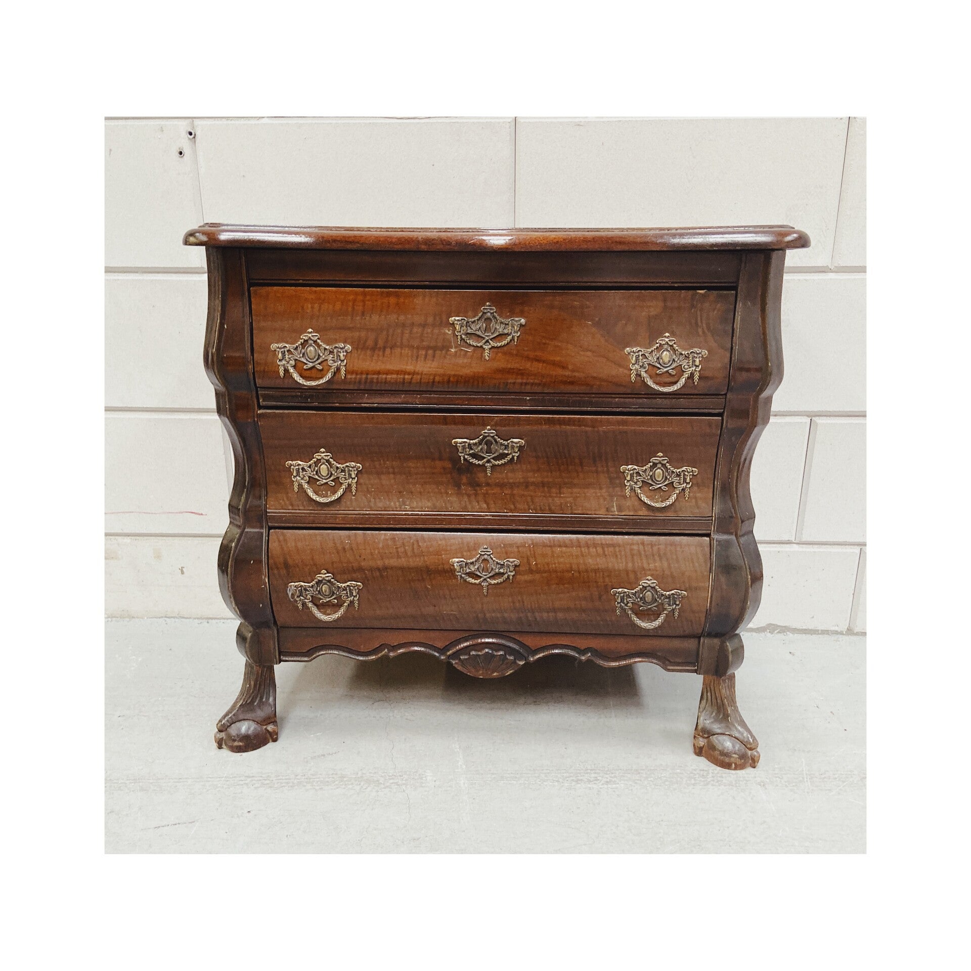 Mahonie buikkastje met mooie gouden hendels. Deze kast zal mooi staan in elke kamer van je huis. Op de kast zijn lichte gebruikerssporen te zien, deze zijn duidelijk te zien op de foto. Verder is deze mooie kast in een goede vintage staat!