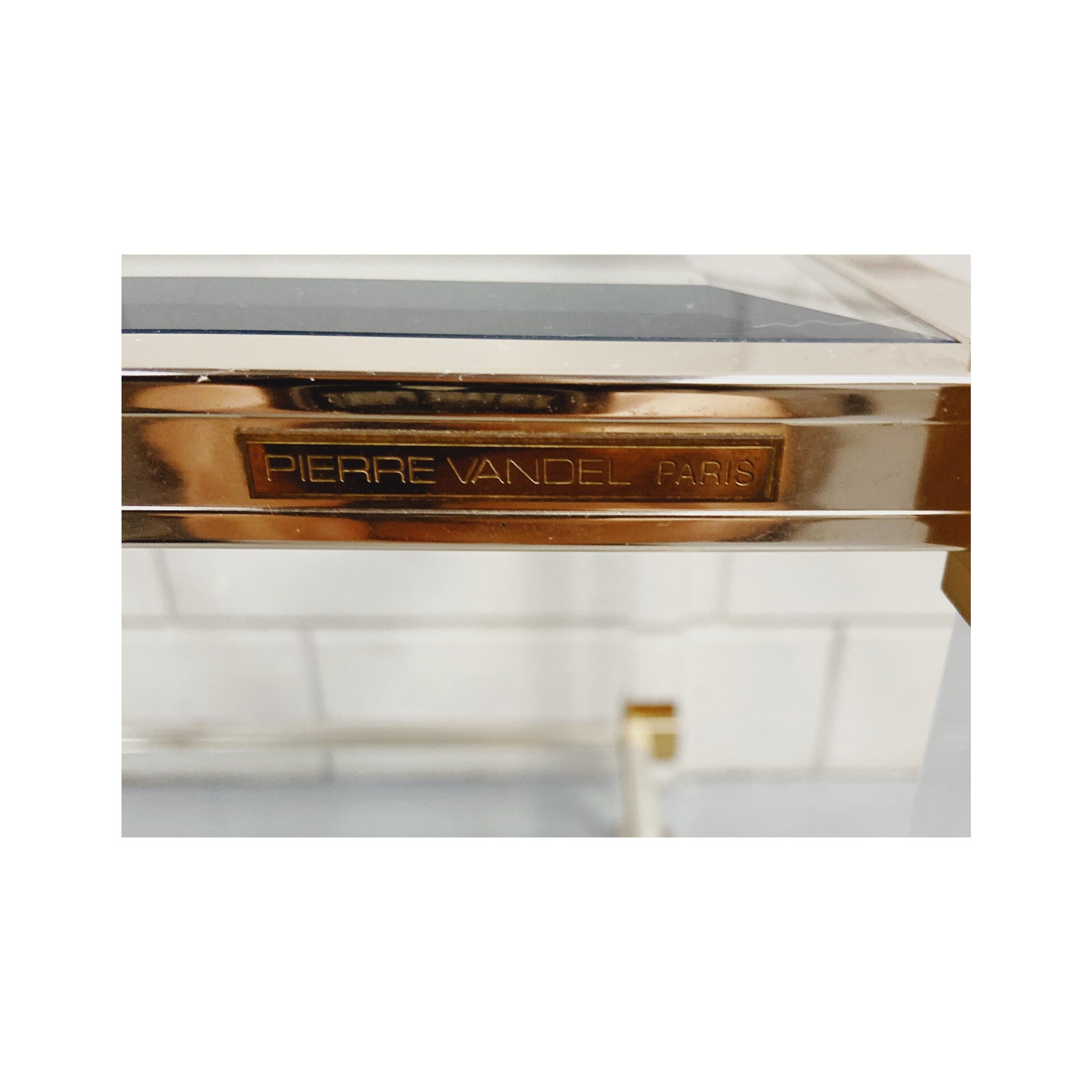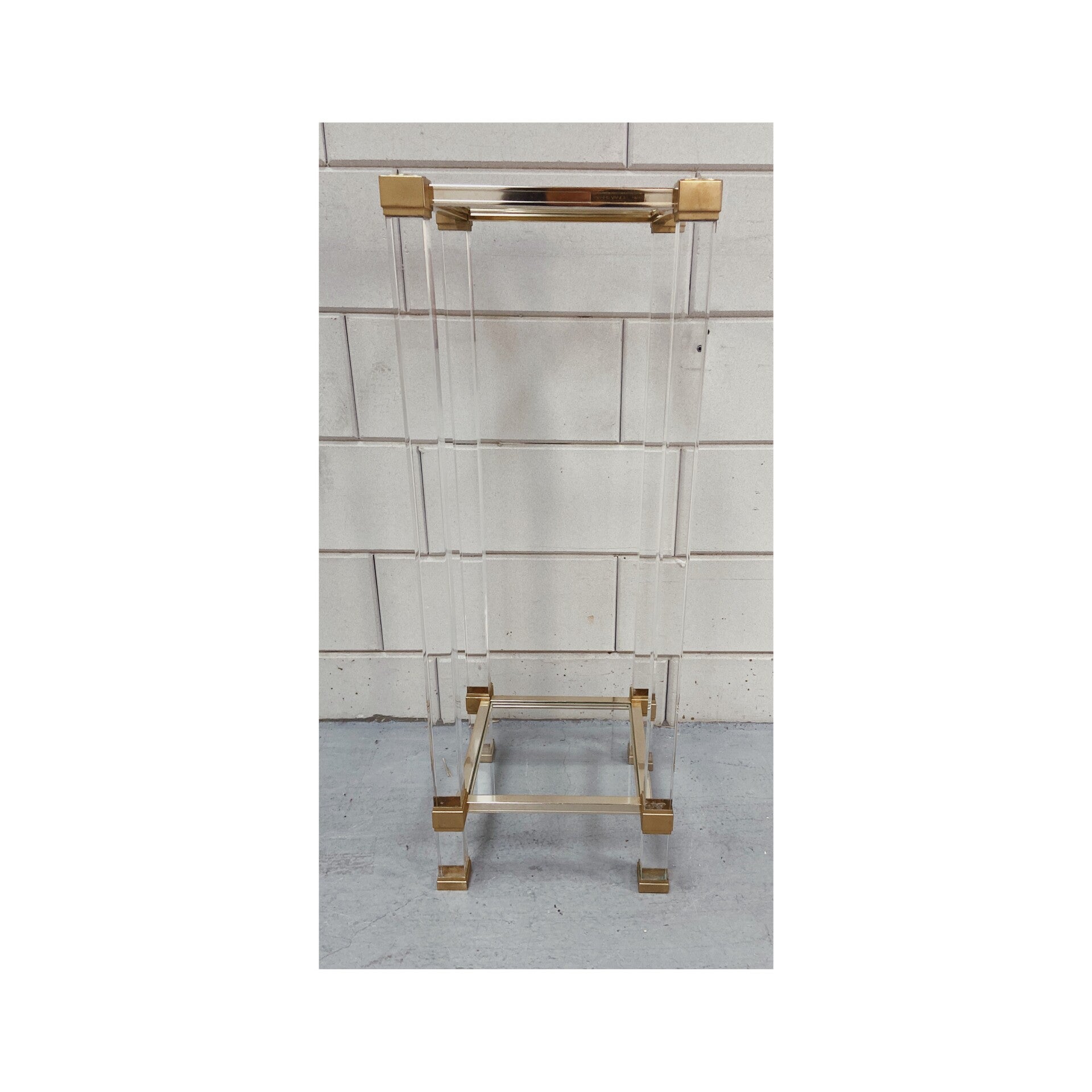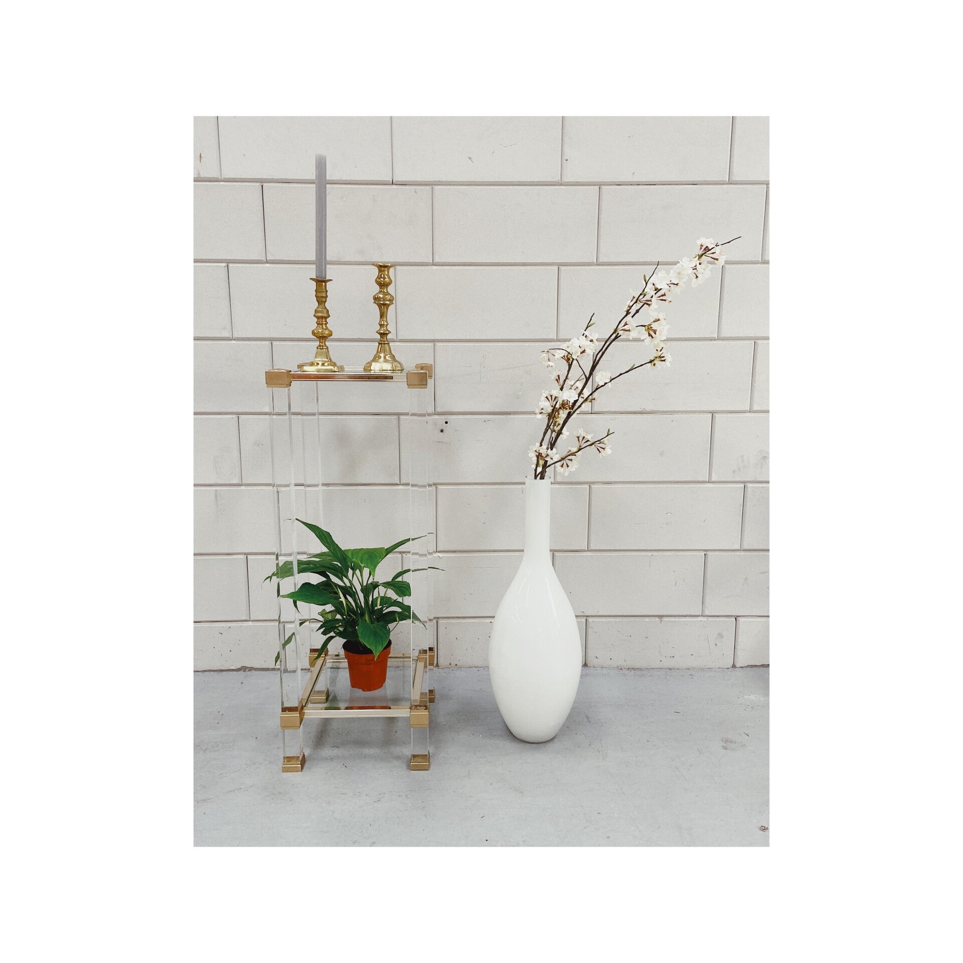 Deze prachtige transparante piëdestal is een prachtig item om je mooiste planten of beelden te showen. Pierre Vandel was een Franse interieur designer, die bekend werd door zijn luxe meubels die tussen 1970 en 1980 werden geproduceerd. Deze piëdestal is een combinatie van glas, messing en lucite (plexiglas). Deze dubbeldekker is in hele goede staat. Leuk te combineren met het Pierre Vandel salontafeltje.